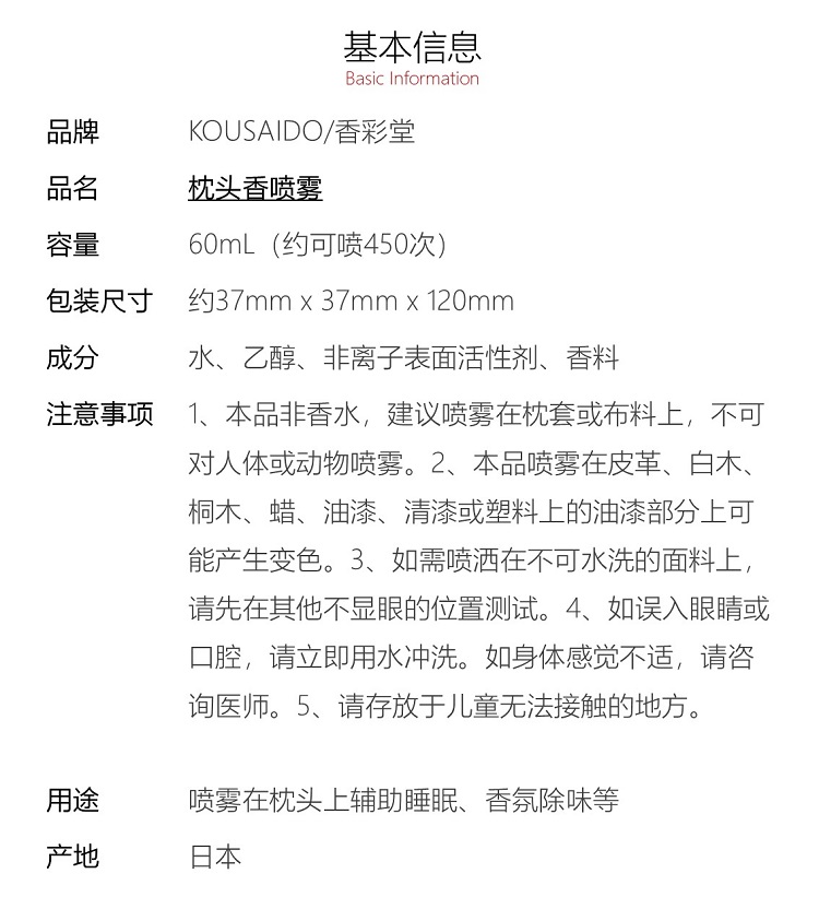 【KOUSAIDO】香彩堂枕头香喷雾 60ml