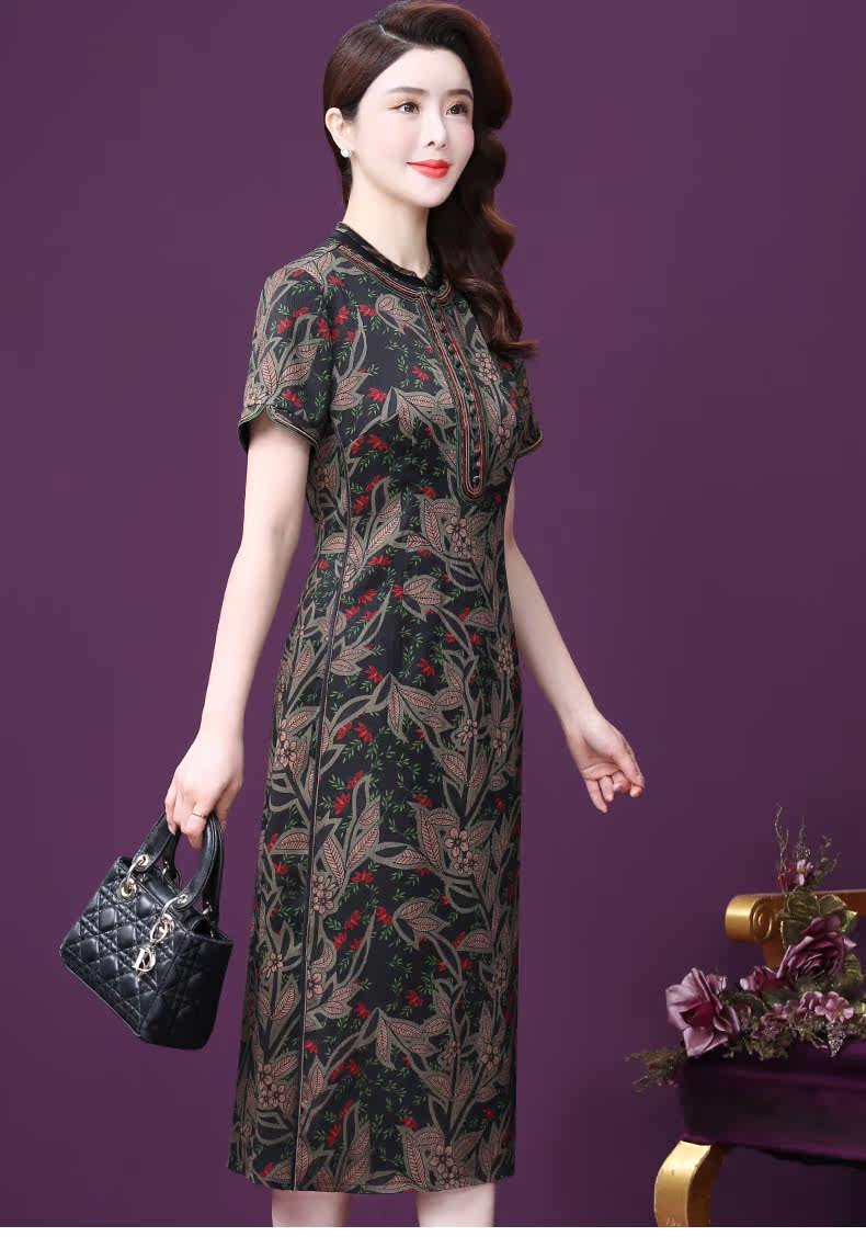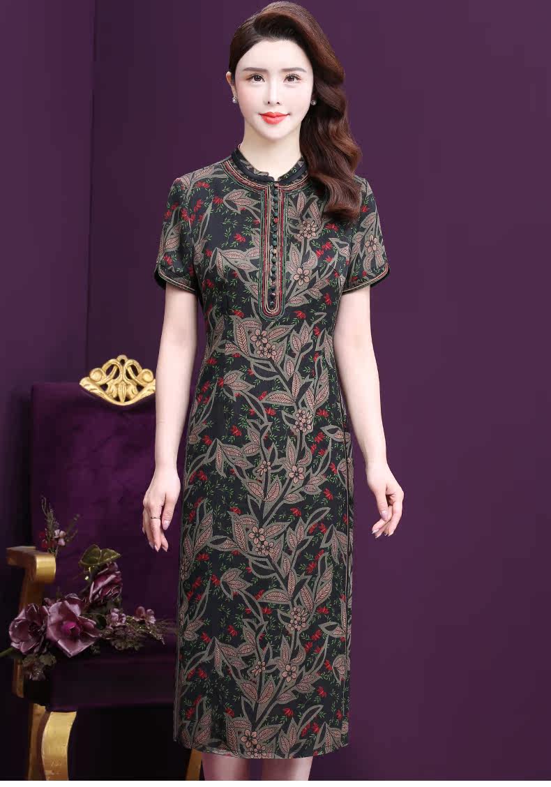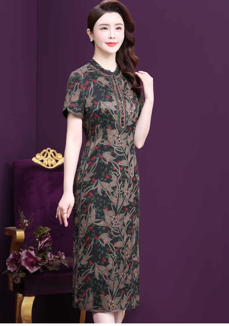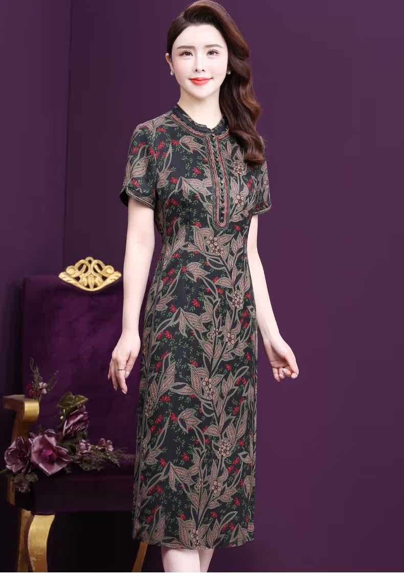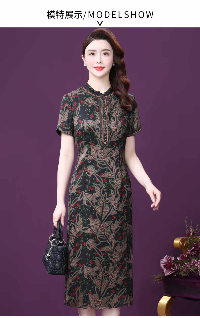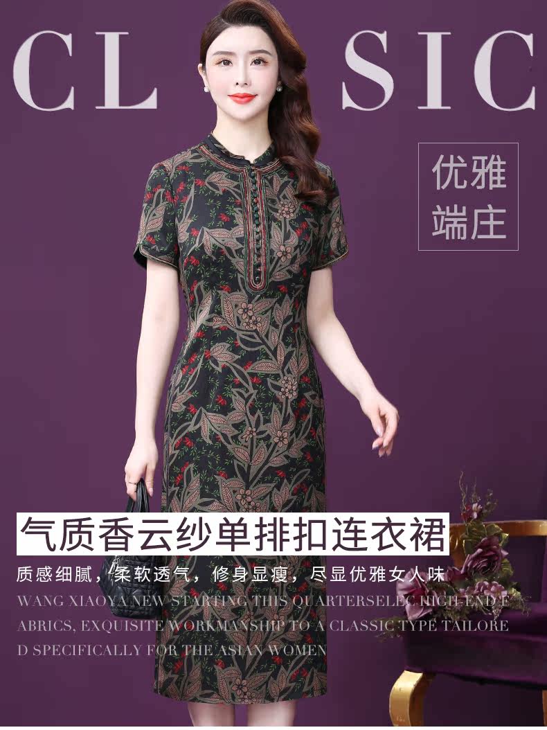 WXY-2937夏新款收腰减龄印花大码小立领真丝连衣裙
