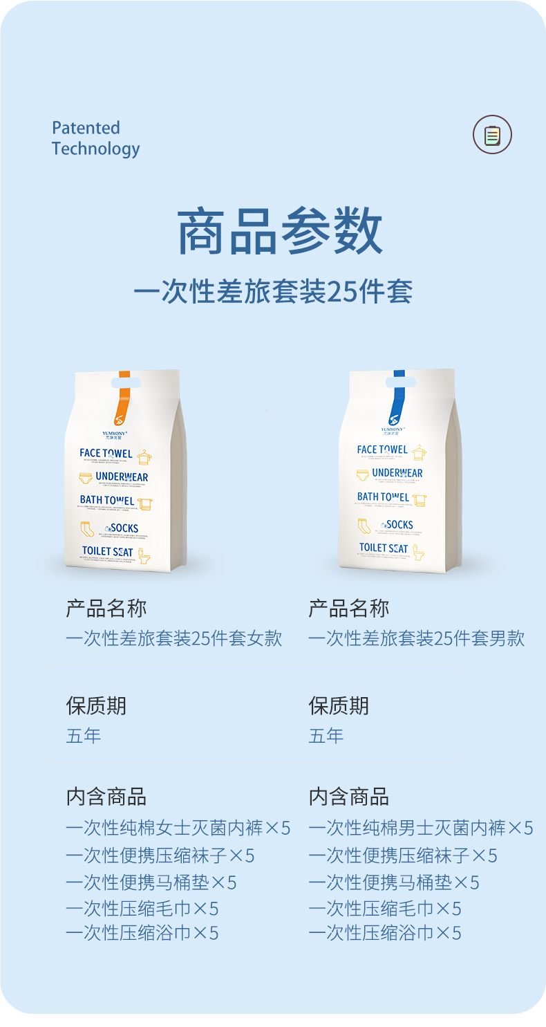 尤咪优妮旅行装 一次性内裤袜子洗脸巾马桶垫浴巾(一次性差旅套装25件套女款/男款)
