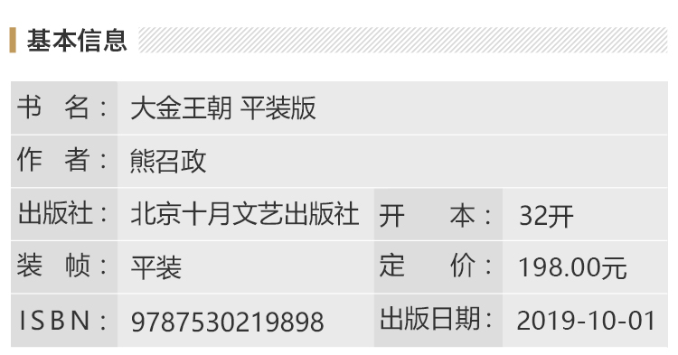 《大金王朝》是茅盾文学奖得主、《张居正》作者熊召政隆重推出的长篇历史小说巨著。作者潜心14年,在辽金故址行走6万里,研读上千万字史料,带领读者穿越千年,重回宋辽金争霸的大三国时代。