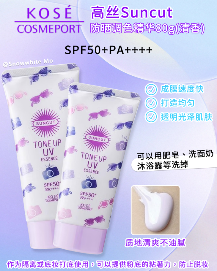 👑高丝Suncut 防晒调色精华80g(清香)SPF50+PA++++ 👍作为隔离或底妆打底使用,可以提供粉底的粘着力,防止脱妆。 💎质地清爽不油腻,流动性和延展性都非常好✅ 💥成膜速度快,打造均匀、透明光泽肌肤✨ 🔆SPF50+PA++++脸部和身体都能用👩 💦可以用肥皂、洗面奶、沐浴露等洗掉🛁