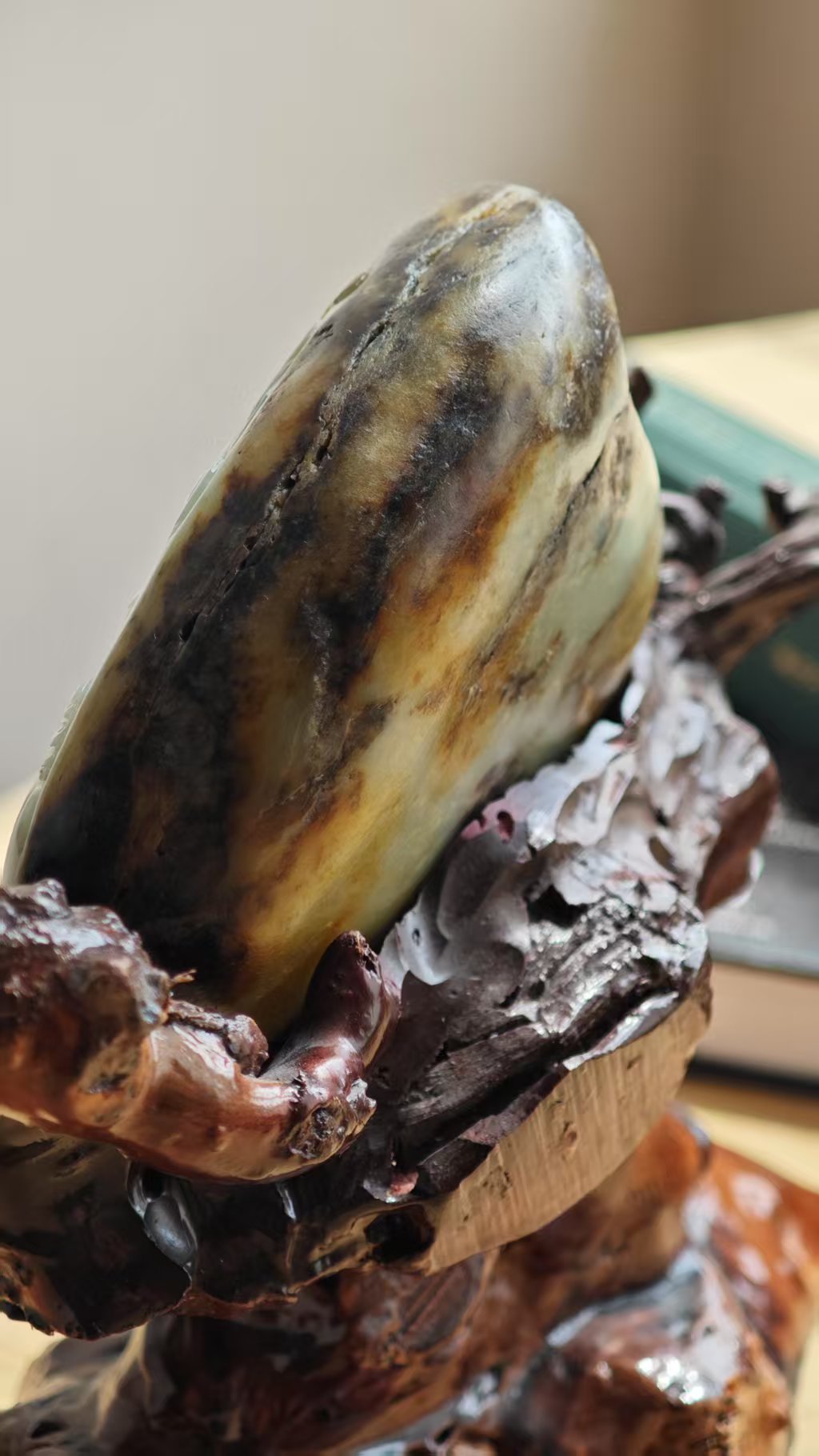 它的油细温润的质地,浑然天成的皮色,