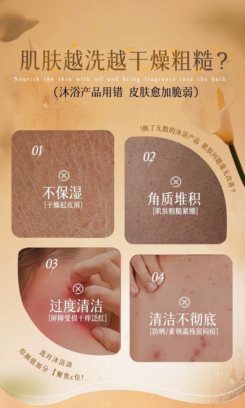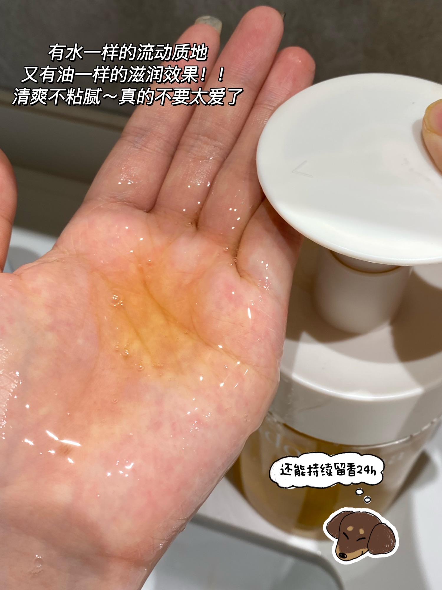 随便一掐都能出水的程度皮肤自带光泽感~。每次用它洗澡都像在做深层Spa!软乎乎的好舒服! 水一冲洗干干净净不会像普通的沐浴油一样假滑紧绷。用了这个沐浴油就是人间水蜜桃!!