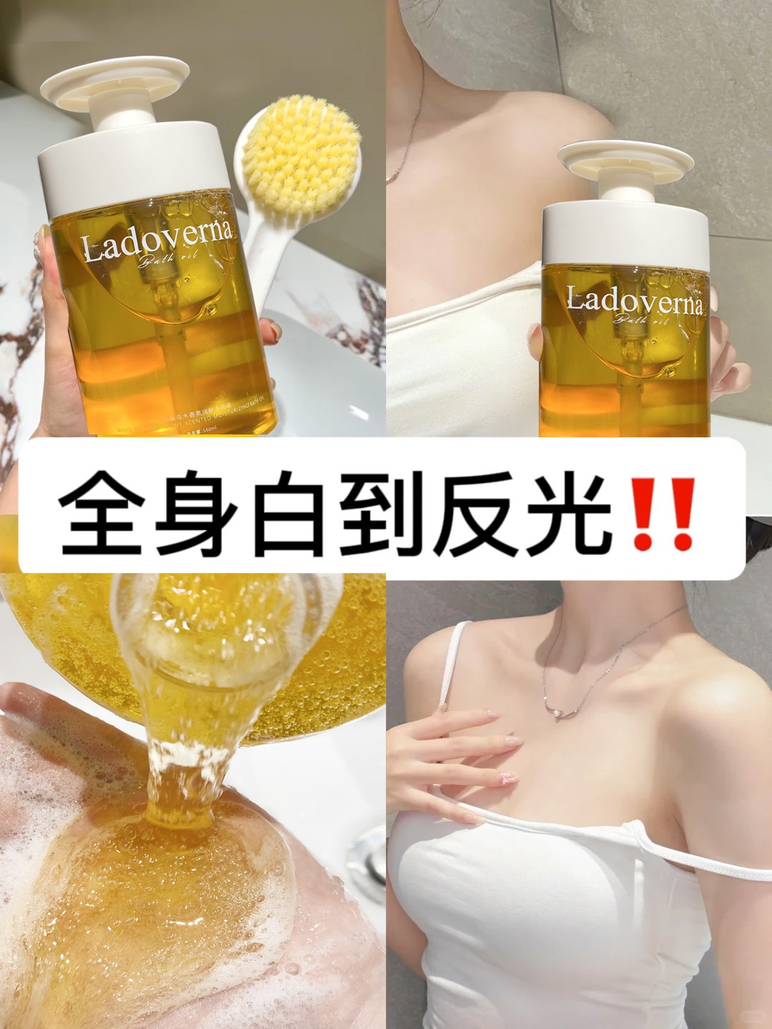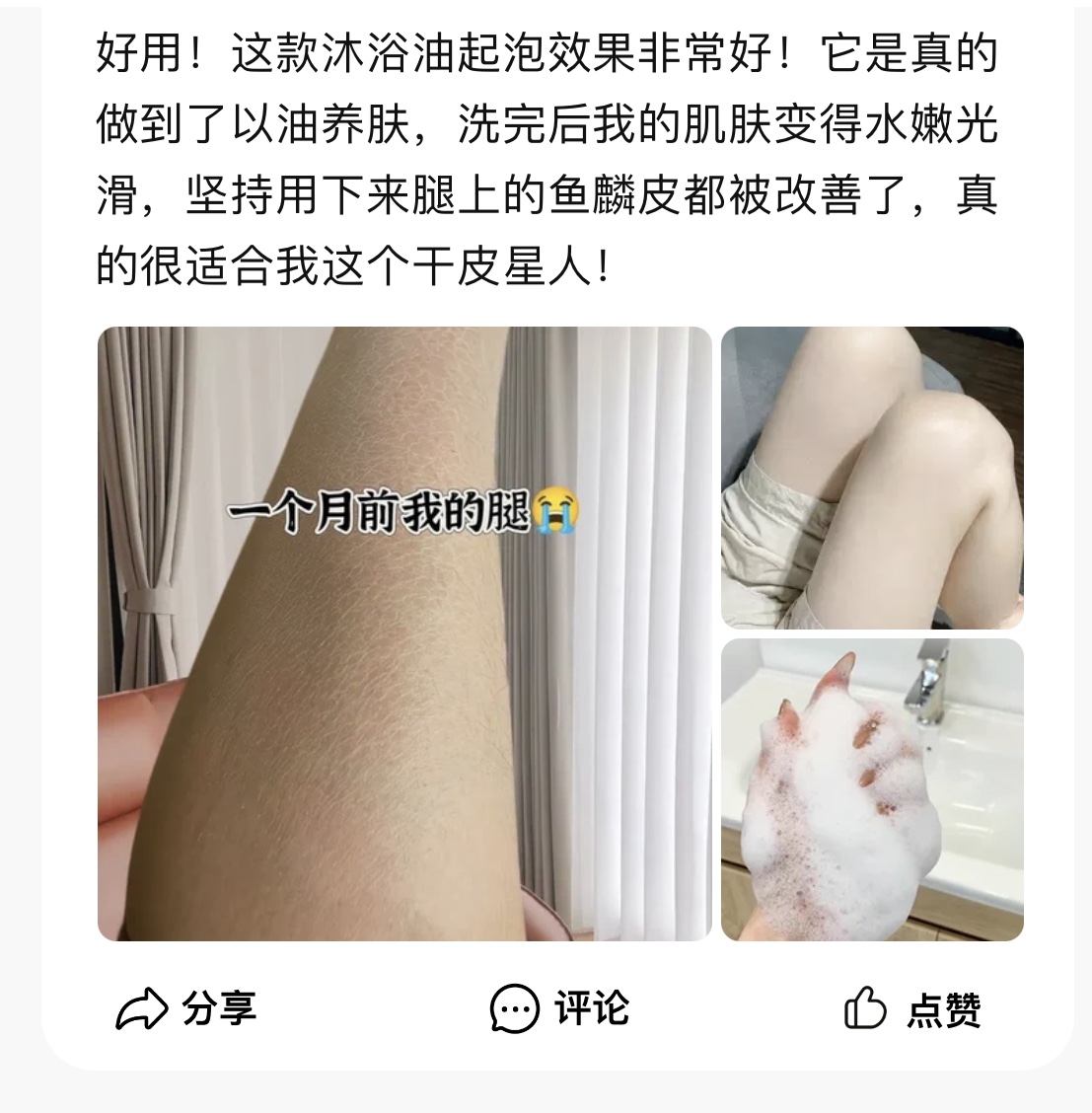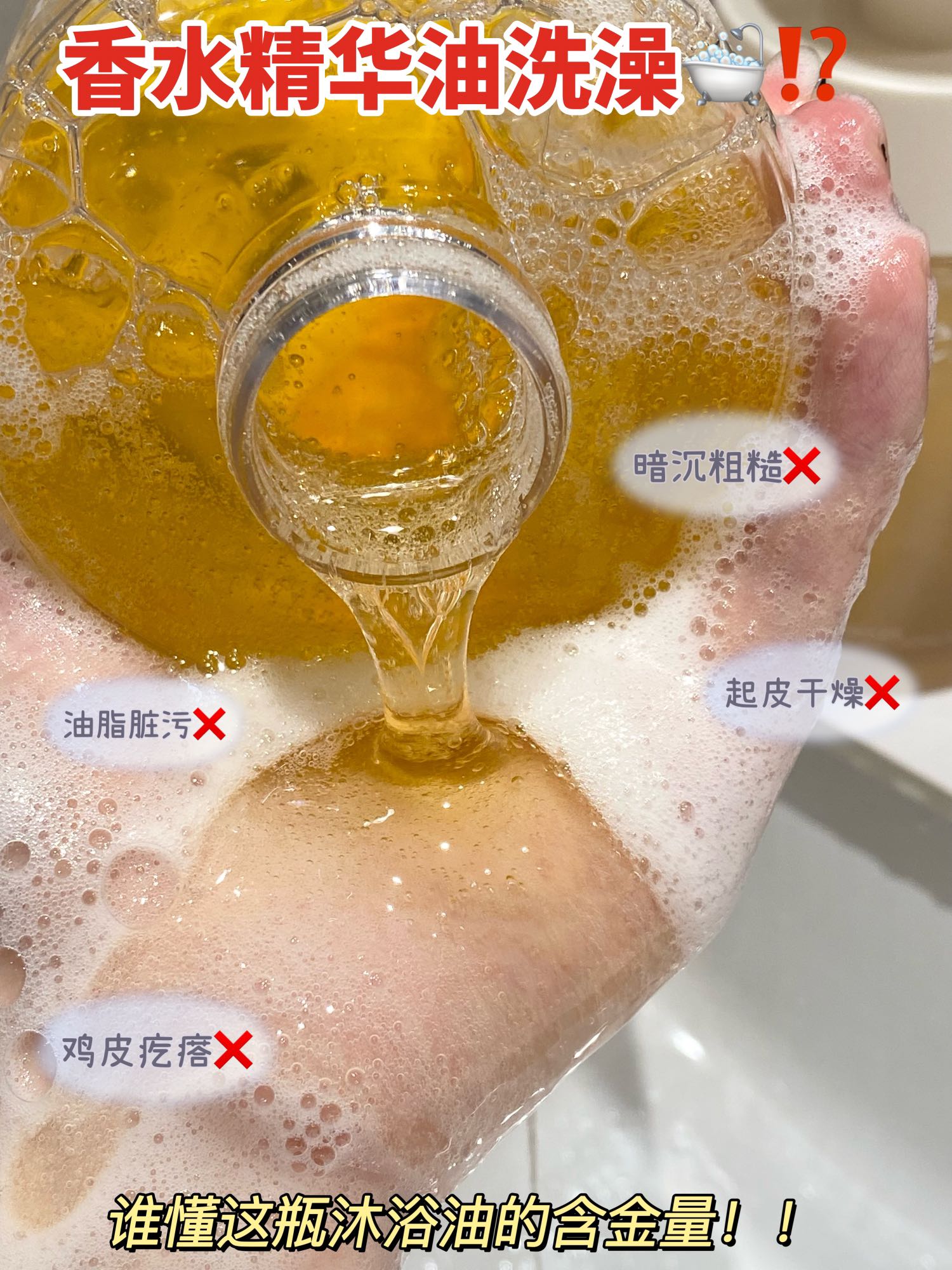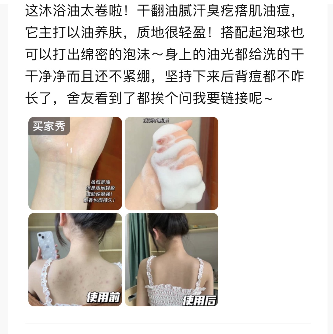 👇就是直接打湿自己、沐浴油抹身上打圈抹均匀像膝盖手肘等粗糙的地方多打圈几下软化老废角质 或者可以用结合刷子沐浴球使用~ 泡沫柔软绵密,洗完全身上下摸起来滑溜溜的,关键他不是油没洗干净的假滑!而是那种真正好皮肤的嫩滑!秋冬天皮肤干燥起皮没有光泽感的姐妹快去试试!干皮掉屑姐妹集合🙋答应我一定要用沐浴油! 皮肤嫩滑到能做滑滑梯那种!!!