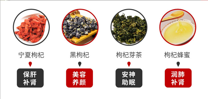 黑枸杞——黑枸杞是迄今为止发现原花青素含量最高的植物,远超蓝莓成为新一代“花青素之王”,而花青素是最有效的天然抗自由基、抗氧化剂,其抗氧化性是VC的20倍、VE的50倍,因此具有很好的美容养颜抗衰老作用,是女性美容养颜佳品,另外,花青素对睡眠、眼睛以及预防癌症方面都有很大的帮助。
