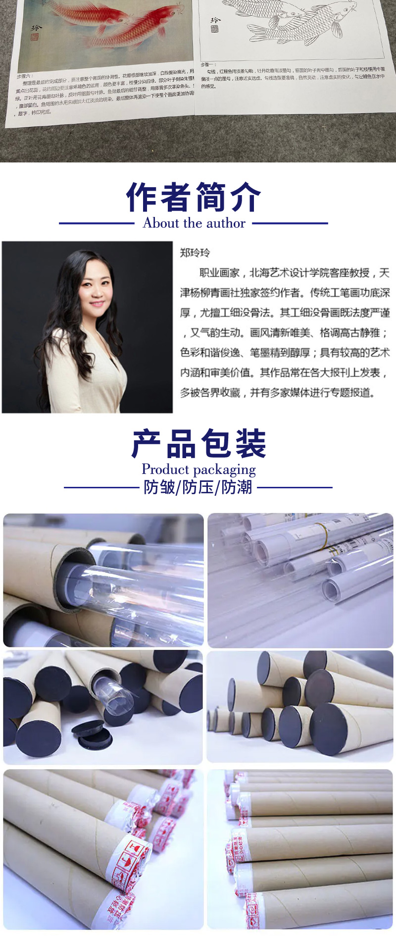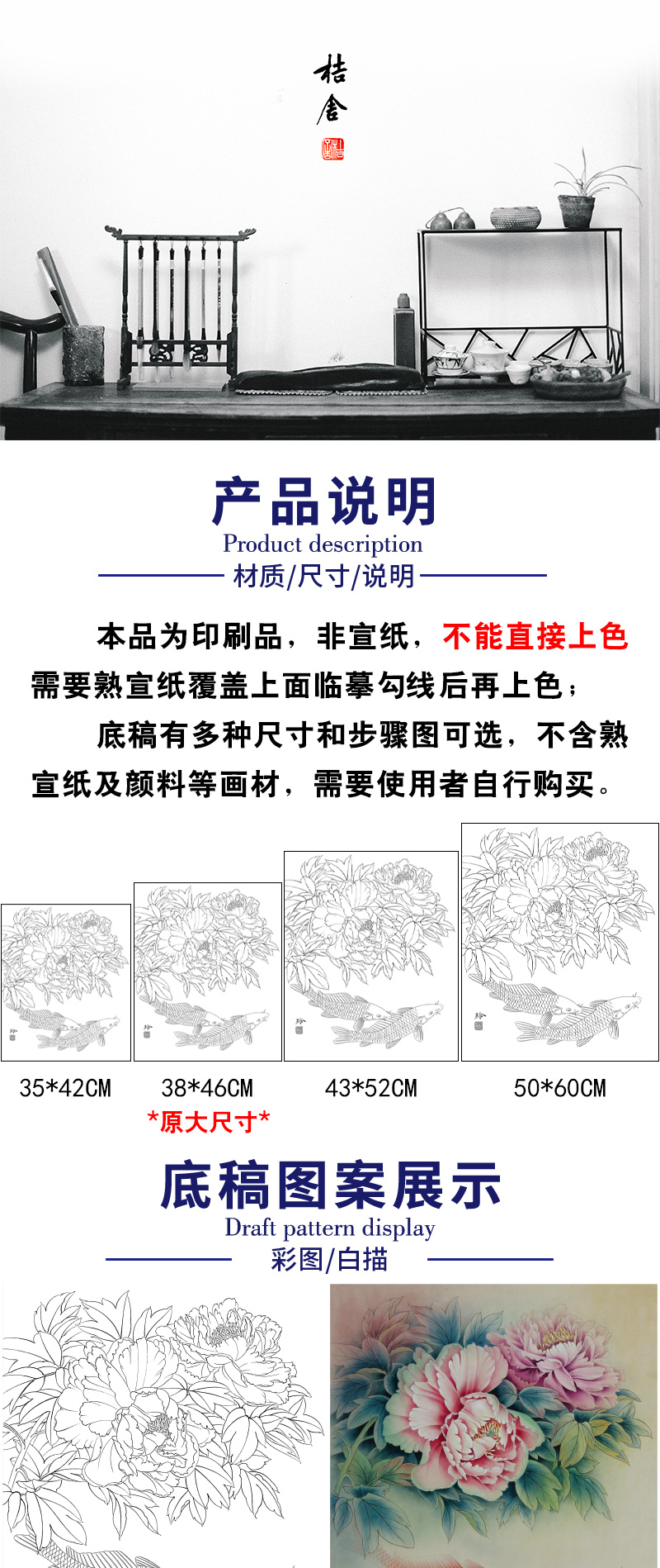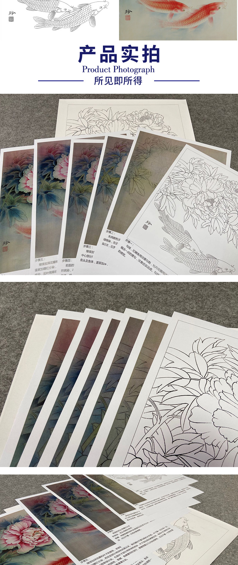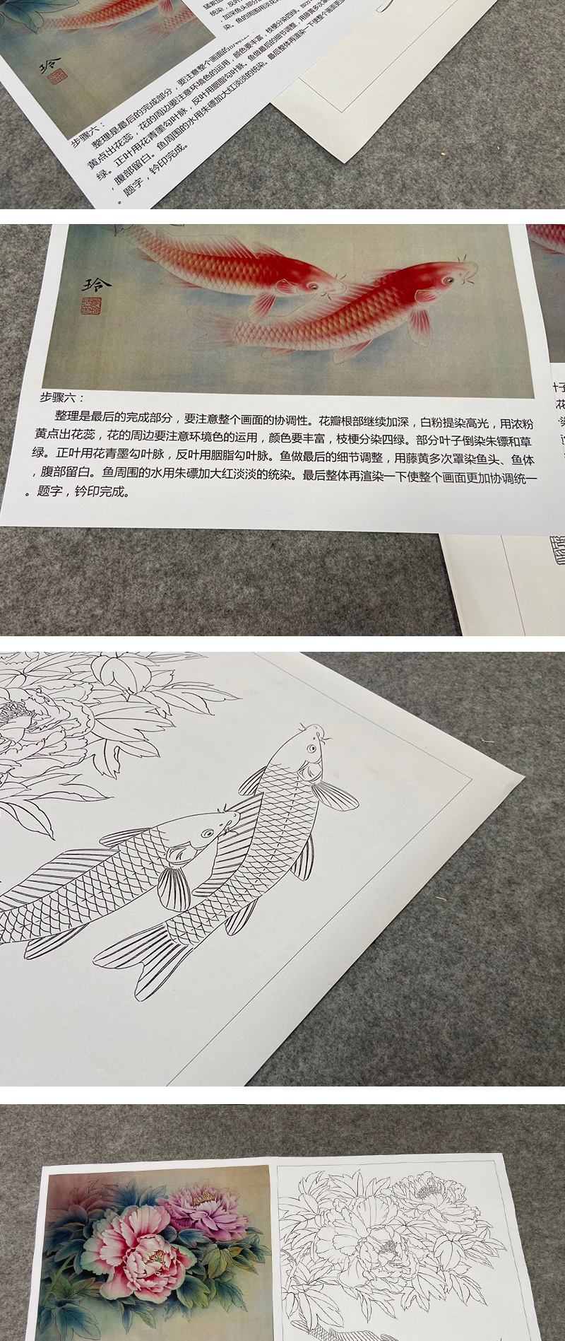 【有步骤、大彩图】郑玲玲工笔画白描底稿《福贵有鲤》牡丹鲤鱼初学者临摹花鸟线稿ZL46