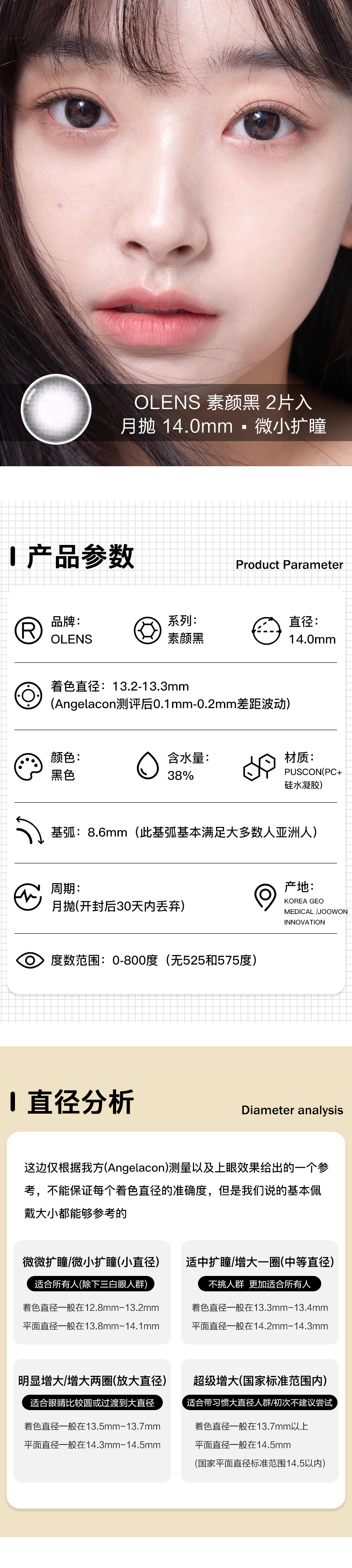 OLENS / 素颜黑 / 2片入 / 月抛美瞳 / 14.0mm / 微小扩瞳心机妈生提亮黑