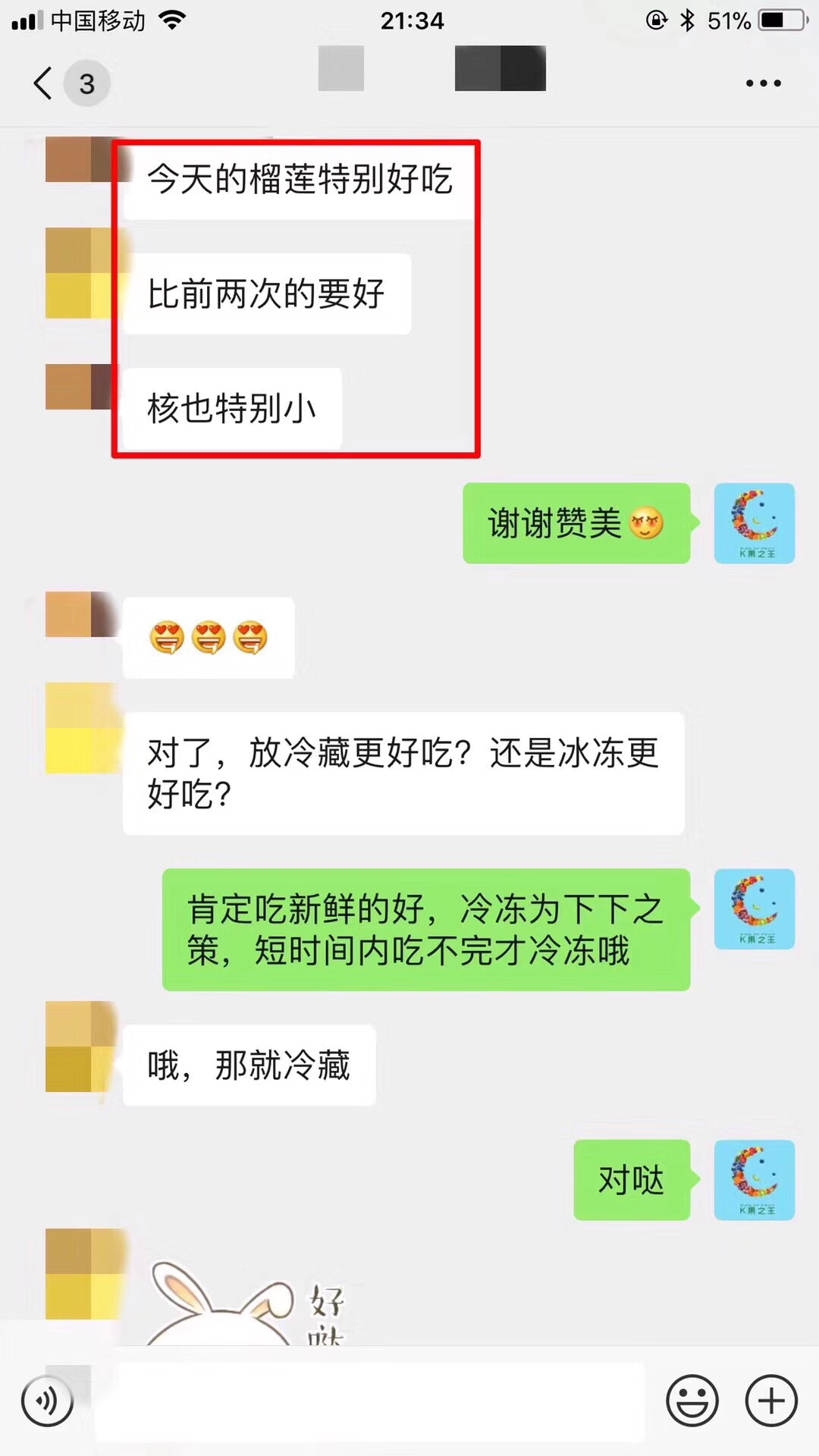 收到榴莲后,拆开真空包装,放常温回温2-3小时就可以开果吃了,如果没来得及开果吃,必须将榴莲放于冰箱冷冻室中!