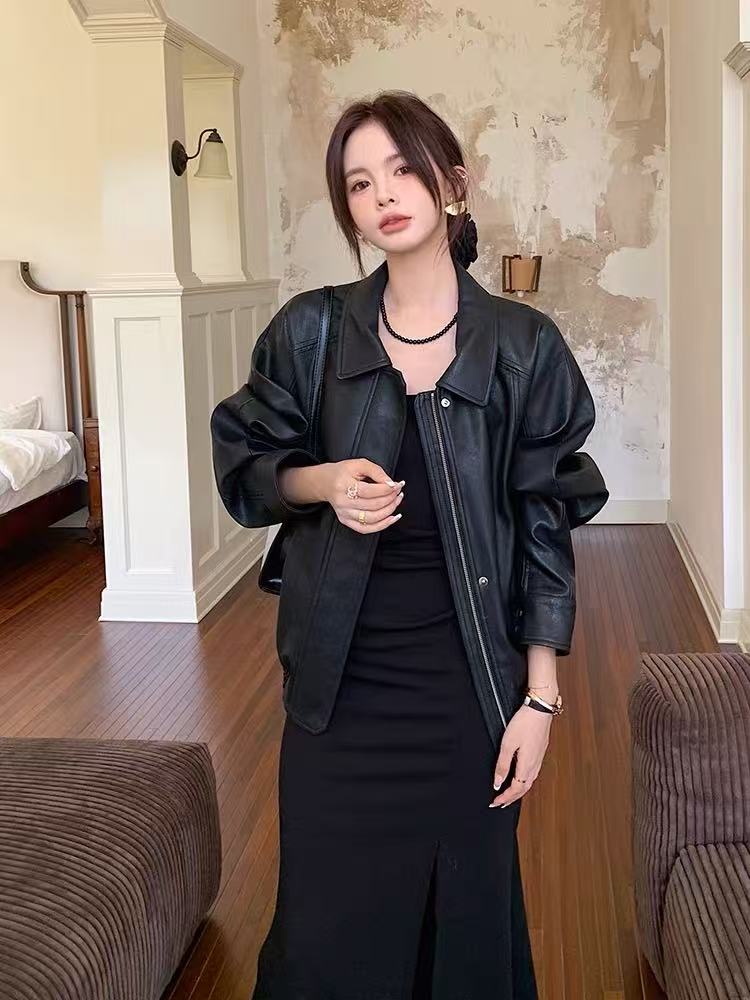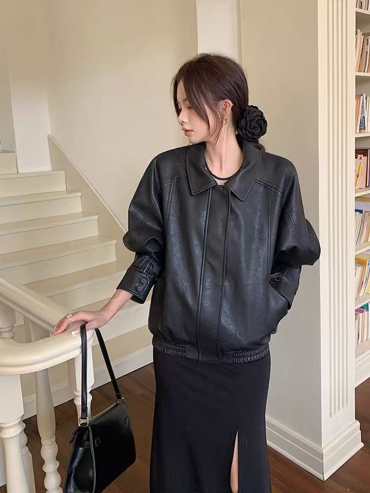 原价300+【秋上新】设计师休闲机车风高级感翻领皮衣PU外套-喜出