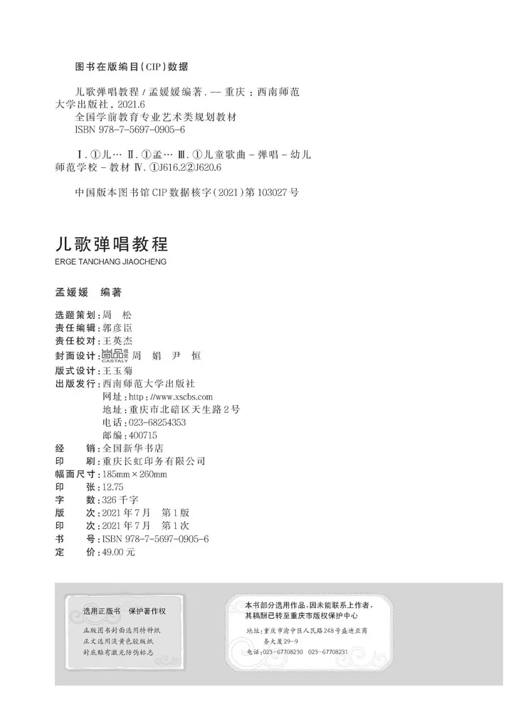 *书名:儿歌弹唱教程 | *ISBN:978-7-5697-0905-6 |