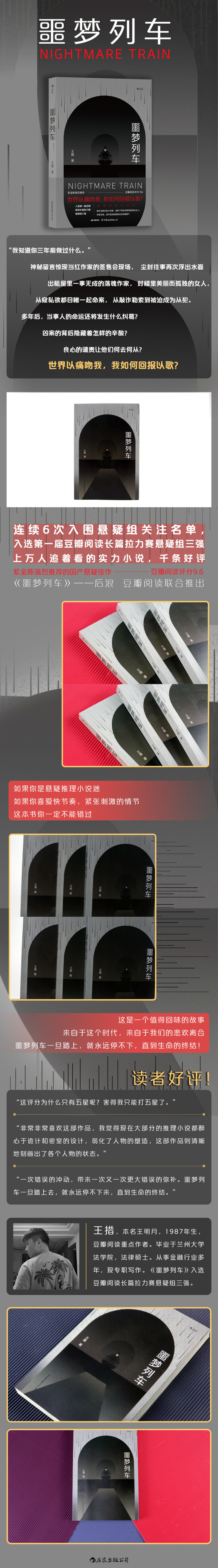 王措,本名王明月,1987年生,豆瓣阅读重点作者。毕业于兰州大学法学院,法律硕士。从事金融行业多年,现专职写作。《噩梦列车》入选豆瓣阅读长篇拉力赛悬疑组三强。