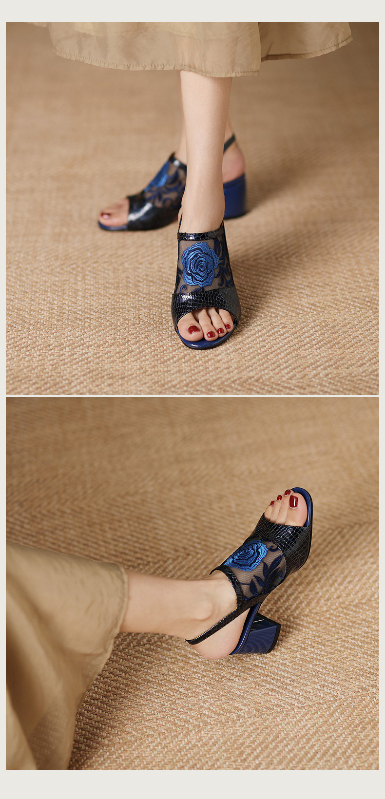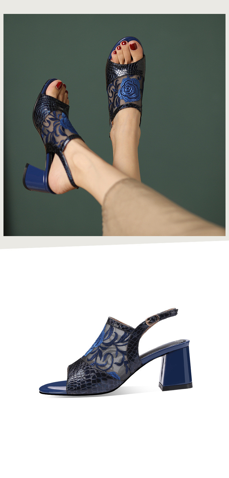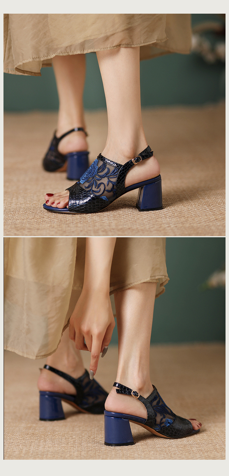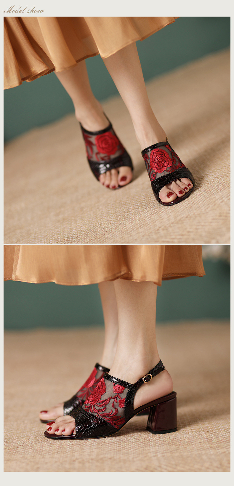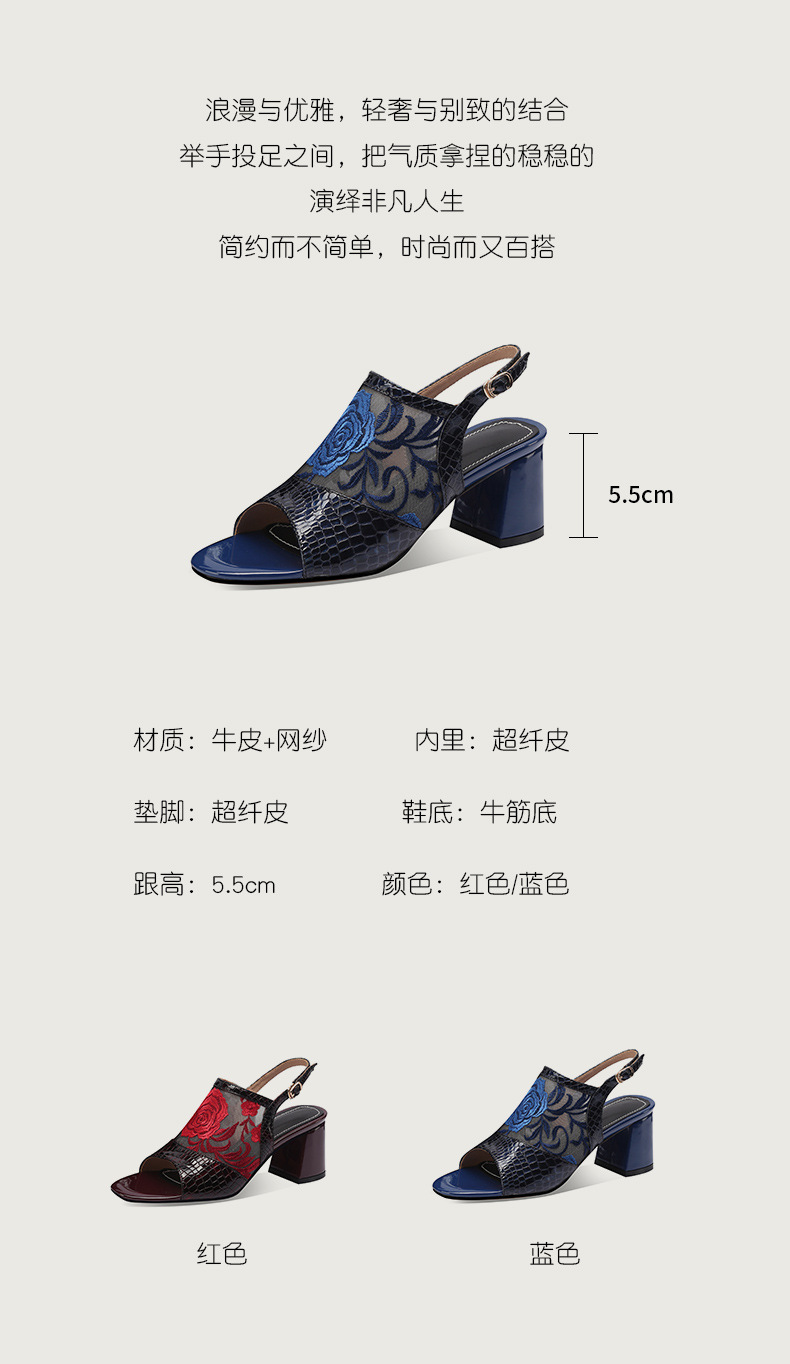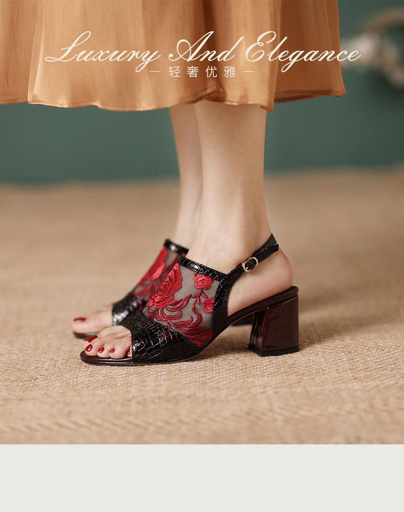 网纱绣花粗跟尖头,一字扣中跟鱼嘴民族风旗袍凉鞋JJ-C2010