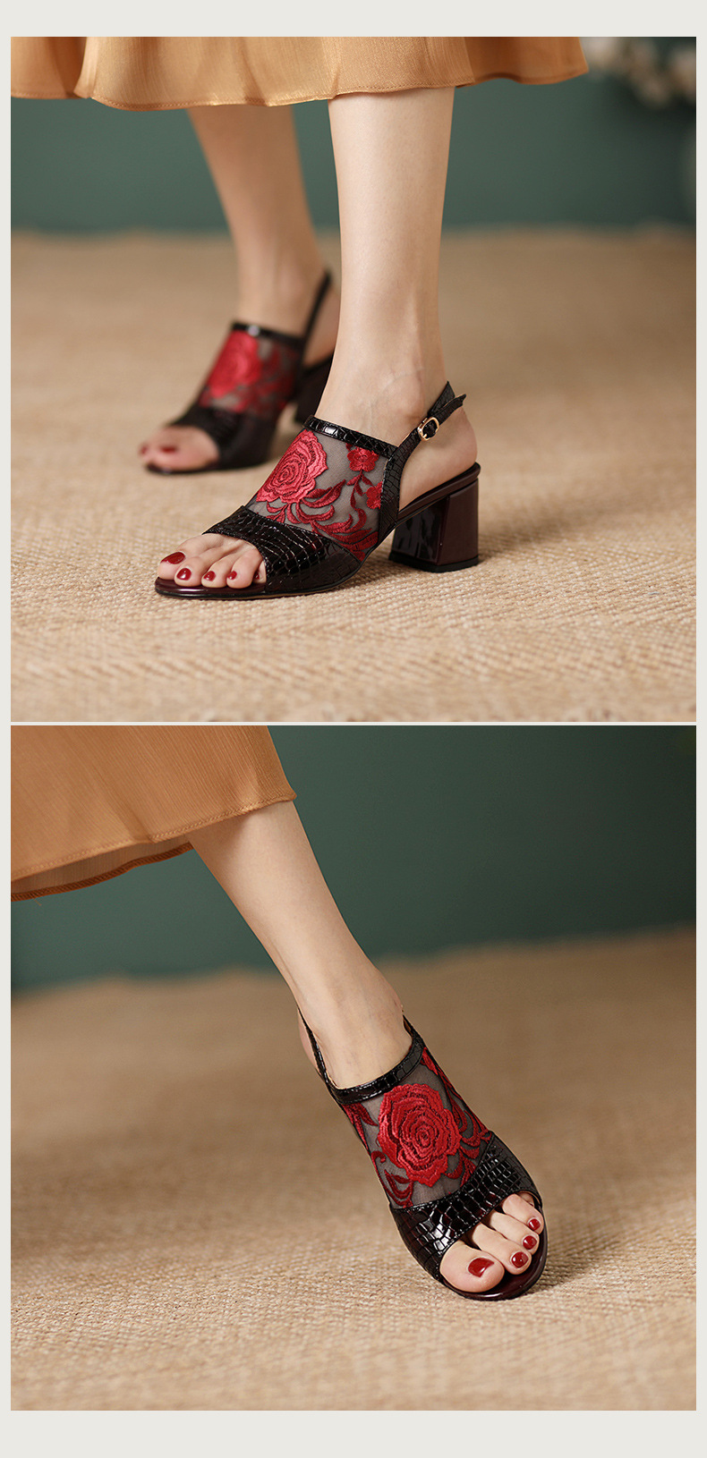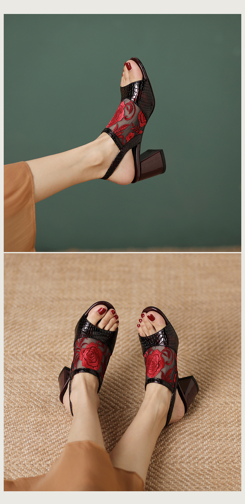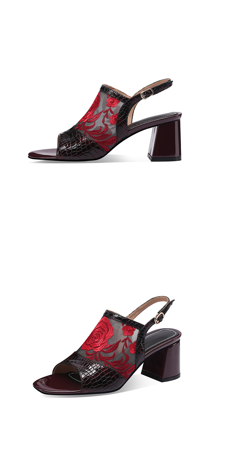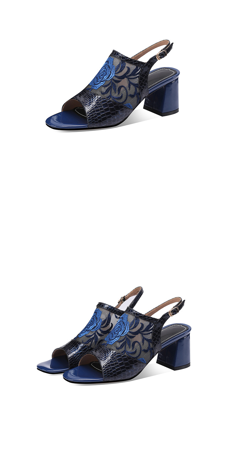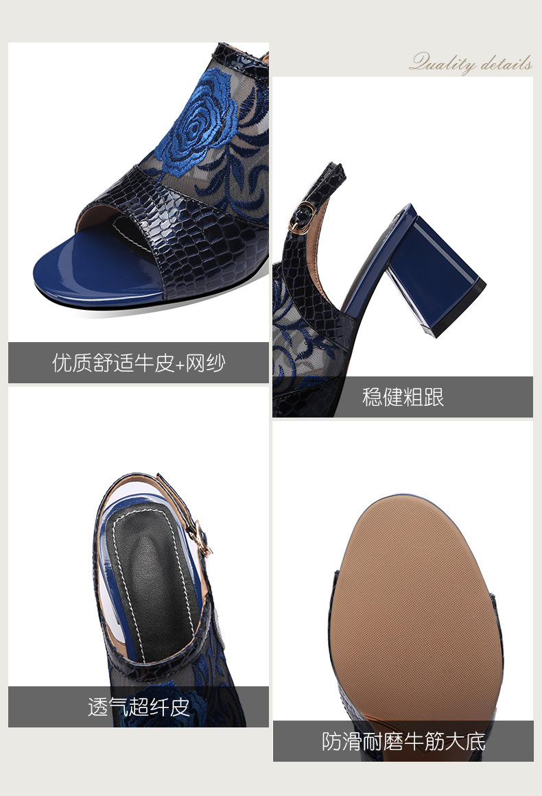 网纱绣花粗跟尖头,一字扣中跟鱼嘴民族风旗袍凉鞋JJ-C2010