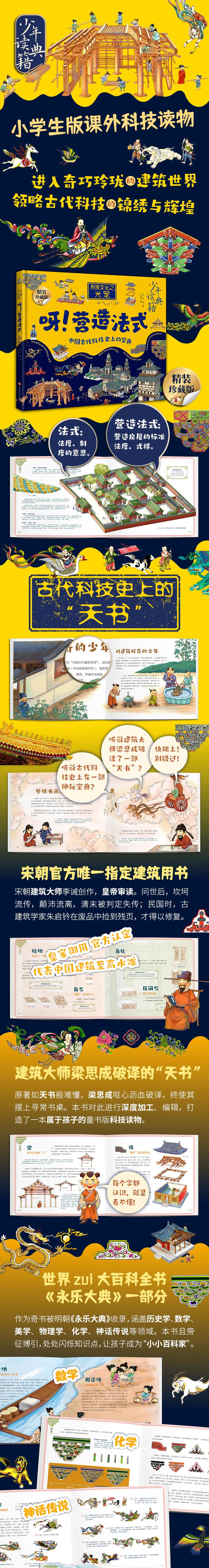 《营造法式》是由宋朝建筑家李诫撰写的建筑学著作,书中少见地集合了中国建筑科技的精粹,对后世产生了深远影响,但在流传过程中,颠沛流离,到清末时,已被判定失传。民国时,古建筑学家朱启钤在废品中偶然捡到《营造法式》破旧不堪的残页,开始修复古籍,《营造法式》自此得见天日。梁启超立即将《营造法式》分享给儿子——建筑大师梁思成。梁思成惊喜自豪不已,赞之为"吾族文化之光宠"。由于此书如天书一样难懂,梁思成花费了一生时间才完成对它的注解。本书《呀!营造法式》撷取前辈们呕心沥血专研的建筑科技精华,馈赠给小读者,全书文字浅显易懂,生动简洁,进行了有趣的知识拓展,让小读者能够轻松阅读,感受古代科技的辉煌与发达,收获更多的传统文化知识。书中选用了大量宋朝建筑师李诫手绘的图片,并进行上色,又另外手绘了一些人物漫画等插图,使小读者能够更深入地理解这部经典科技巨著,真正理解什么是“吾族文化之光宠”。