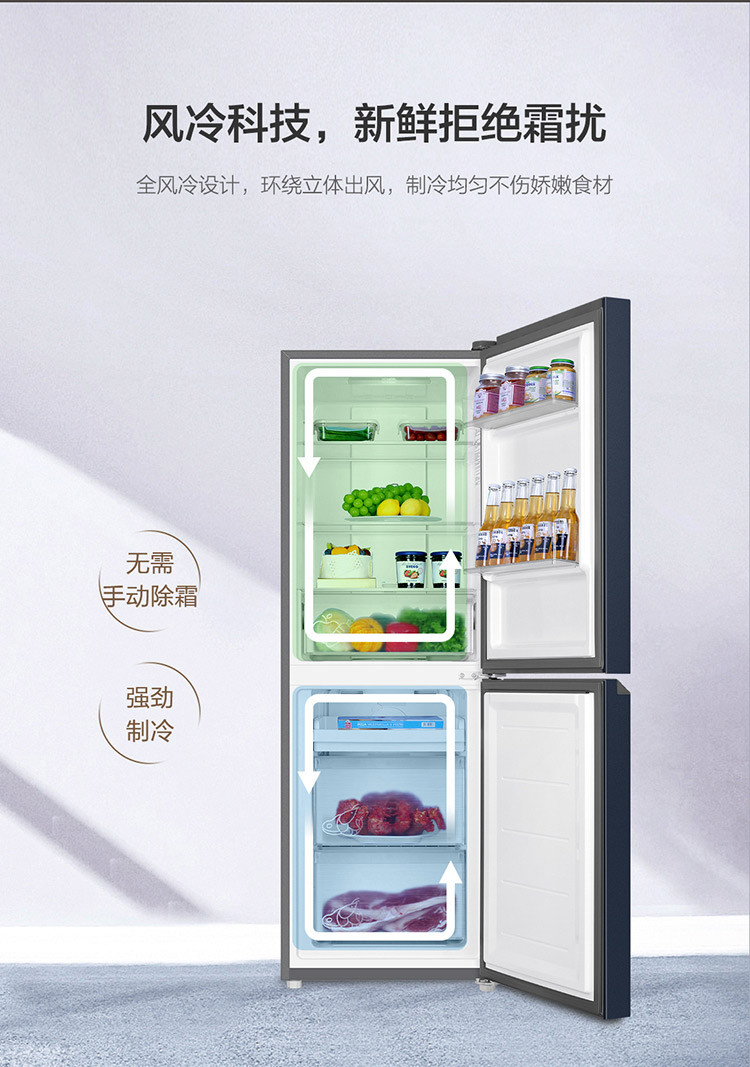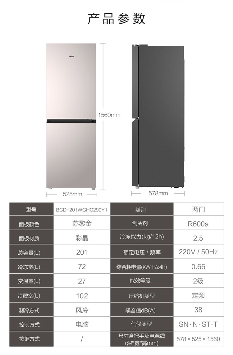 海尔(Haier) 201升 两门风冷无霜冰箱 时尚彩晶玻璃面板 黑金净味 两档变温抽屉 租房小冰箱 BCD-201WGHC290Y1