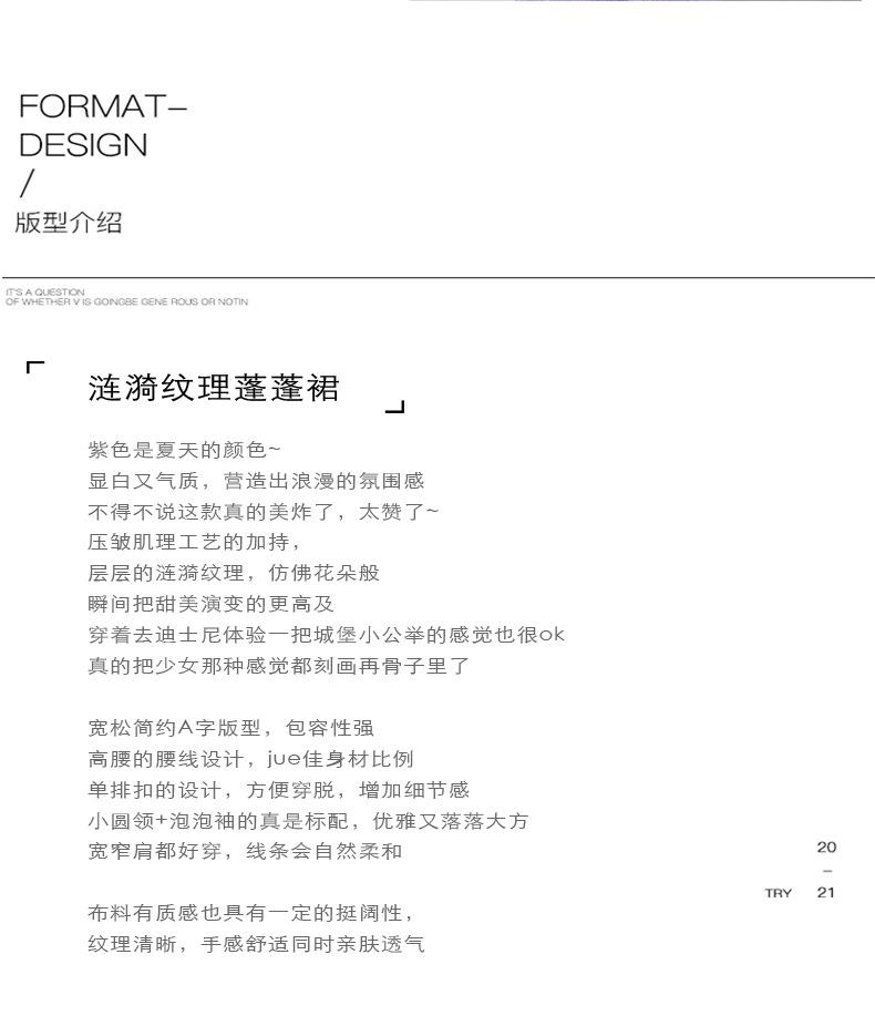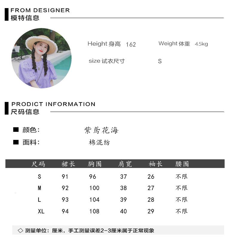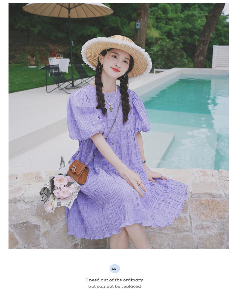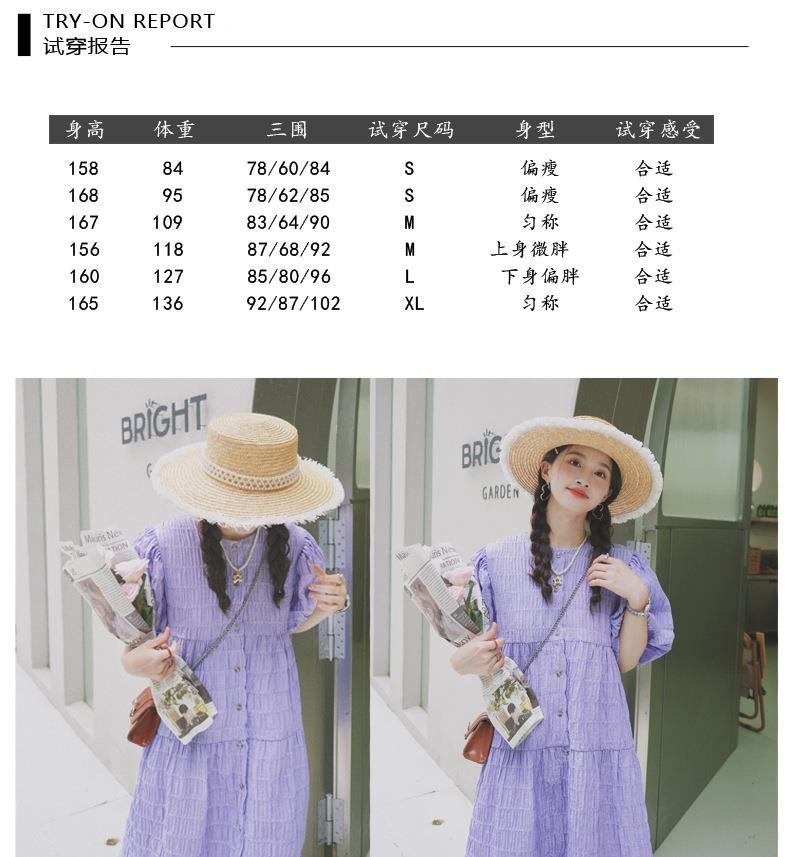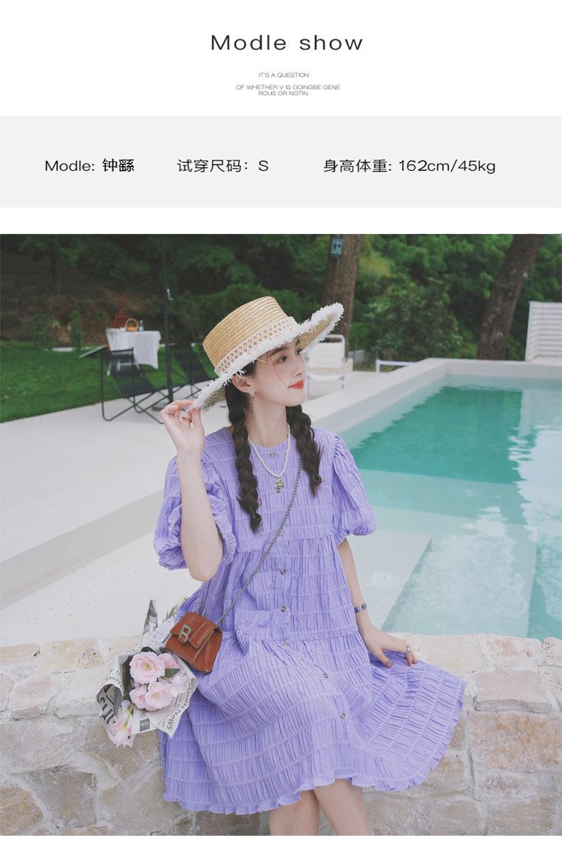 实拍肌理感压褶紫鸢花海泡泡袖小个子甜美风减龄宽松单排扣连衣裙