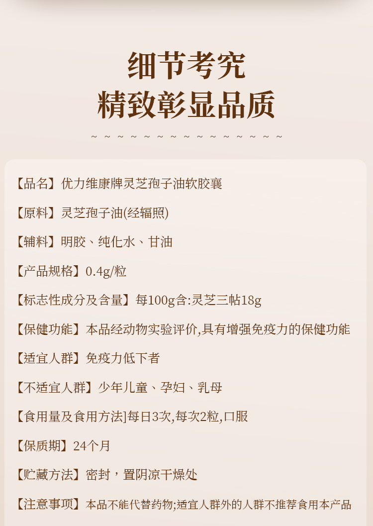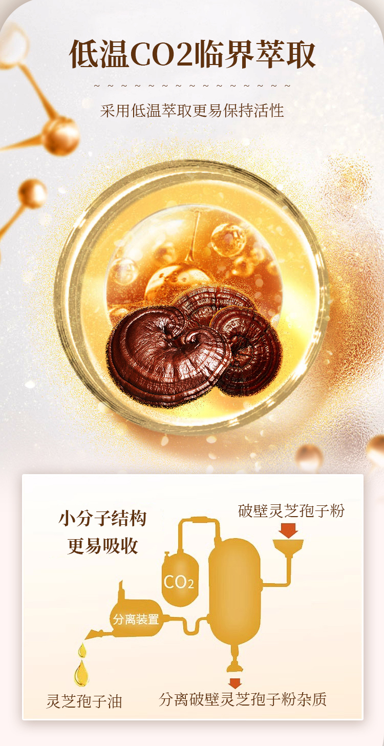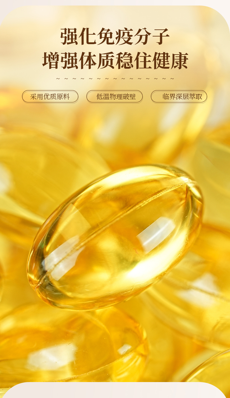 2、灵芝孢子油遇冷后油体会凝固,由金黄色液体变成乳白色不透明固体,属于正常物理现象,不影响服用,温度上升后恢复正常。