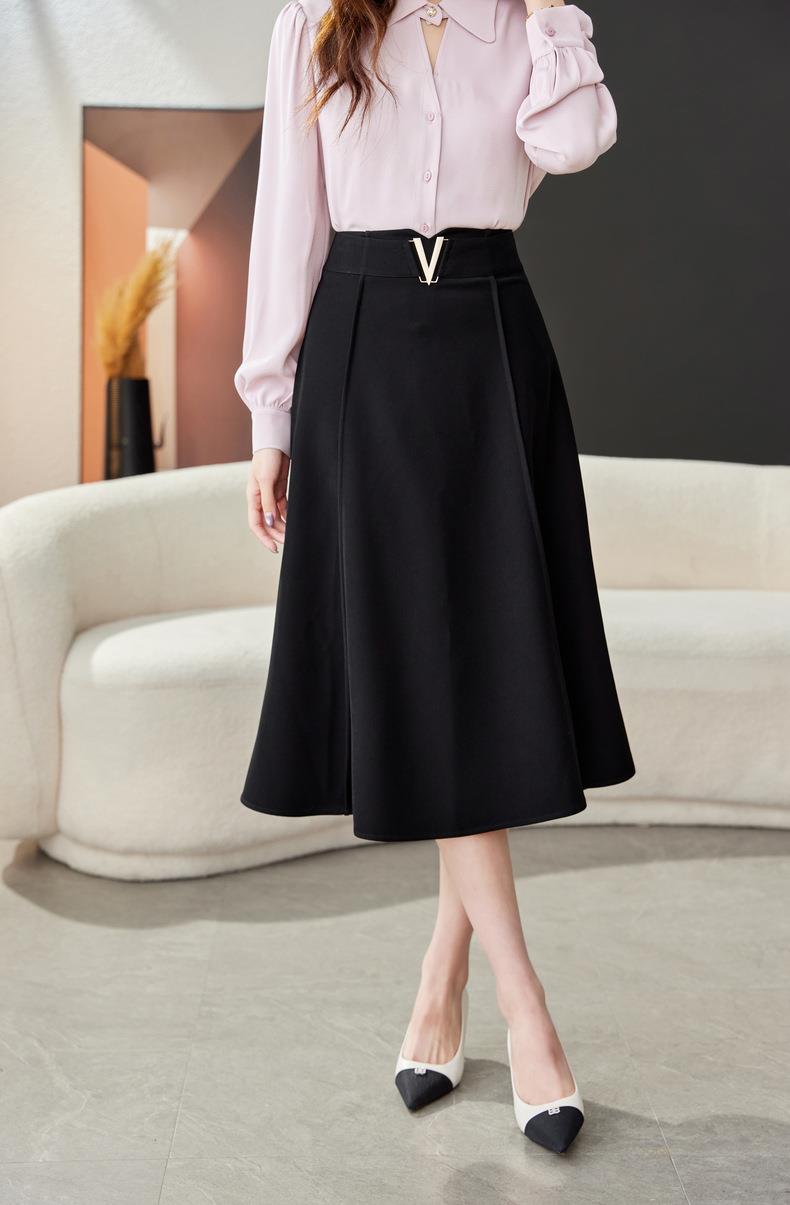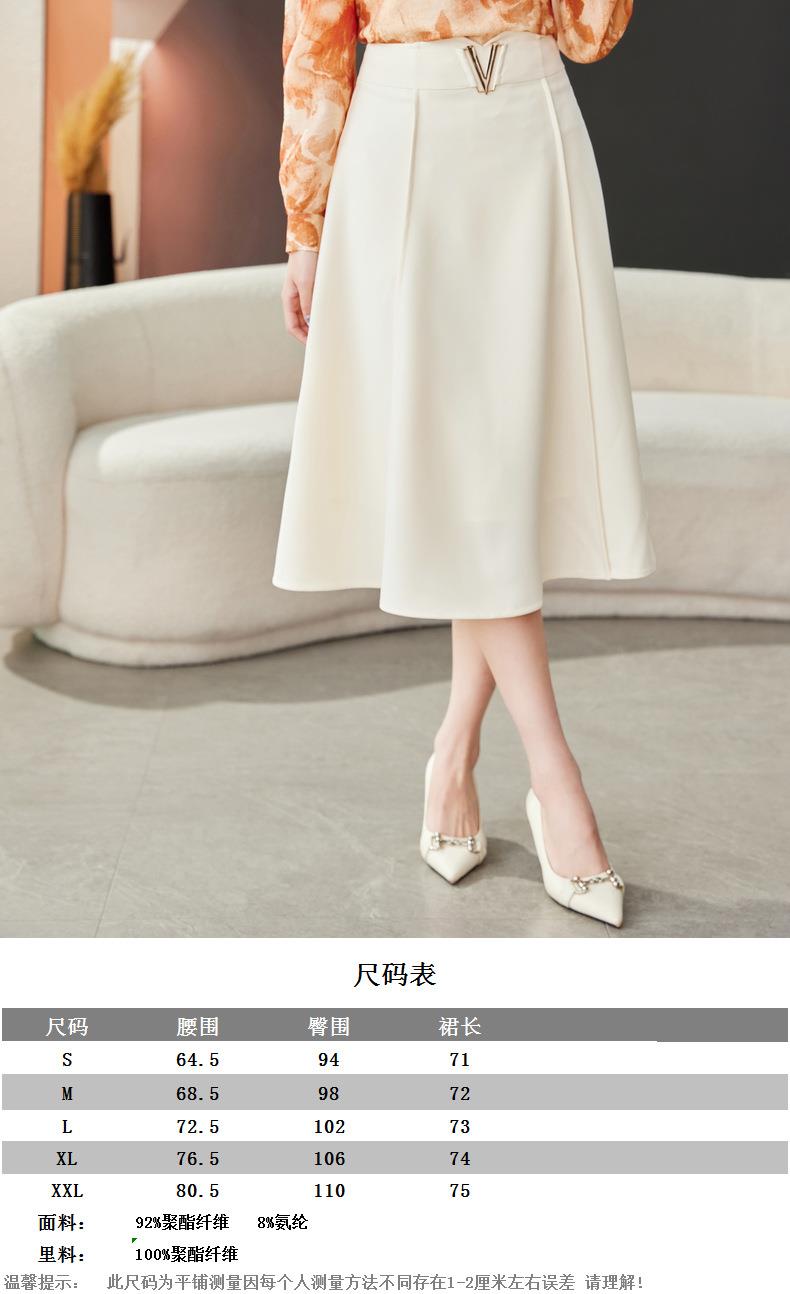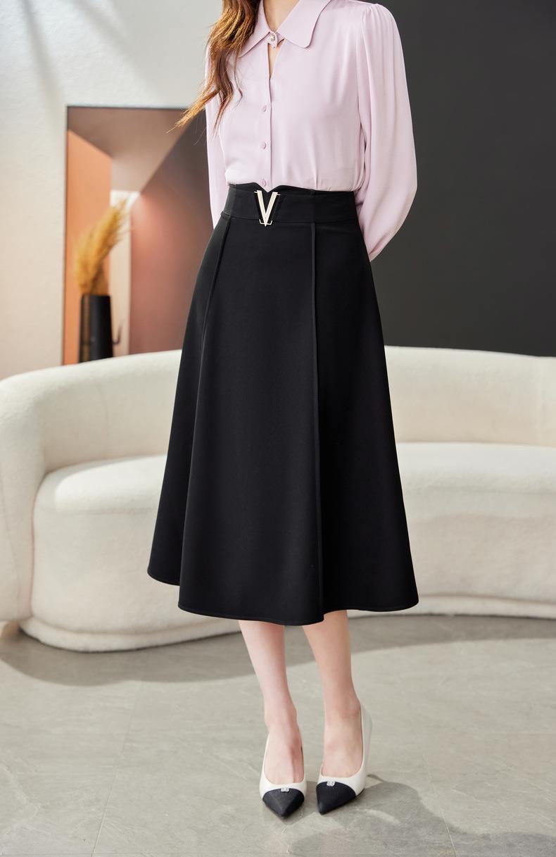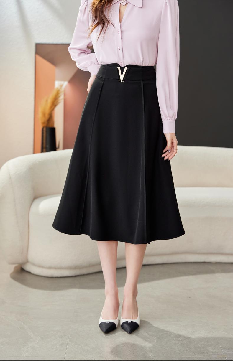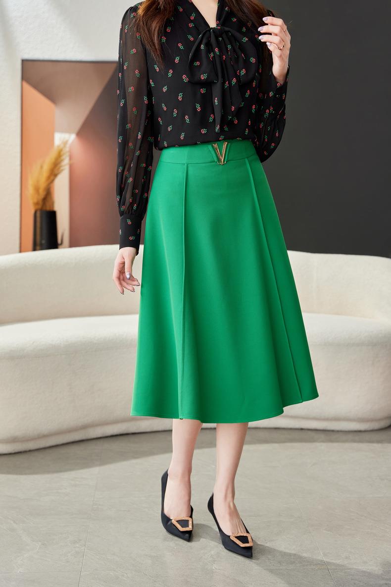 高腰垂感绿色半身裙2024春装新款金属V字扣A字中长裙伞裙1727