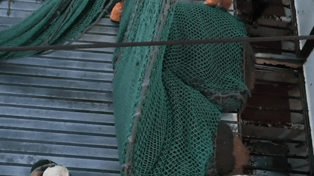北极甜虾捕捞采用拖网方式,拖网沉入海底数百米,虾被困在网中并拖到船上进行加工