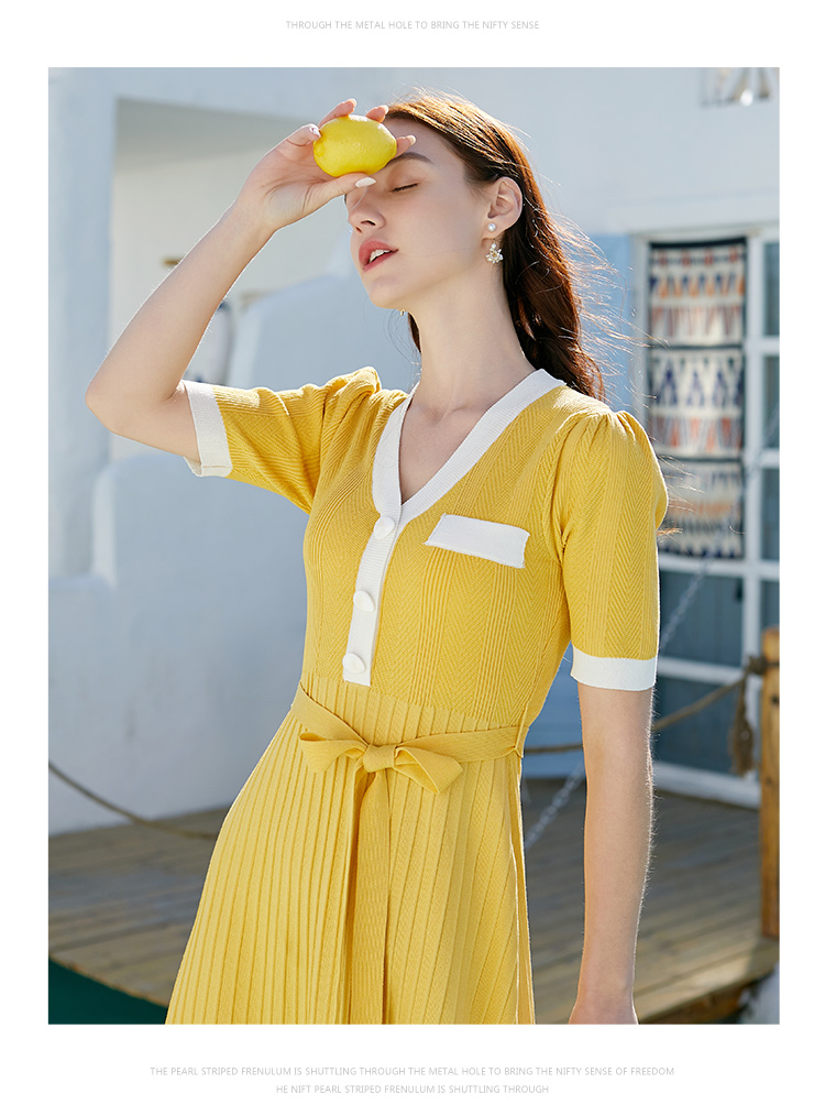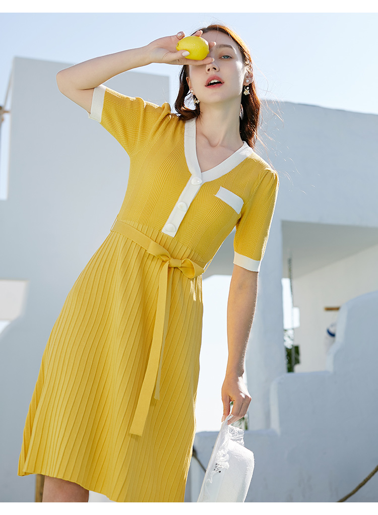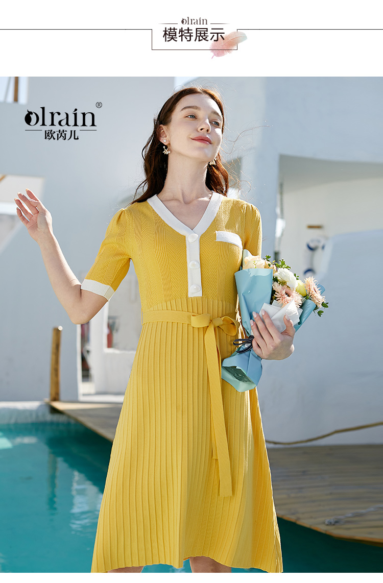 欧芮儿春新品V领短袖针织连衣裙
