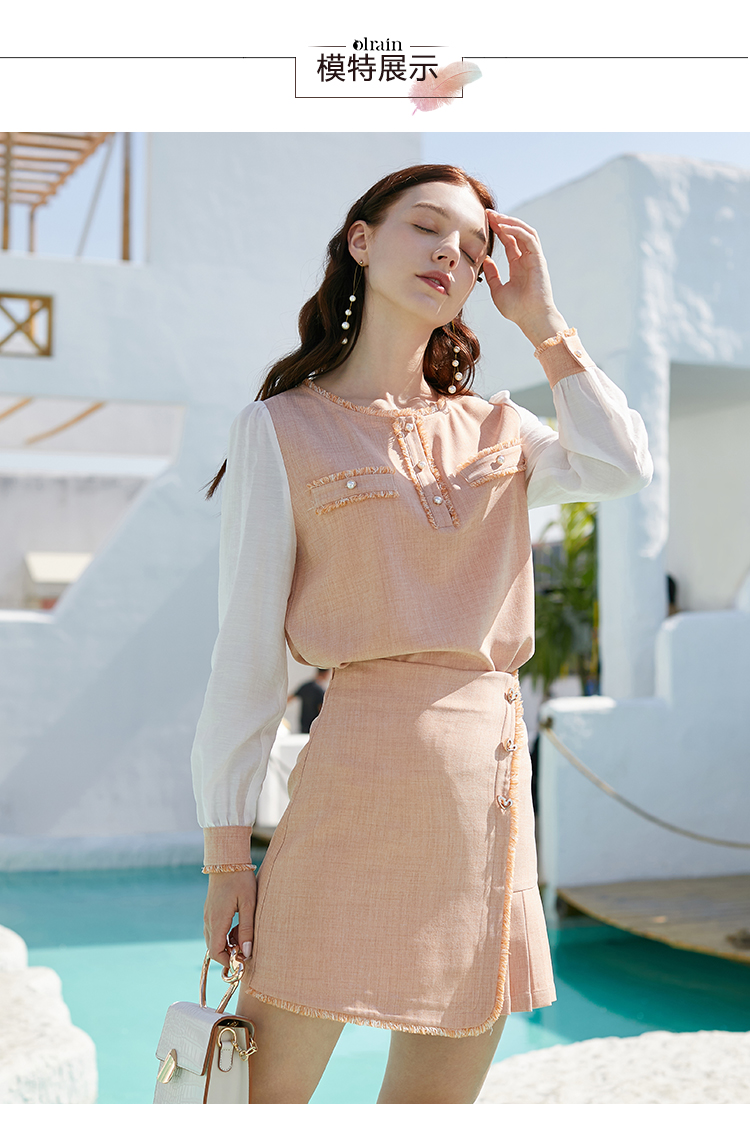 欧芮儿春新款长袖拼接小香风衬衫