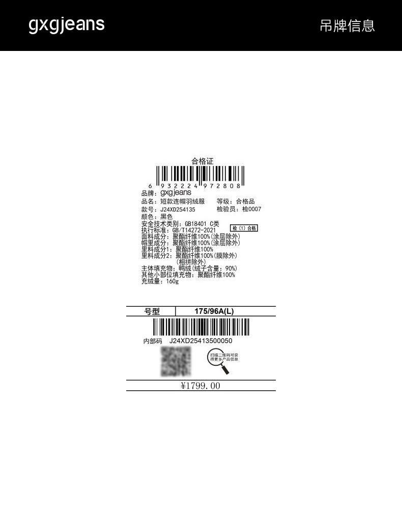 gxg.jeans男装 黑色户外工装宽松连帽羽绒服外套厚款 25冬热卖