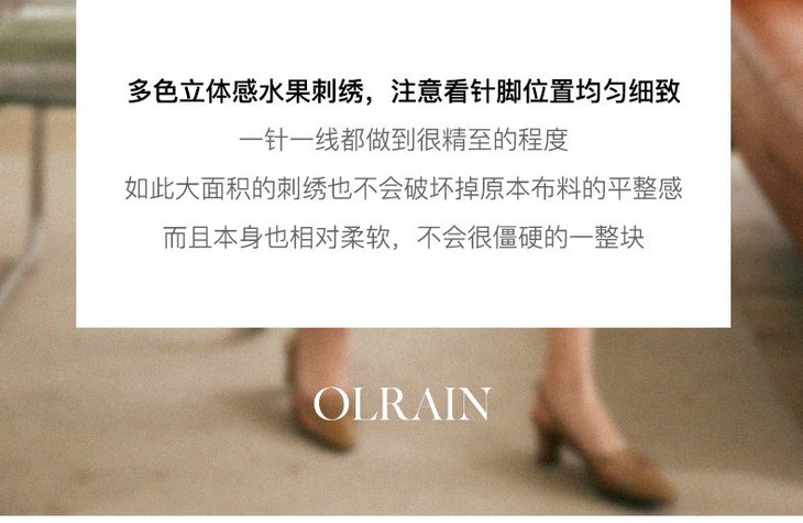 - “精致”是欧芮儿olrain品牌文化的核心,欧芮儿认为,精致的女人,不但要外在动人,更要内在迷人,内外兼修,有魅力、有气质、有内涵,自信而不自傲,优雅而不矫揉,自有万种风情而不轻浮,更不故作矜持。