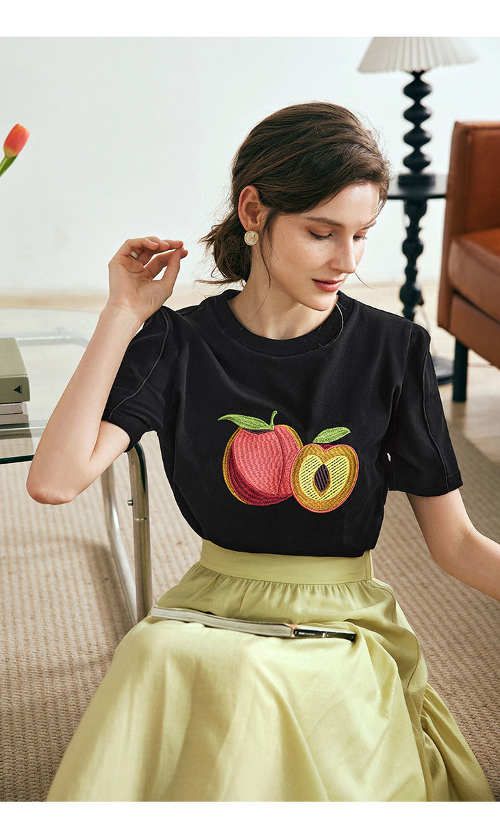 OLrain欧芮儿法式黑色短袖T恤女夏季2023年新款宽松水果刺绣上衣