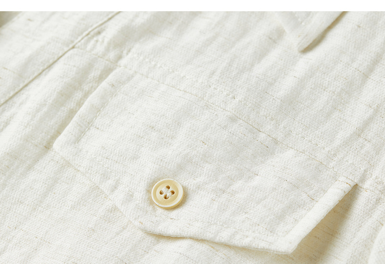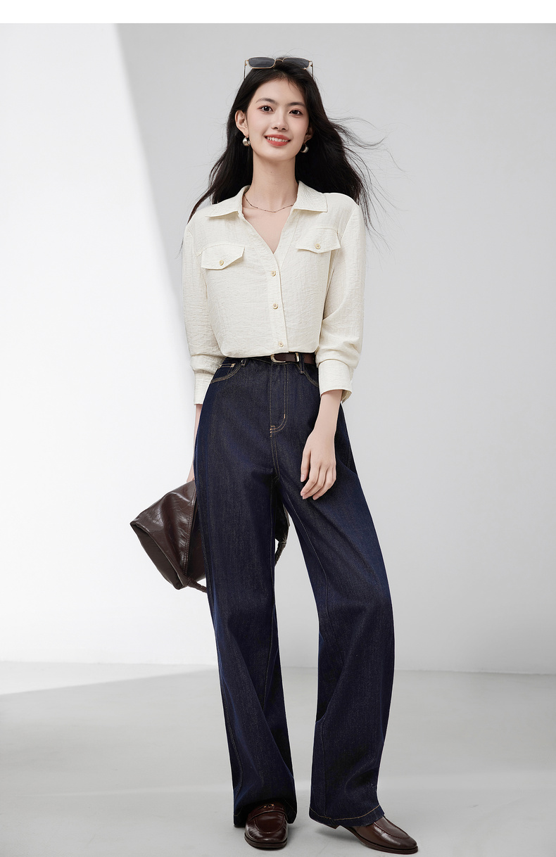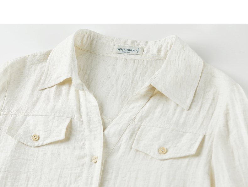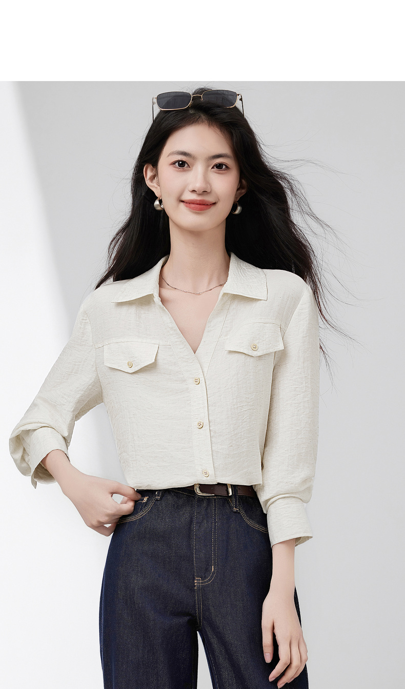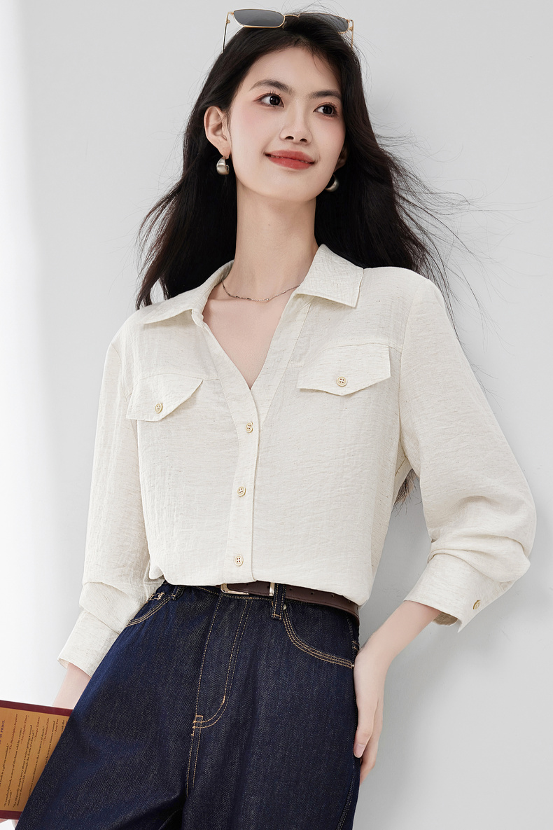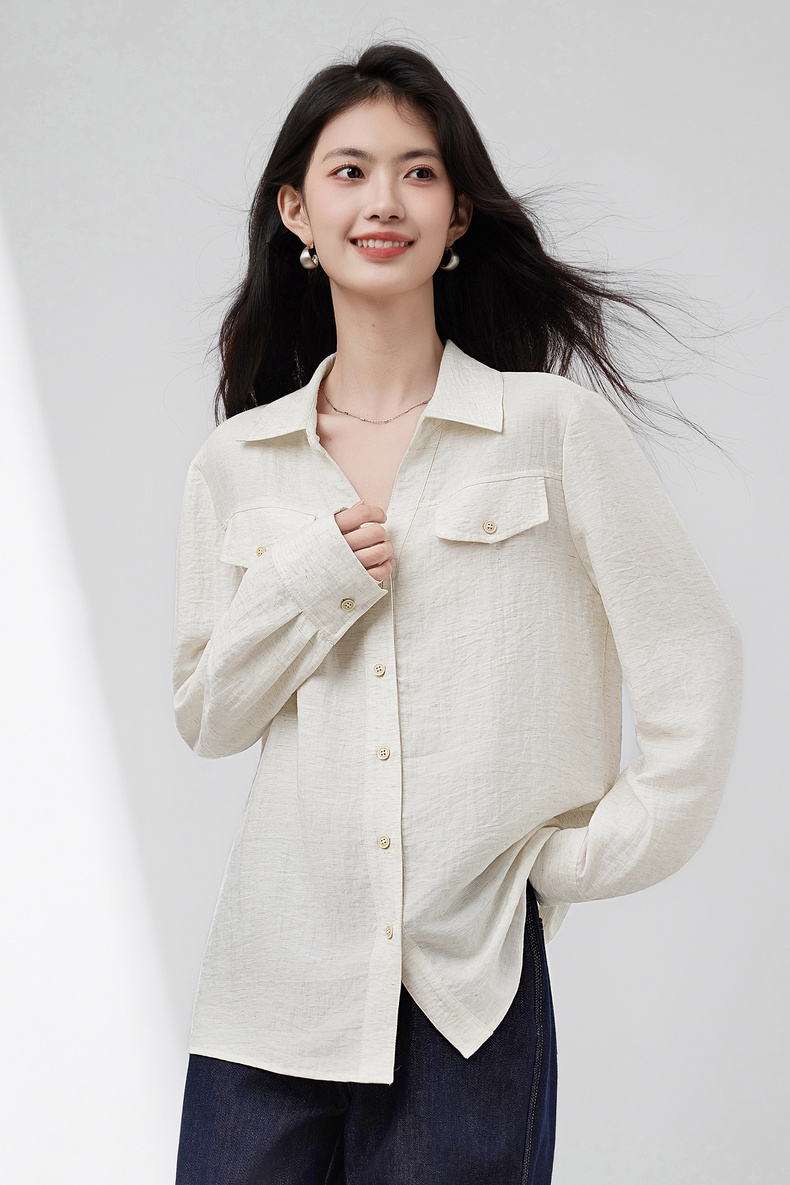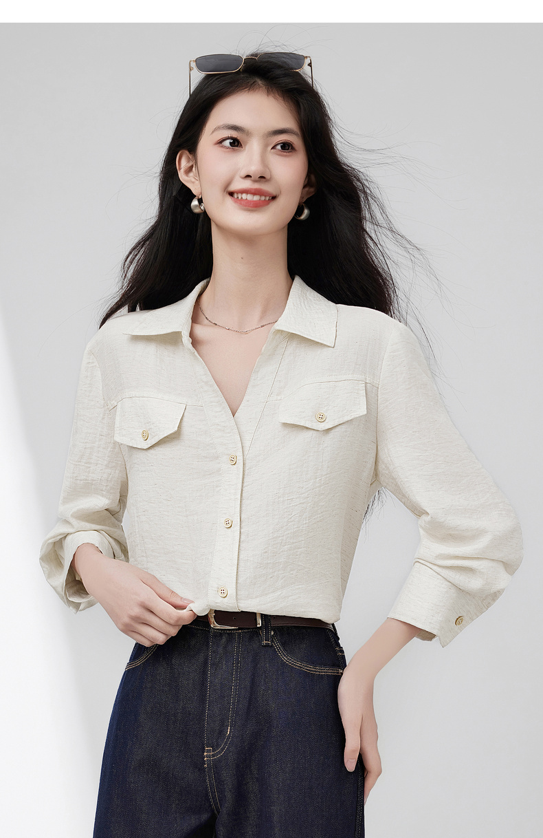 【内购】【含亚麻】通勤上班V型翻领撞色木质感纽扣宽松显瘦长袖衬衫-153CA2806