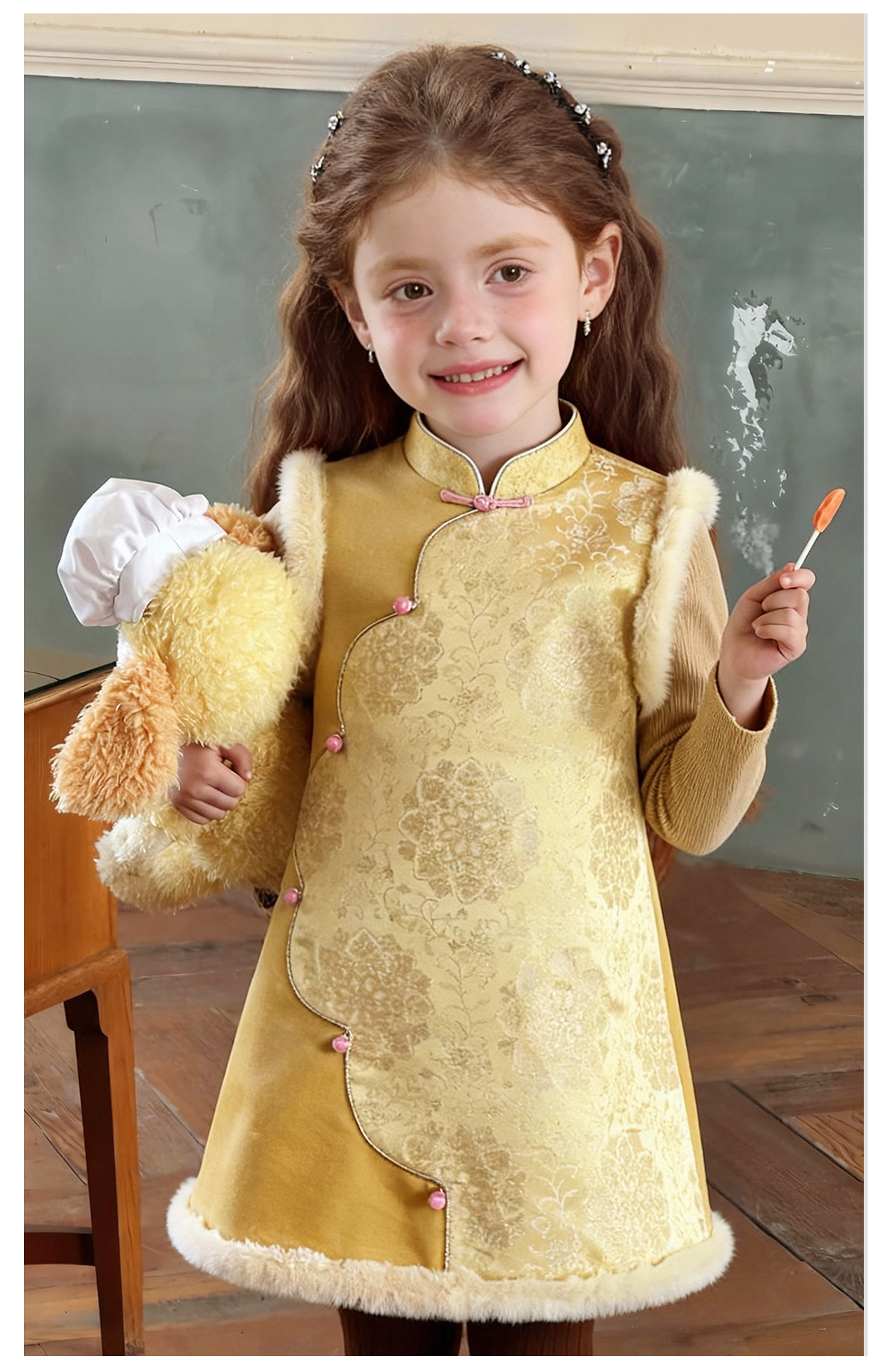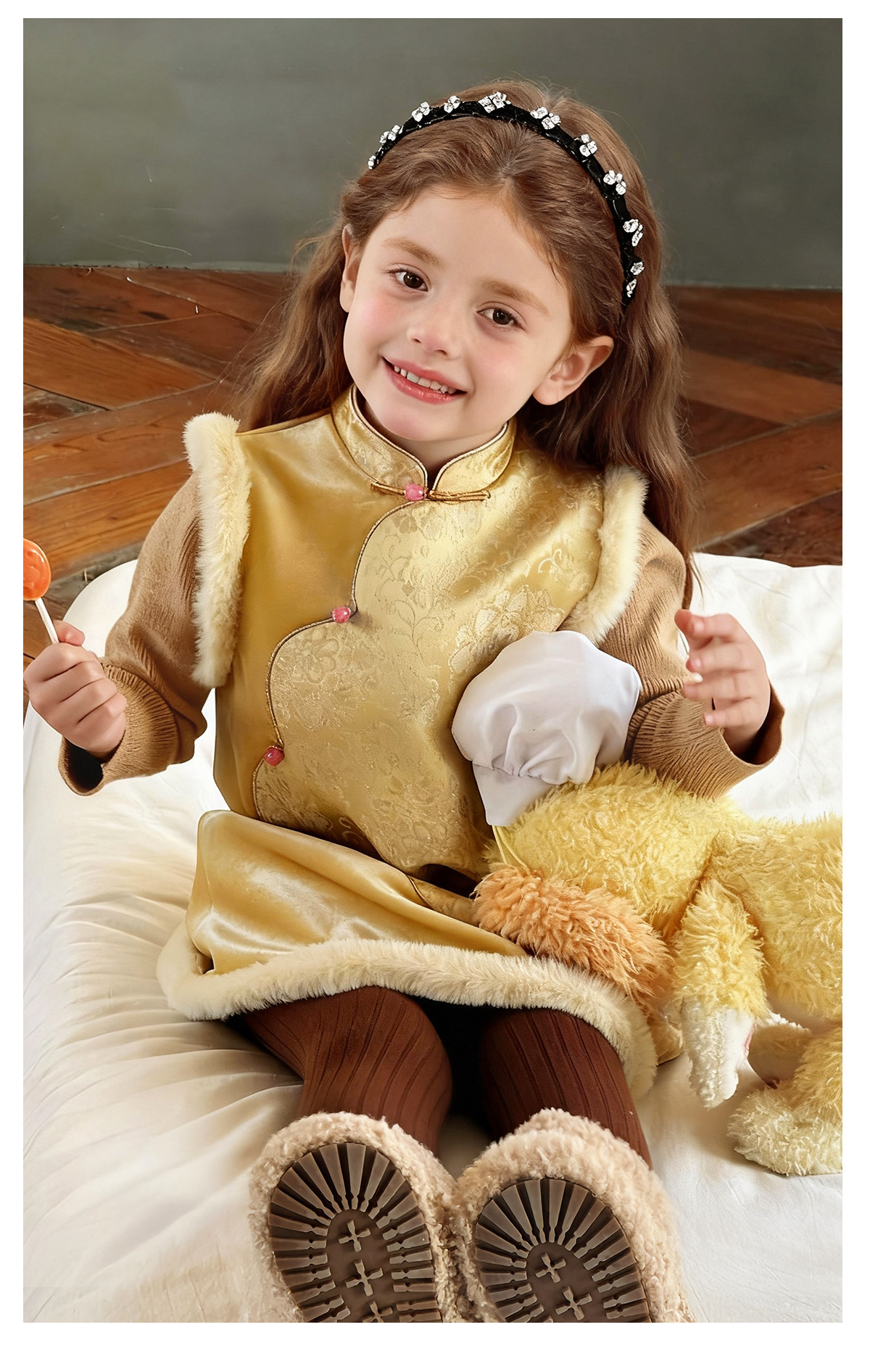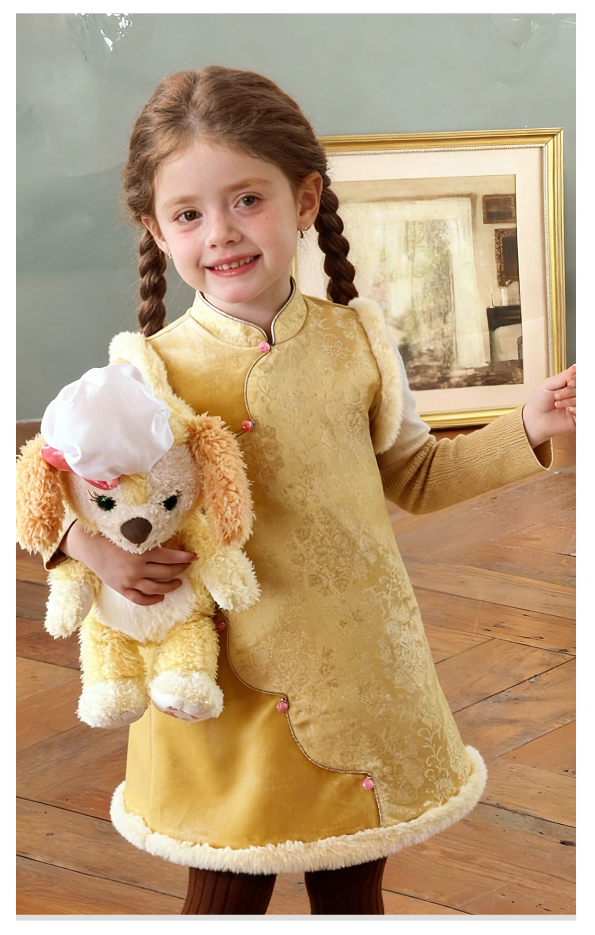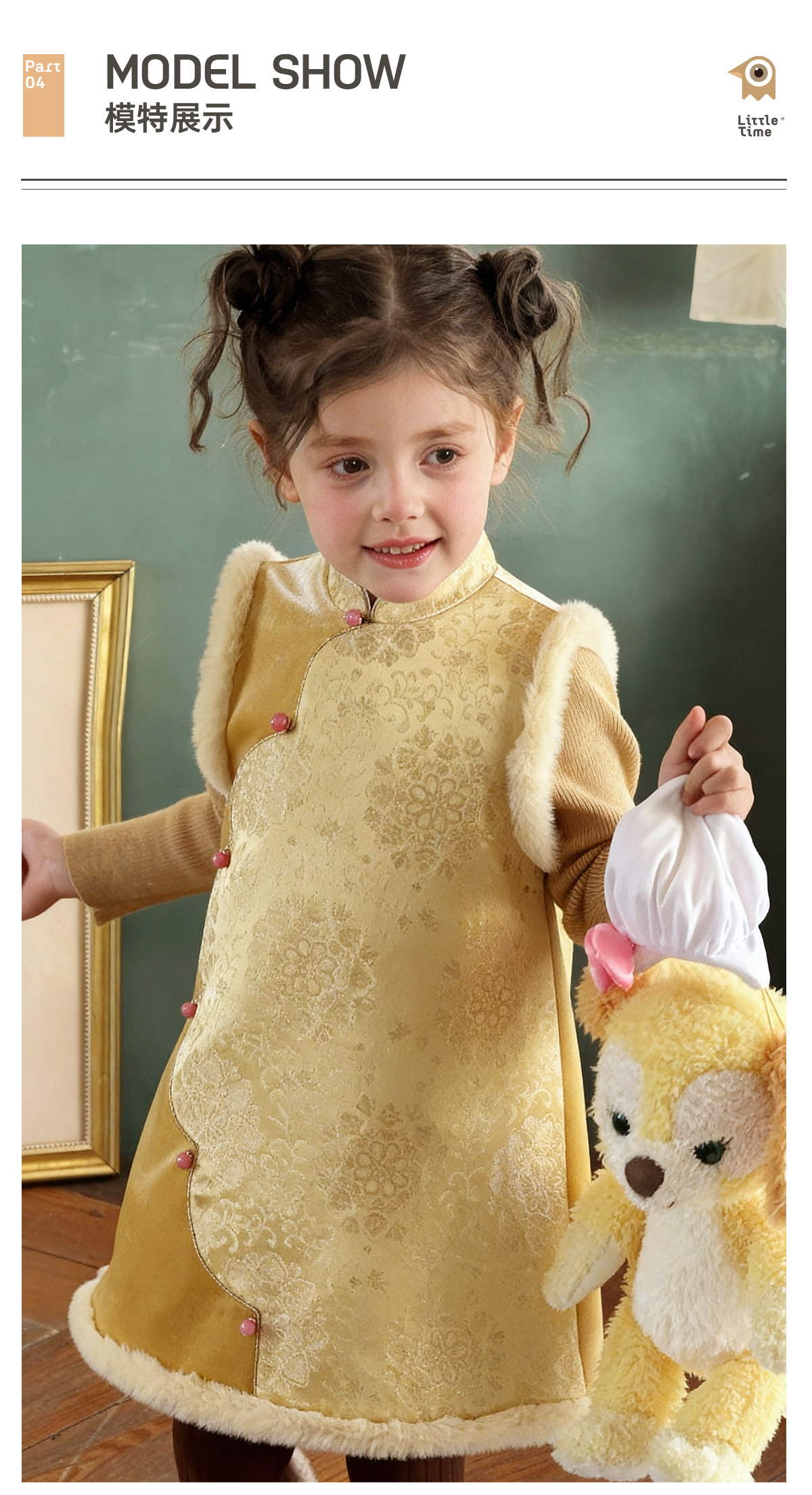 littletime女童连衣裙2025秋冬新款中式改良旗袍立领连衣裙外套