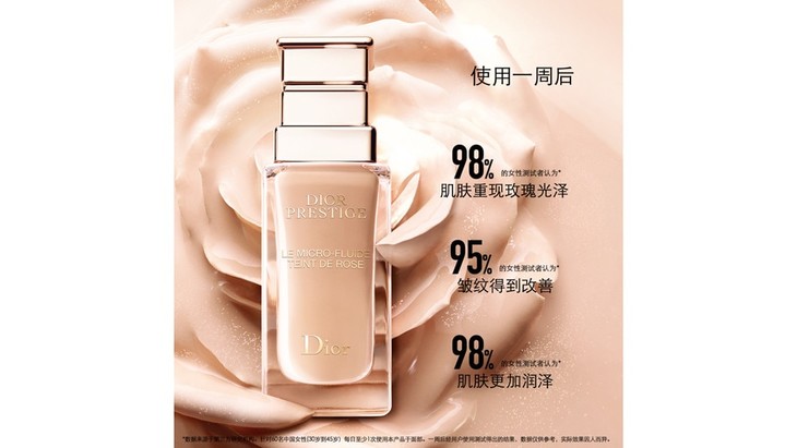 (6) 数据来源于LVMH实验室。针对11名受试者(9名女性:8名白种人和1名亚洲人;2名白种人男性;24岁-63岁,平均年龄:42岁)单次先使用克丽丝汀迪奥花秘瑰萃玫瑰微凝珠赋活精华,再使用 克丽丝汀迪奥花秘瑰萃精华粉底液于前臂,6小时后经仪器测试得出的结果。数据仅供参考,实际效果因人而异。