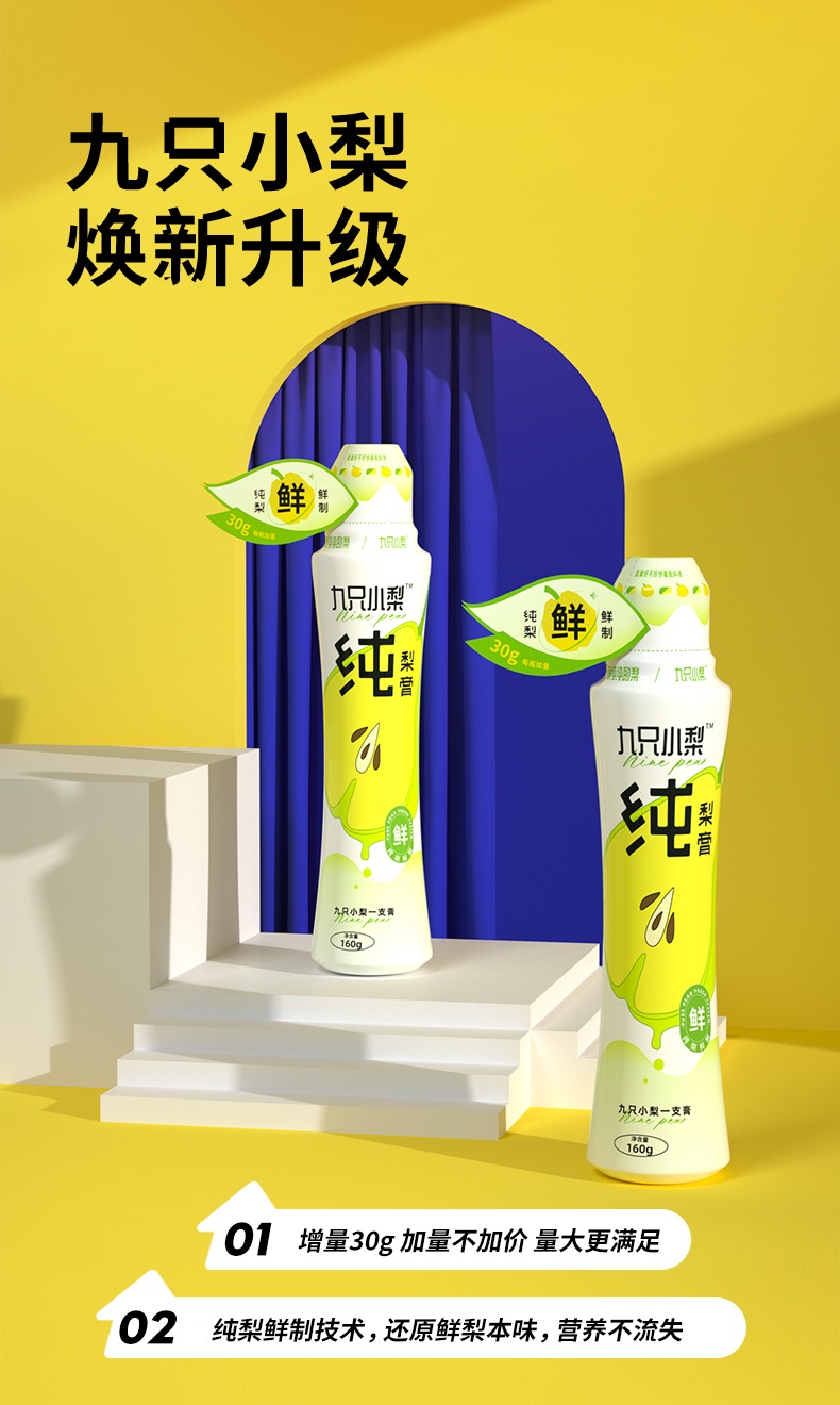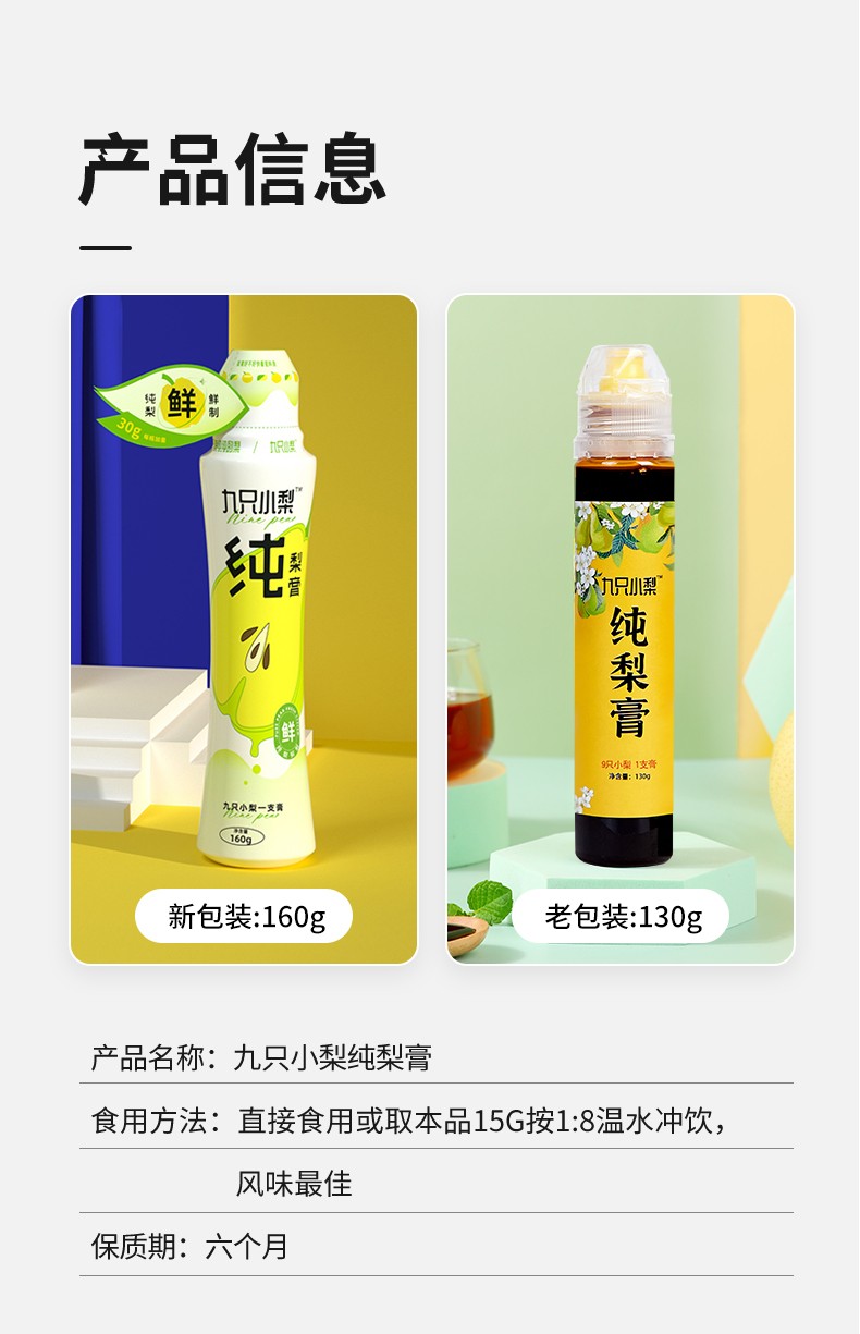 | 产品名:九只小梨纯梨膏 规格: 九只小梨纯梨膏老版本(130g/支) 九只小梨纯梨膏升级款(160g/支) 产地/发货地:武汉 发货快递:中通韵达EMS 发货区域:全国包邮,新疆、西藏、港澳台不发货。 |