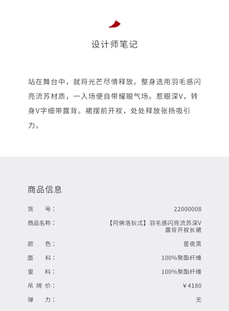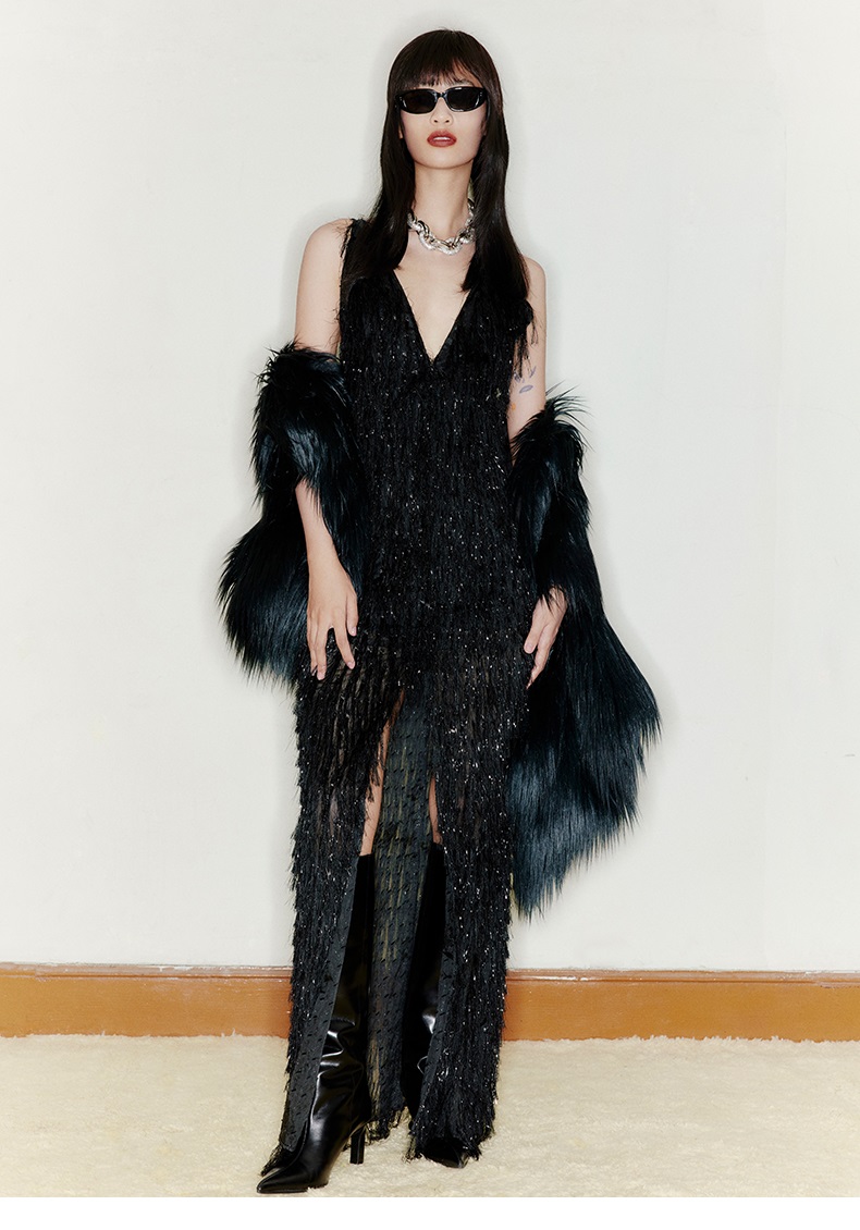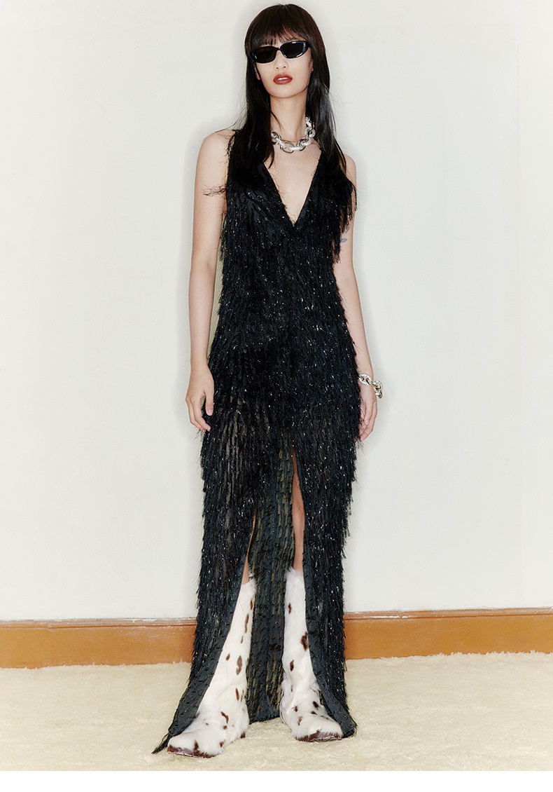 【阿佛洛狄忒】羽毛感闪亮流苏深V露背开衩长裙/22000008