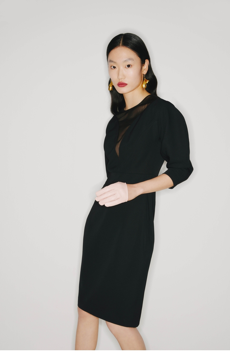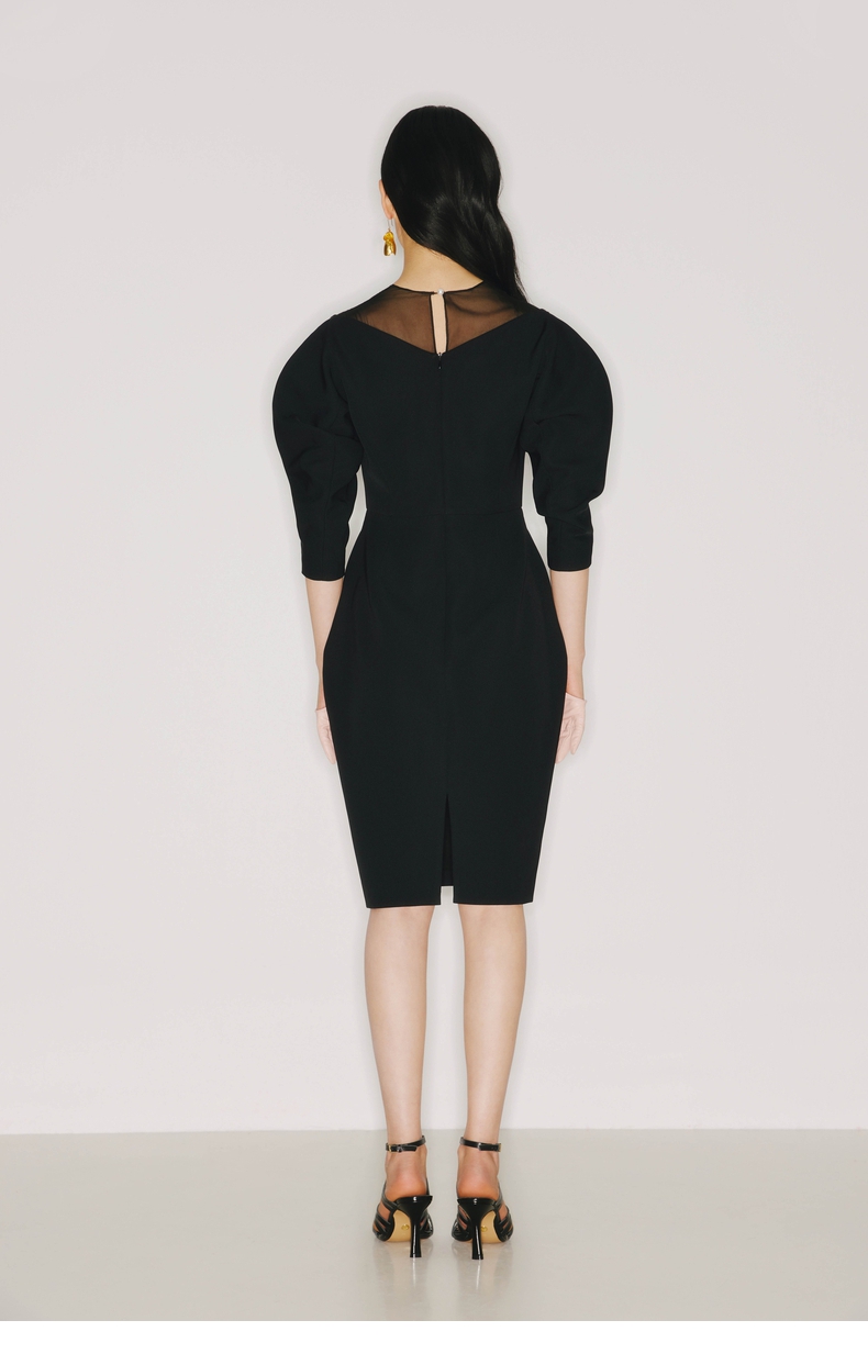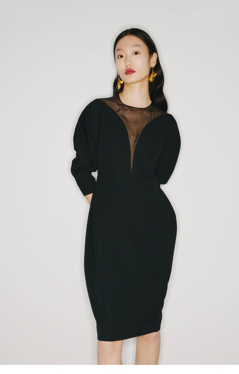 【郁金香】大弧线黑色拼薄纱收腰长袖连衣裙/2200003