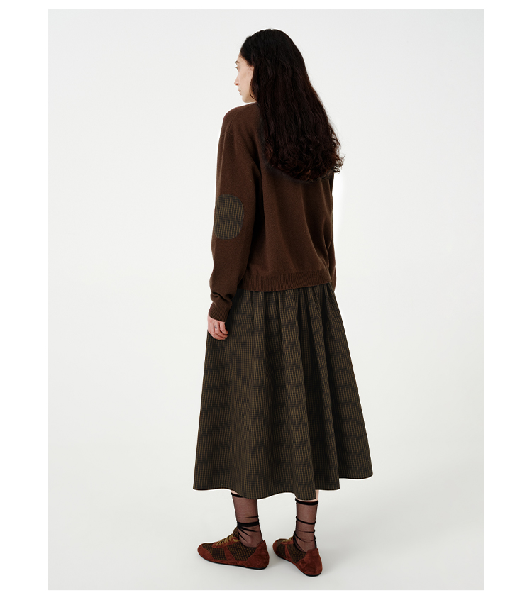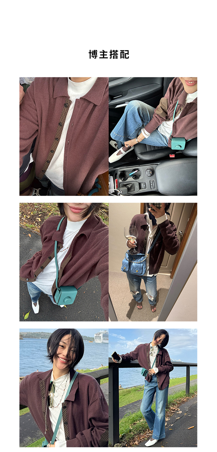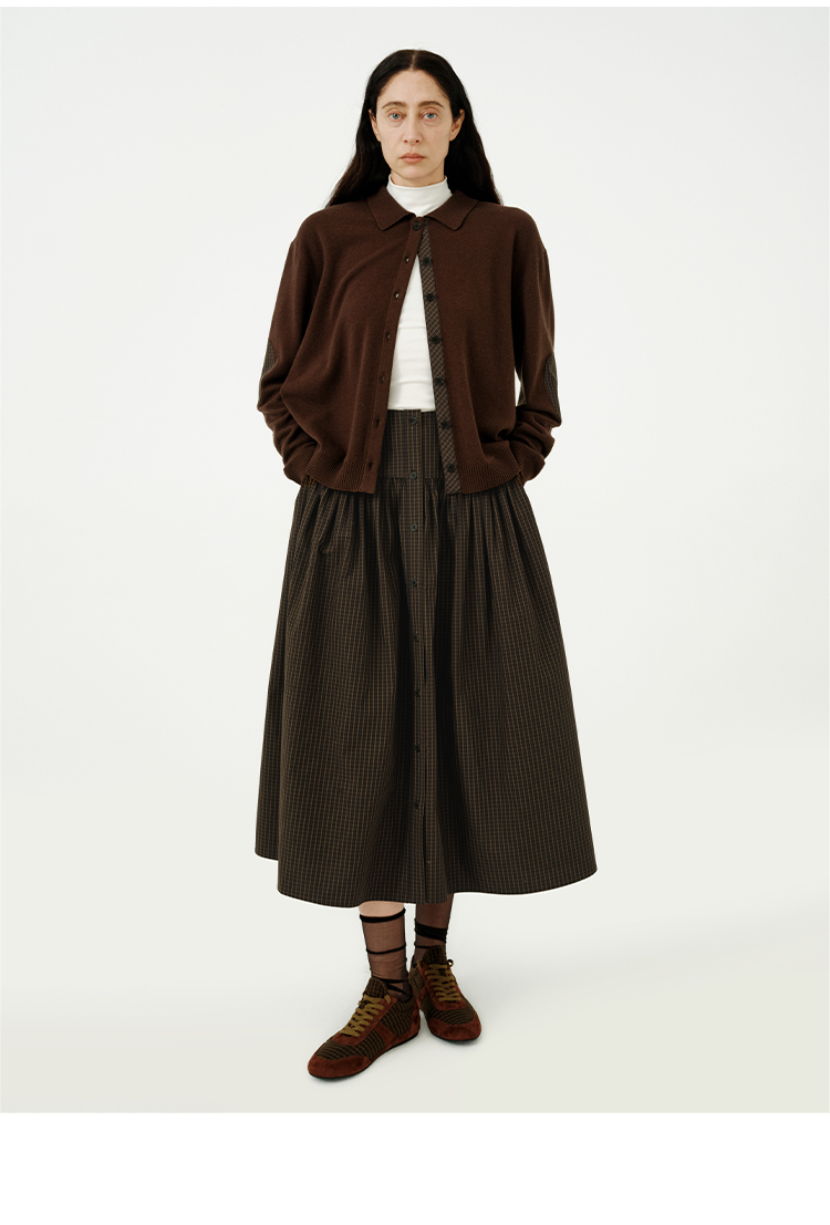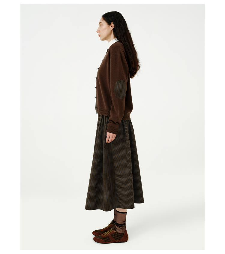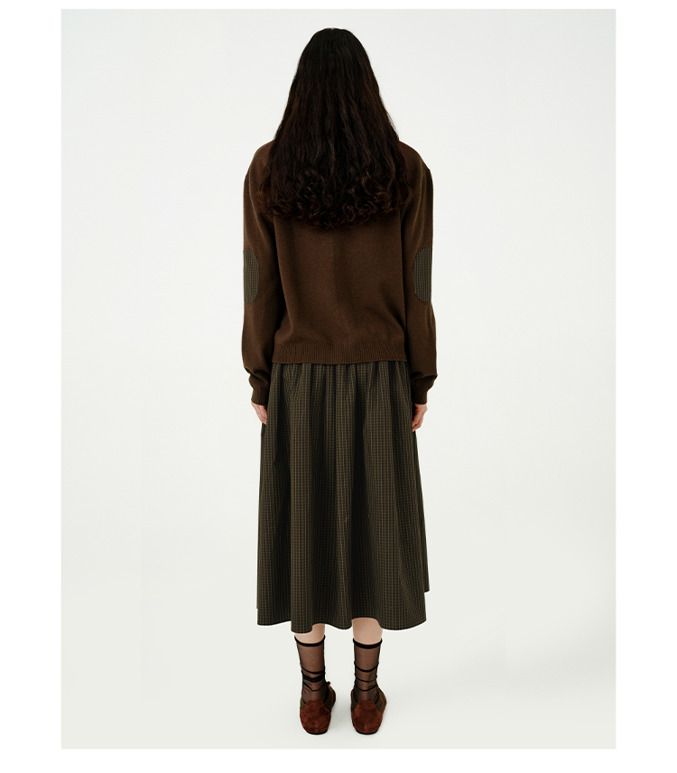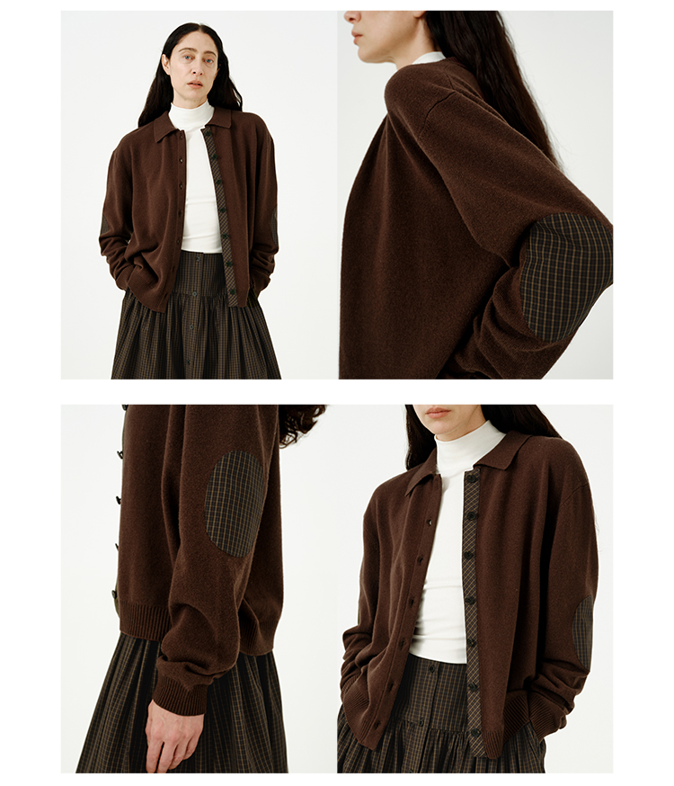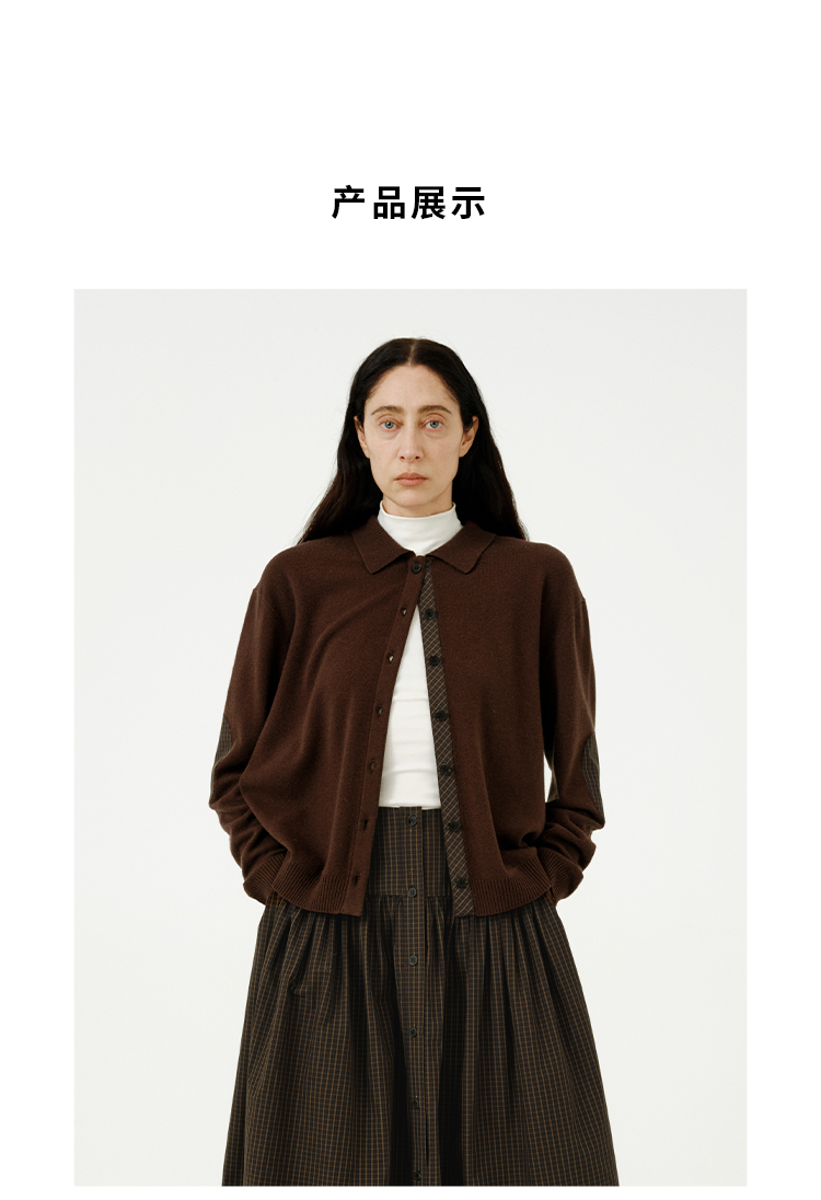 HIDEMI美利奴羊毛巧克力色拼接格纹设计感拼接纽扣圆领开衫毛衣