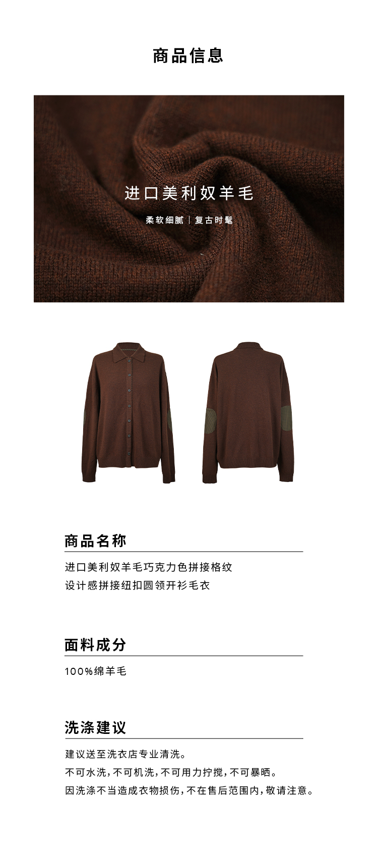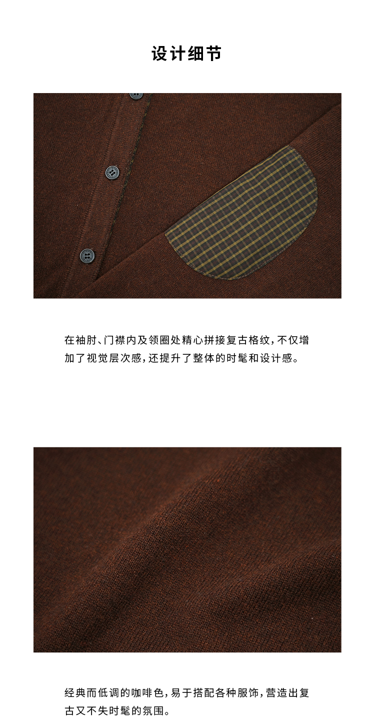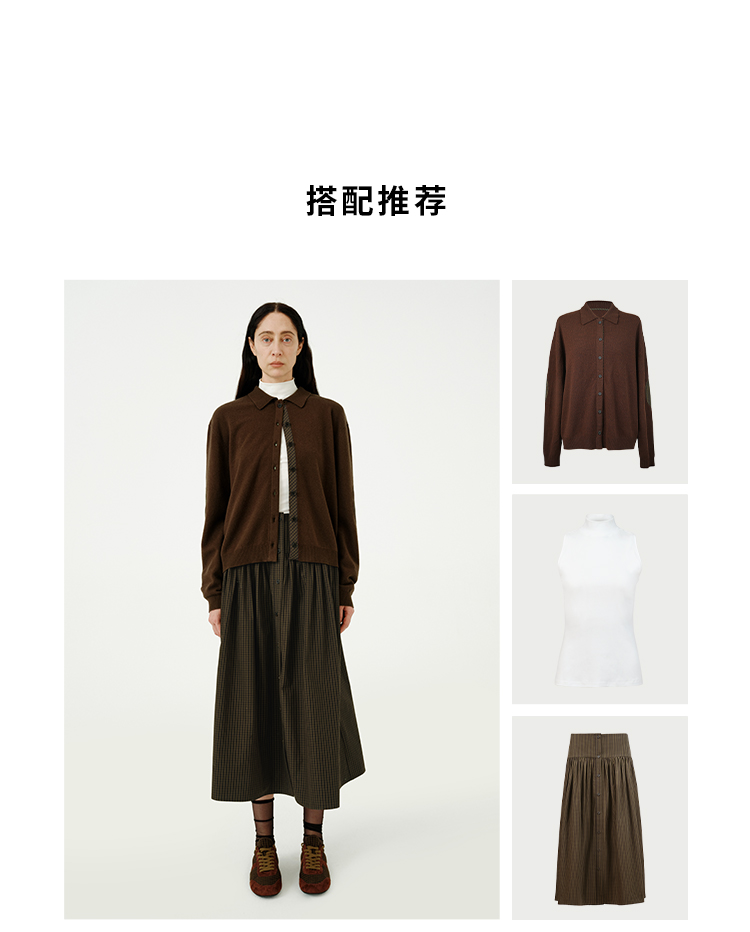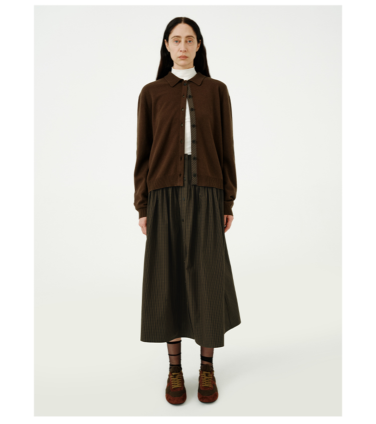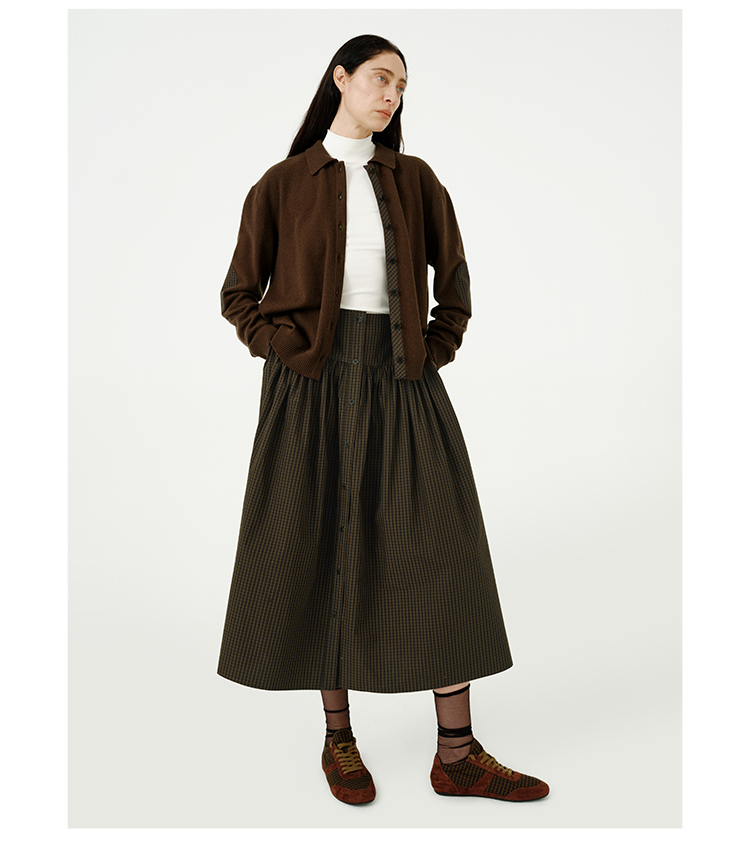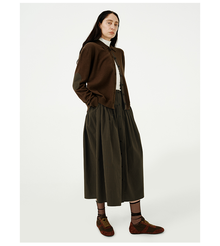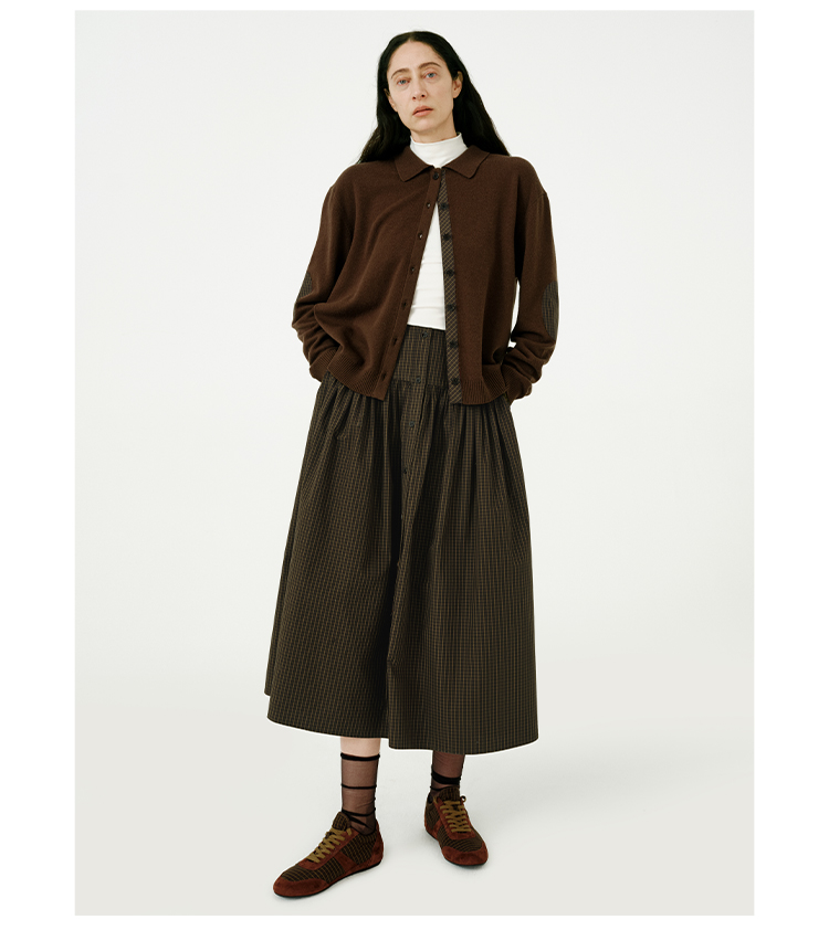 HIDEMI美利奴羊毛巧克力色拼接格纹设计感拼接纽扣圆领开衫毛衣