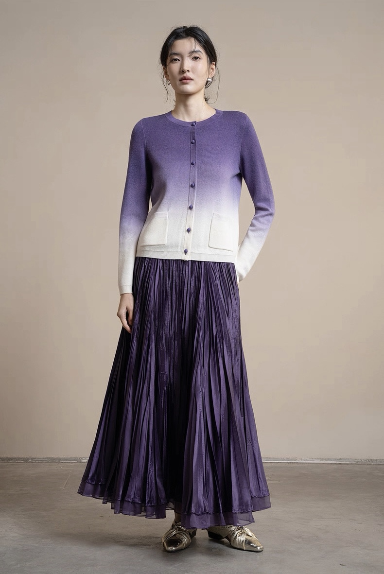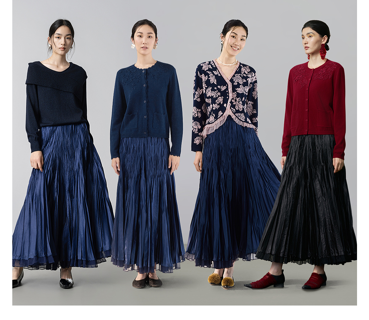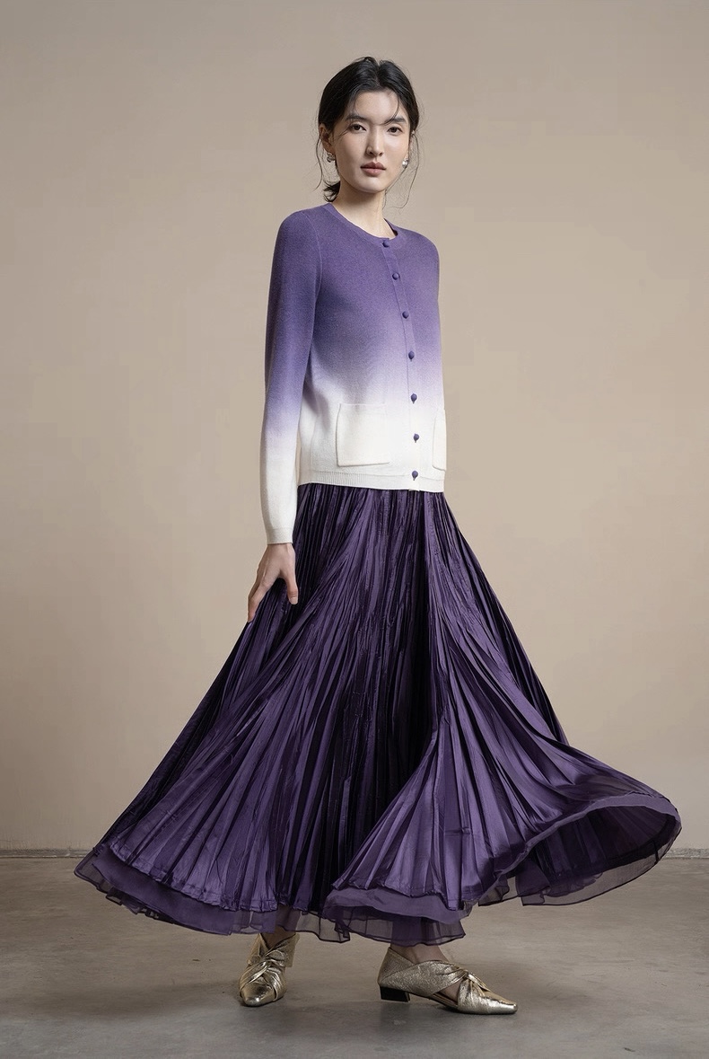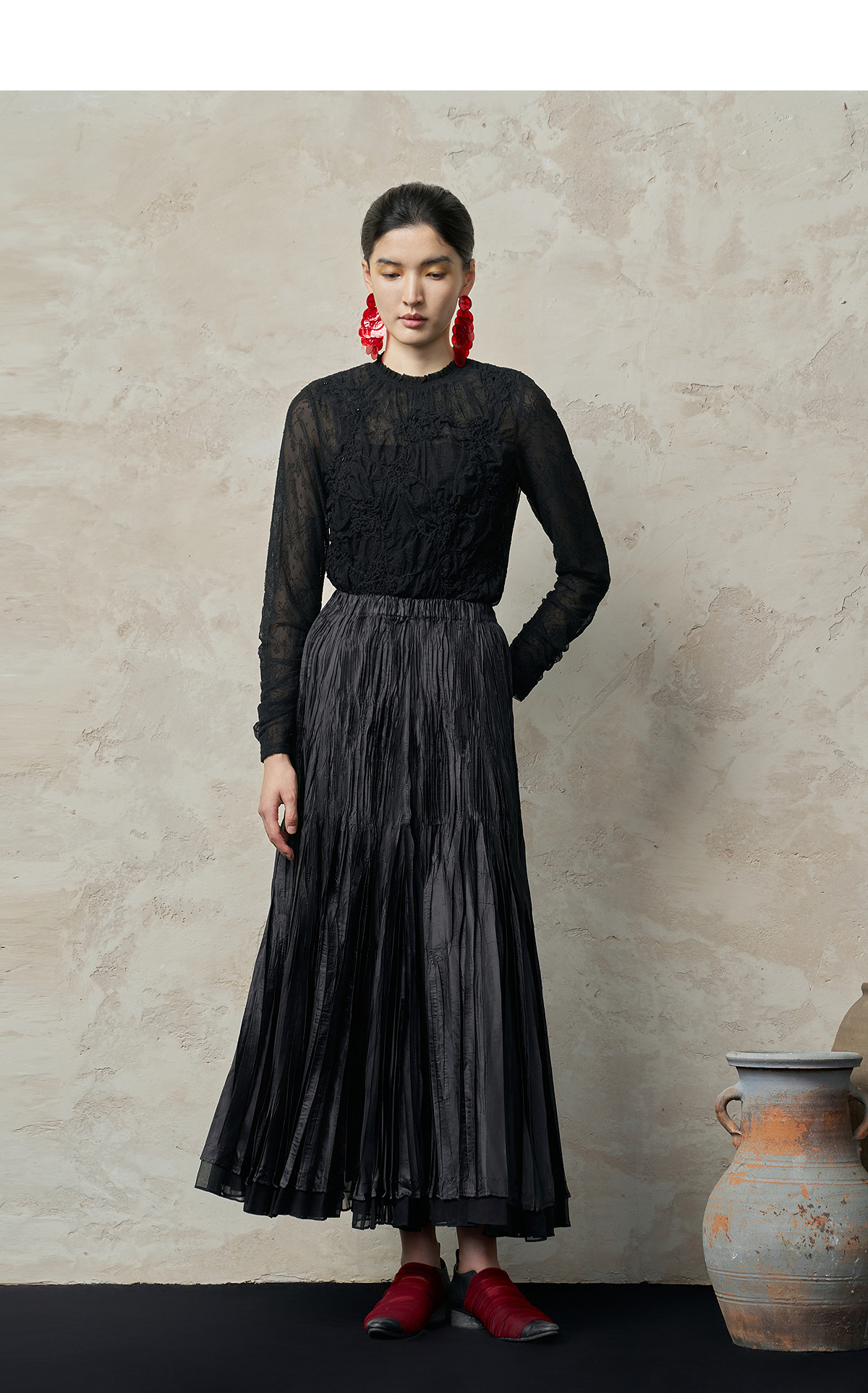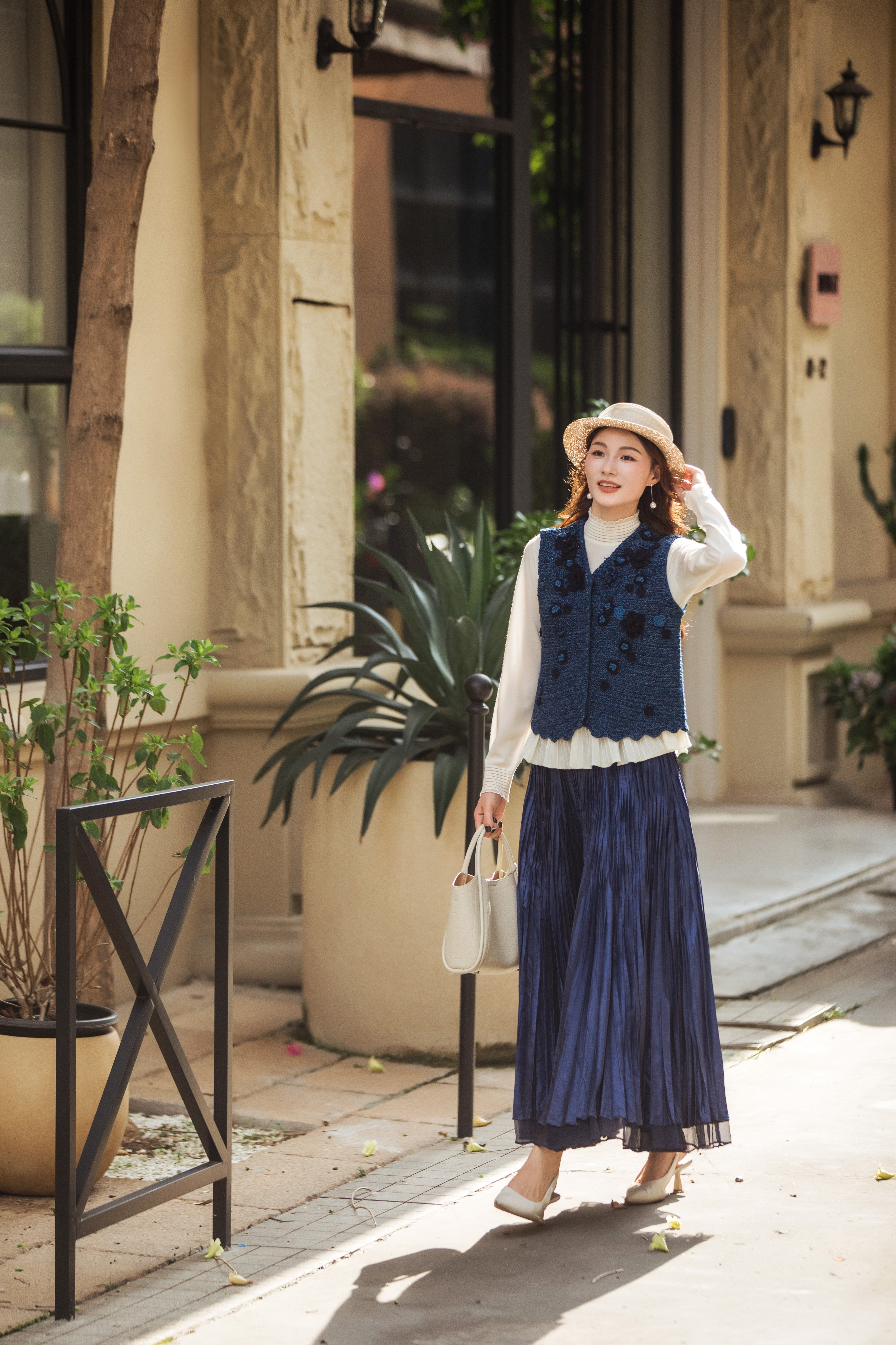 【林栖设计小店】(藏青色/黑色预售12.11)碎钻手工捏褶皱半身裙紫色2025秋季拼真丝休闲文艺新款长裙女1953039