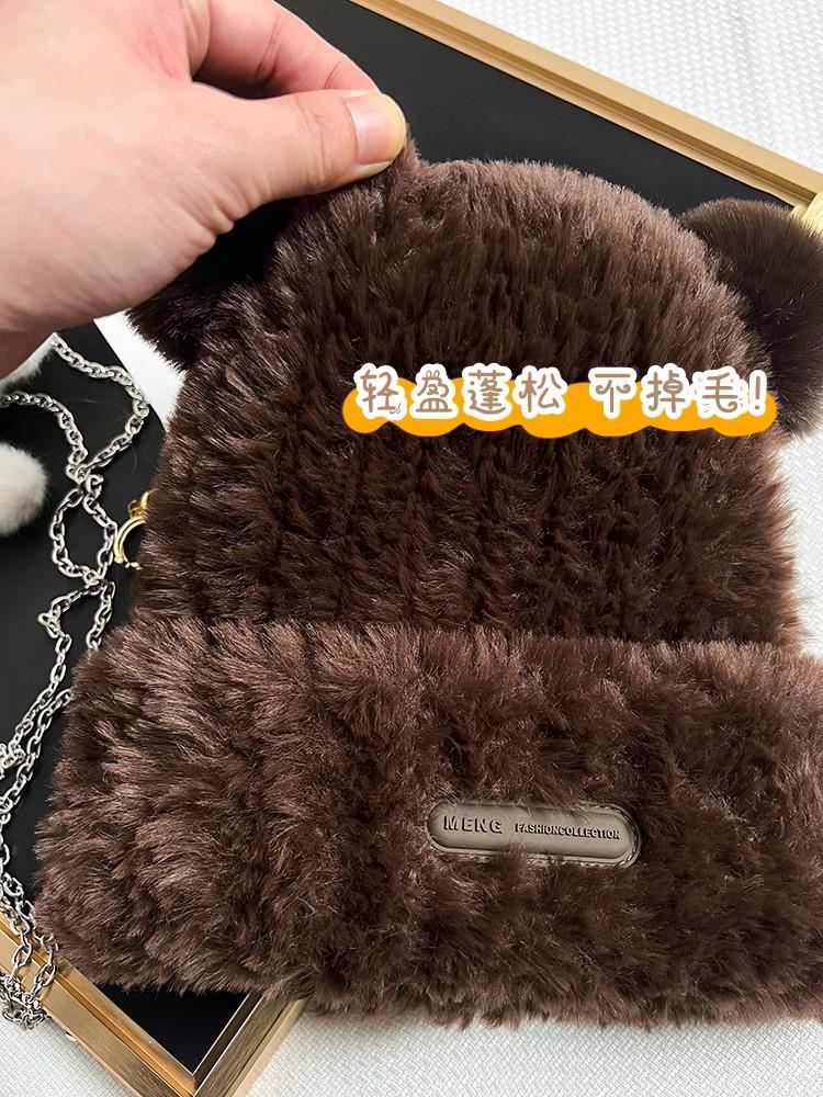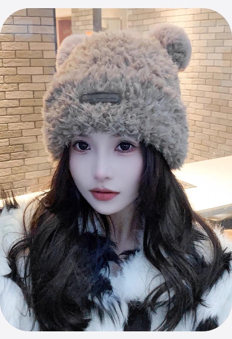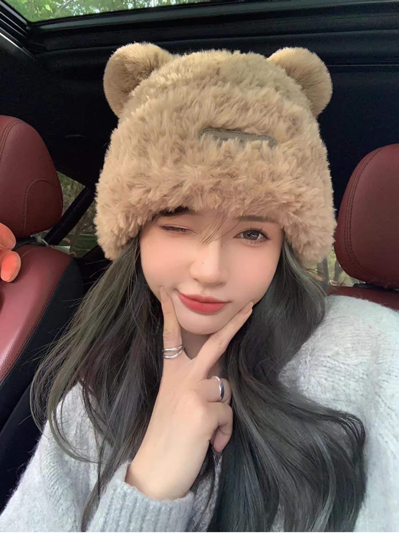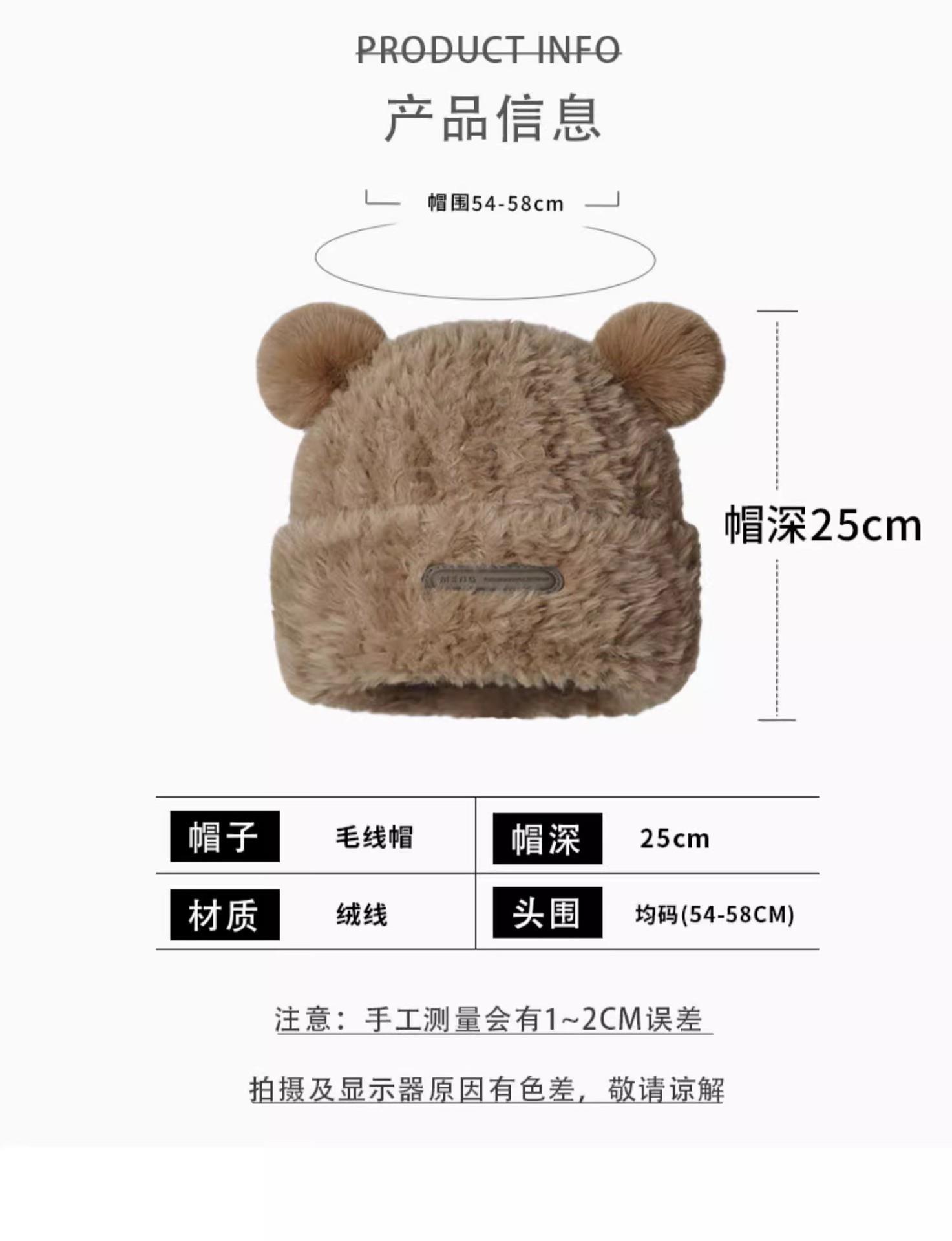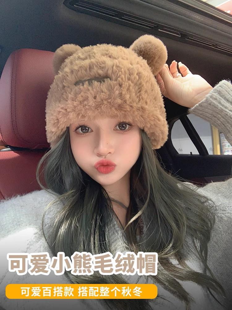 冬季新款可爱小熊毛绒帽女保暖加厚护耳帽大头围针织毛线帽子