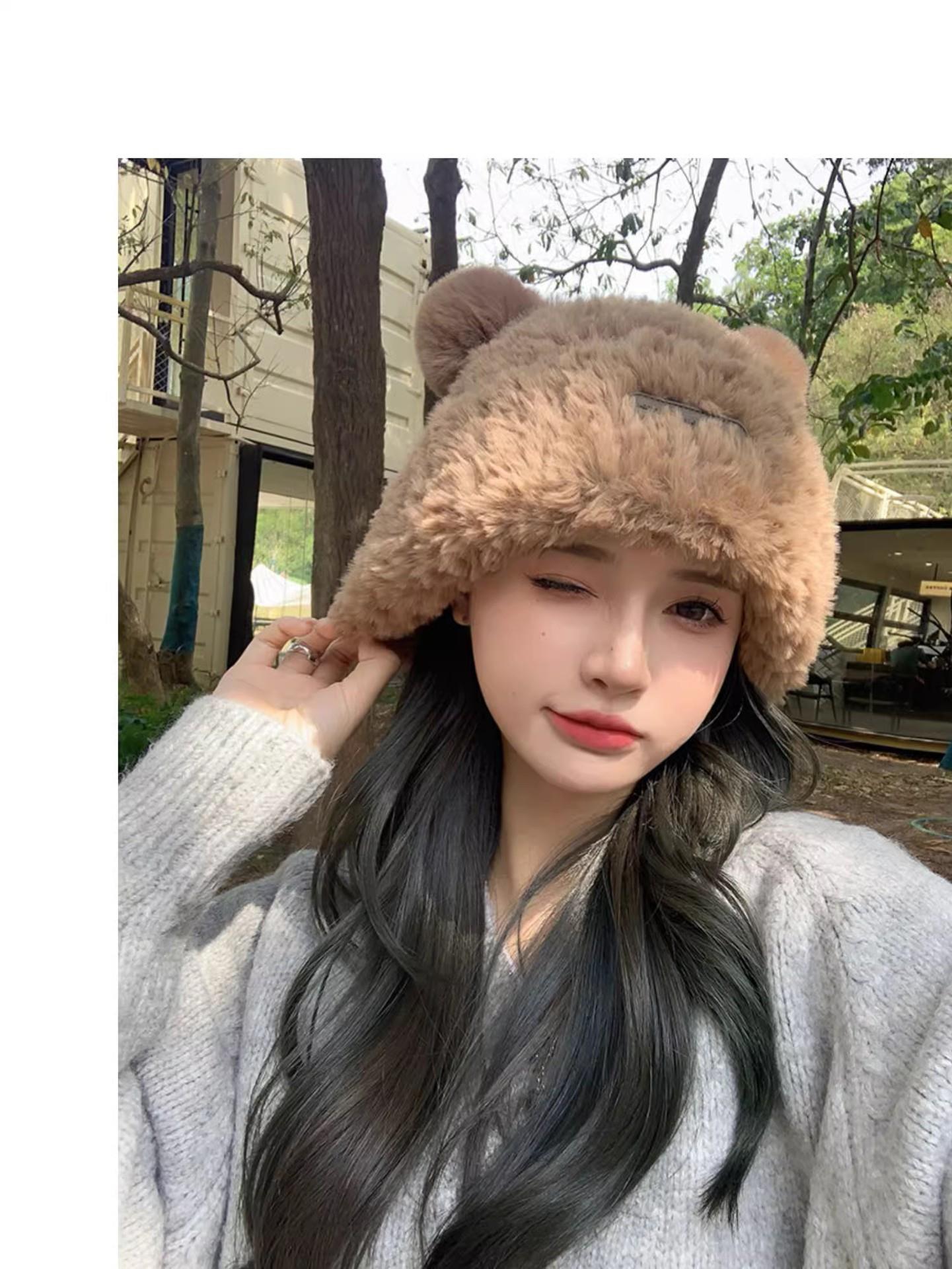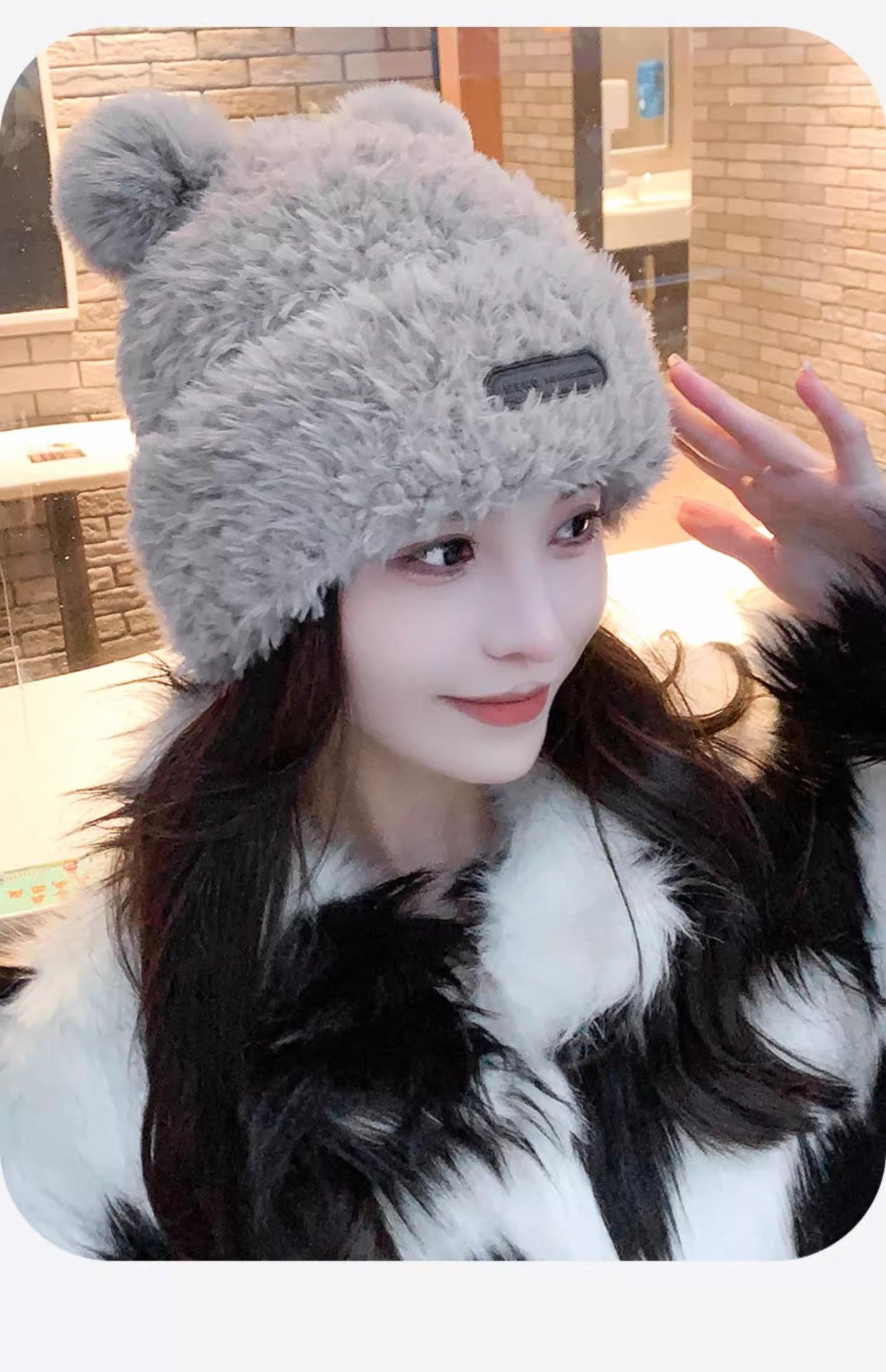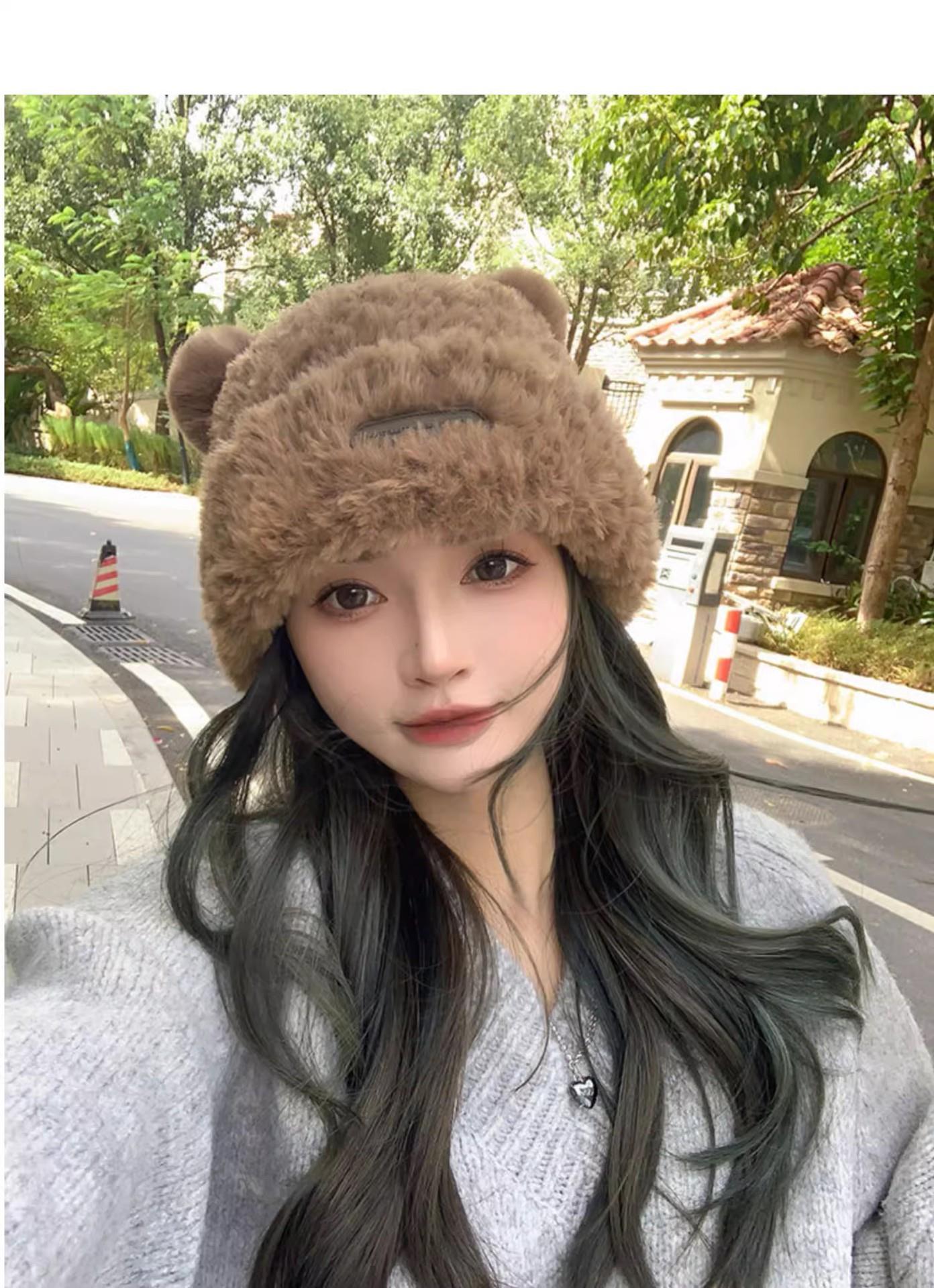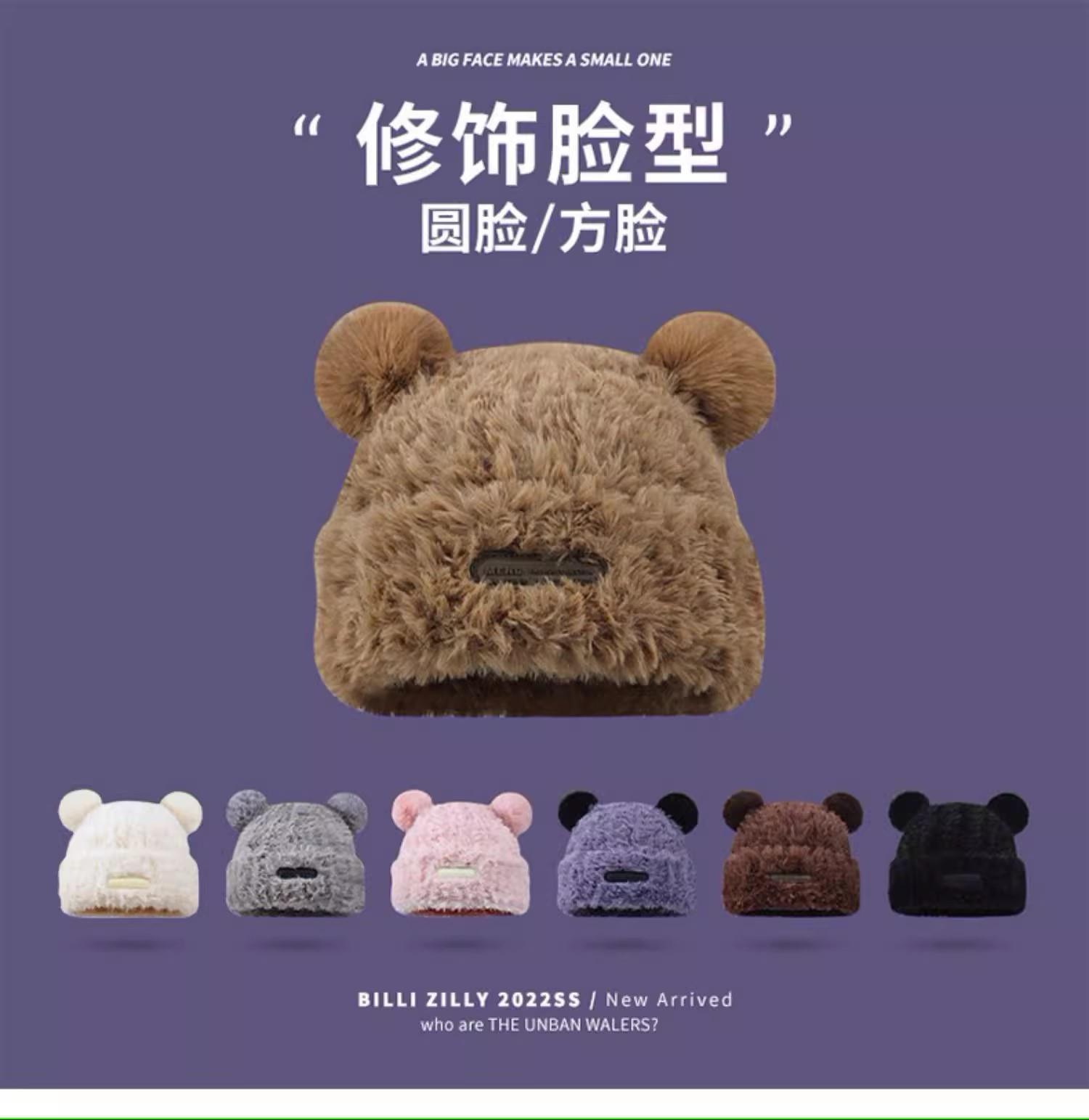 冬季新款可爱小熊毛绒帽女保暖加厚护耳帽大头围针织毛线帽子