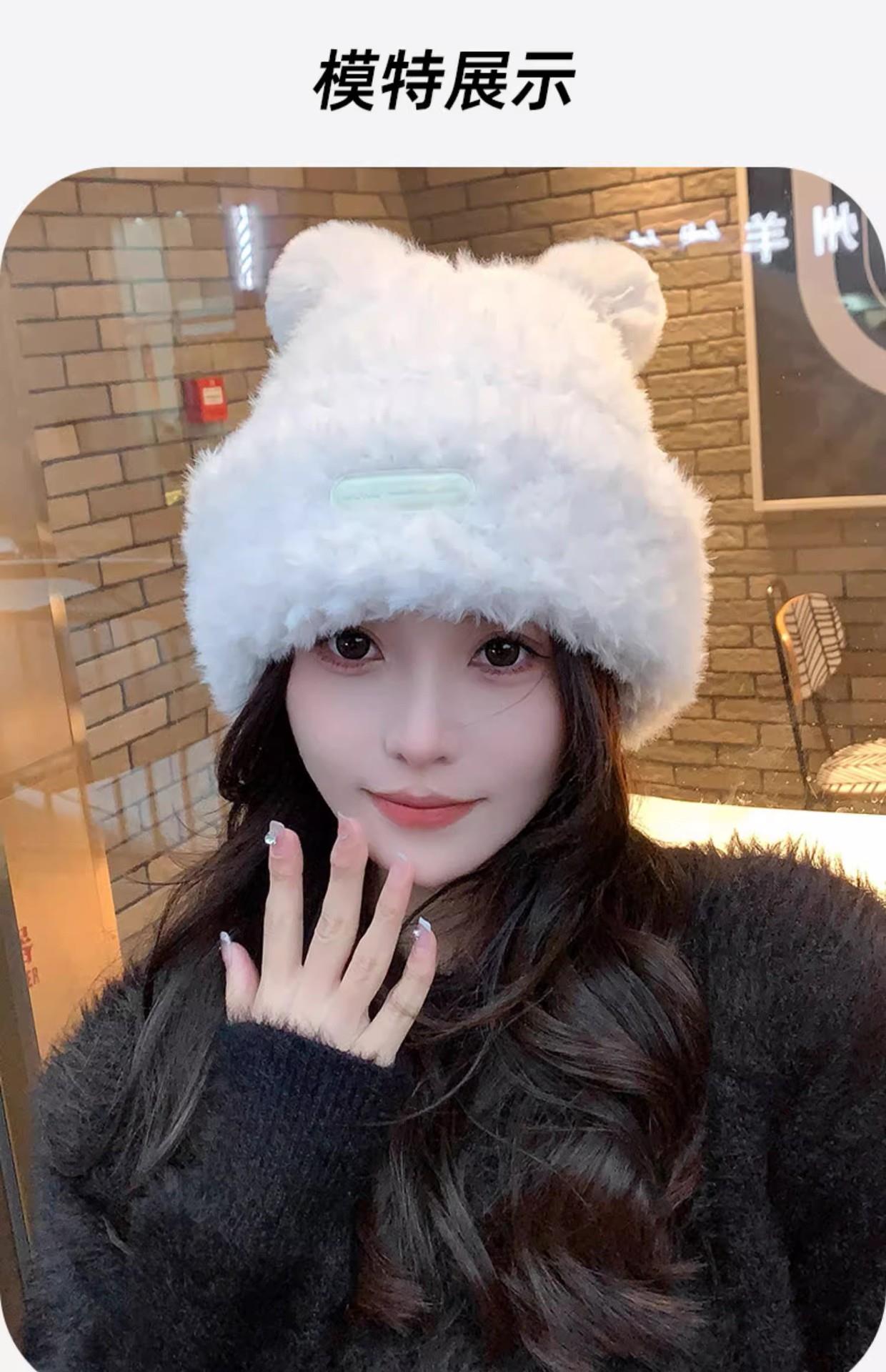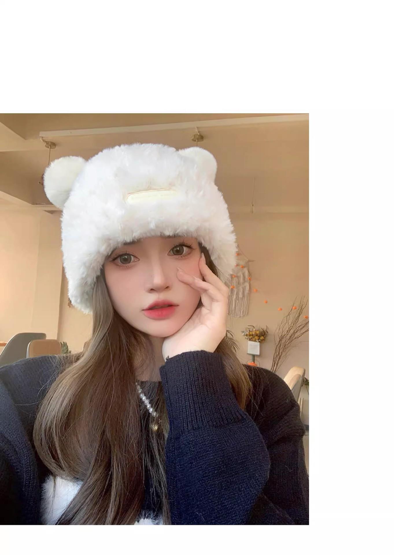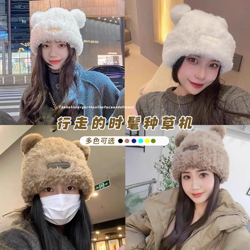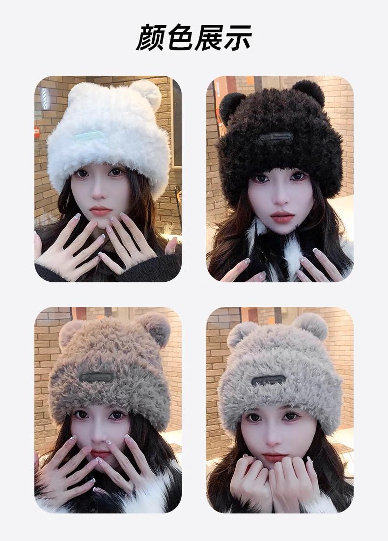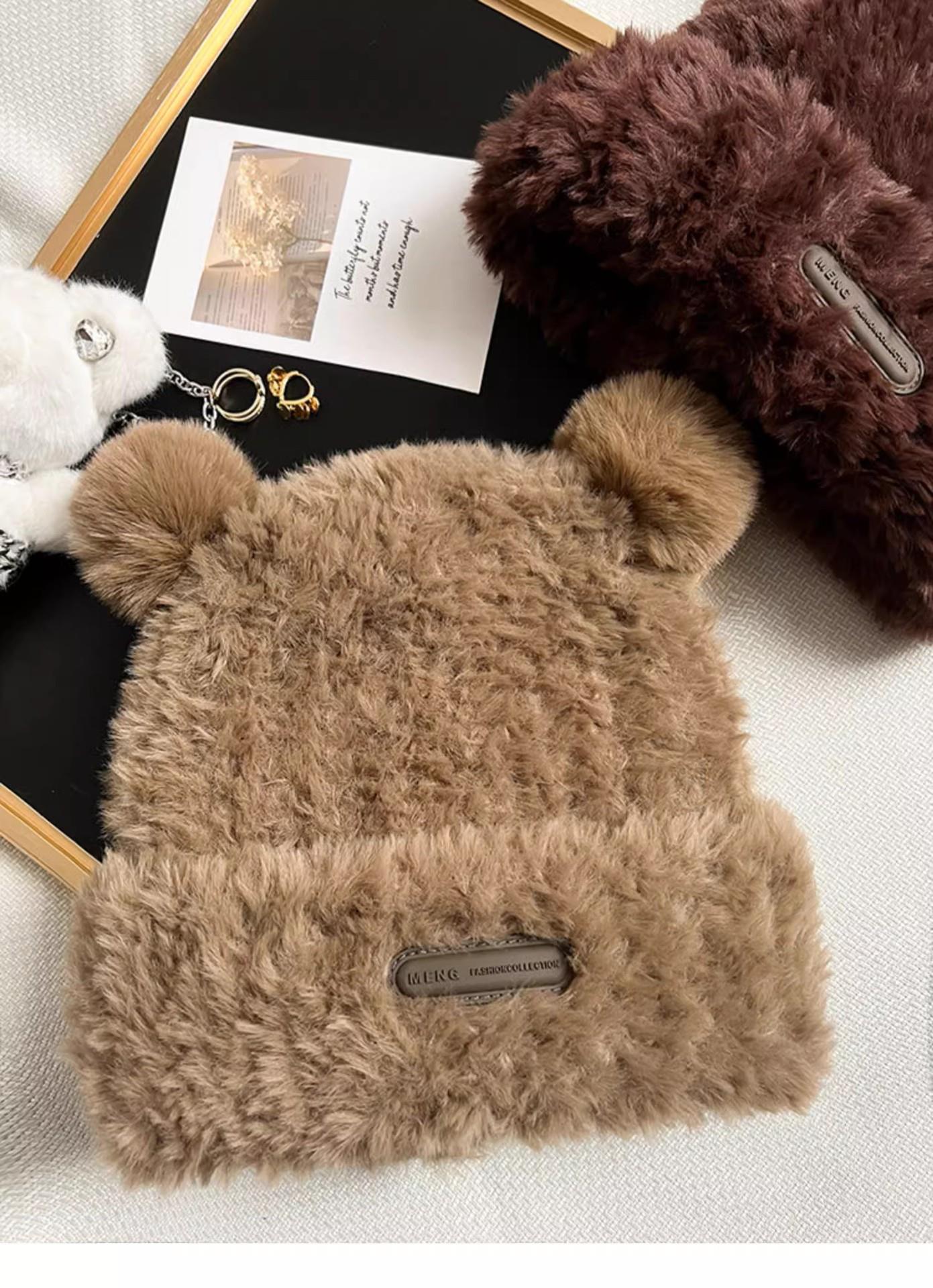 冬季新款可爱小熊毛绒帽女保暖加厚护耳帽大头围针织毛线帽子