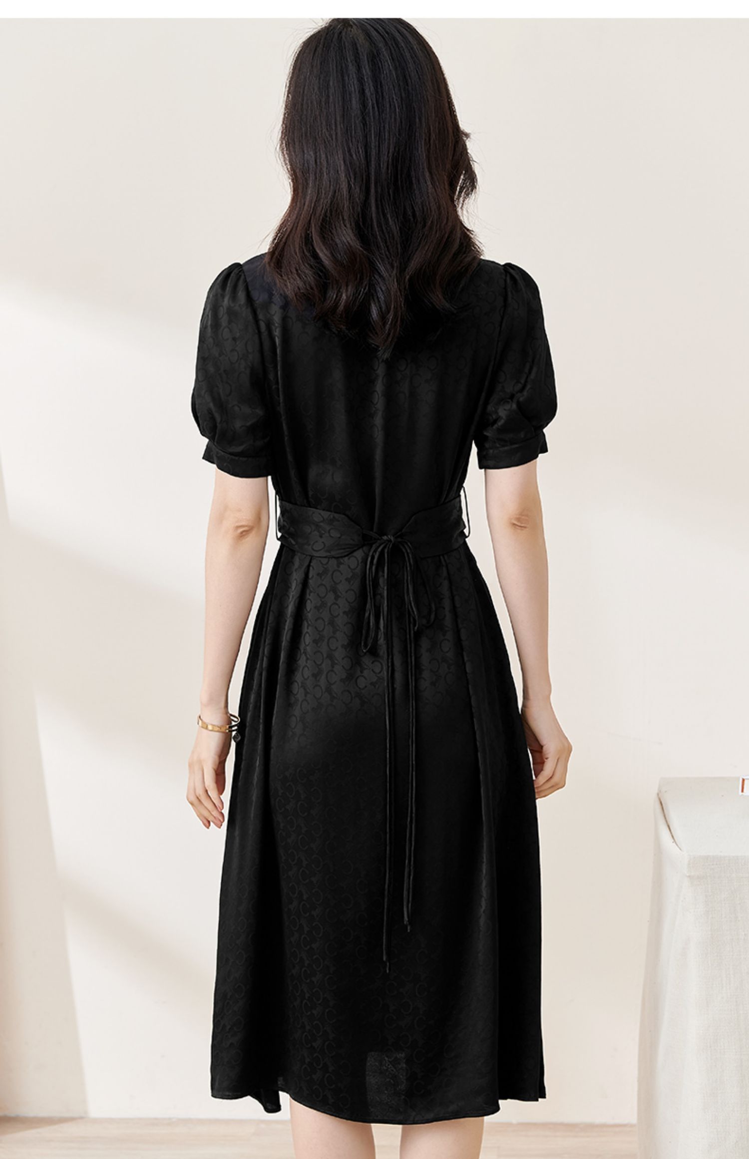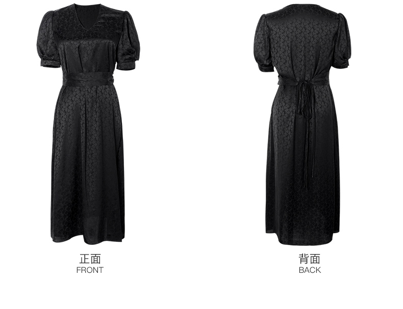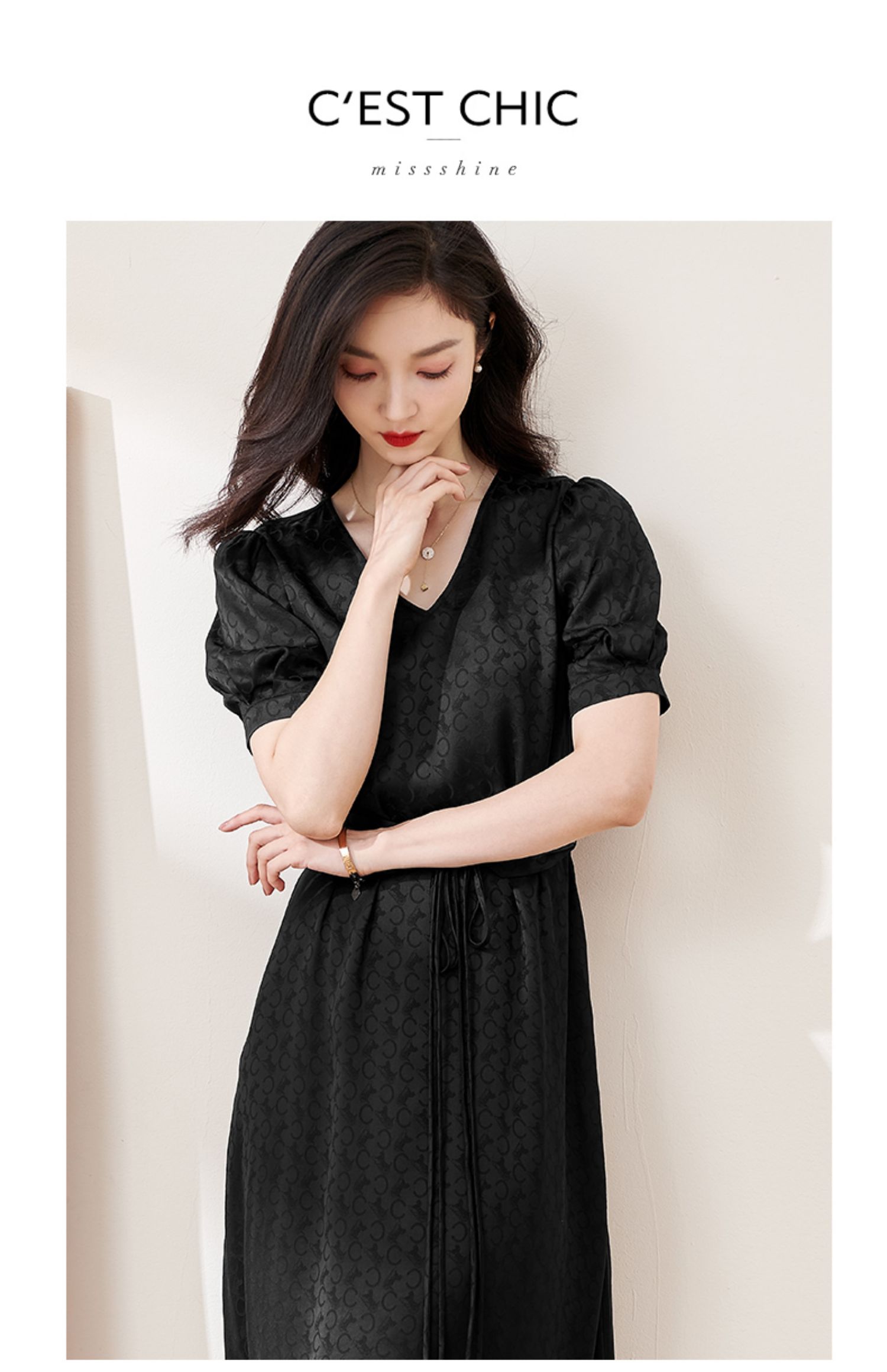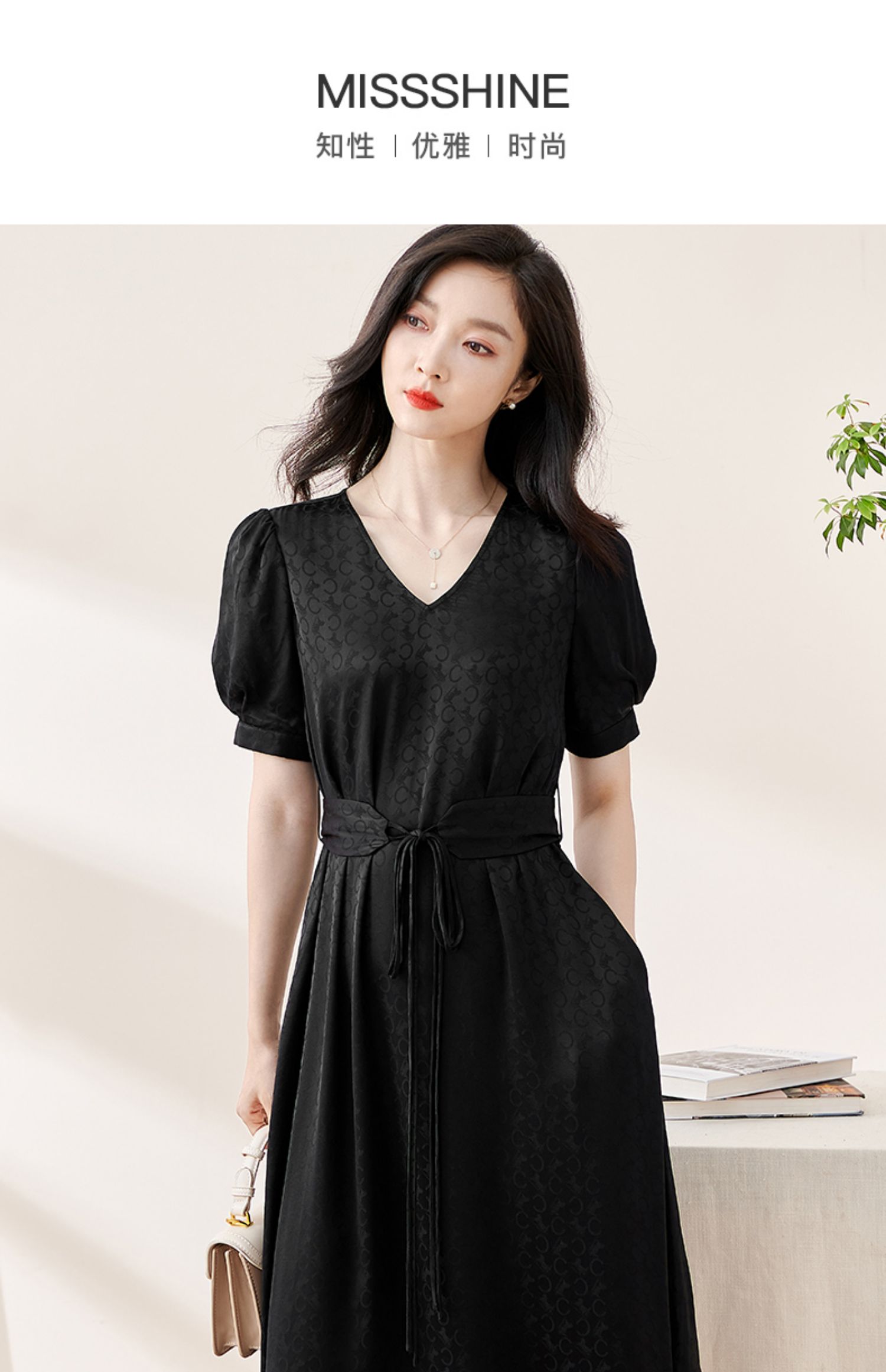剩S/M 米思阳夏季新款时尚气质优雅提花泡泡袖连衣裙黑色中长裙1908