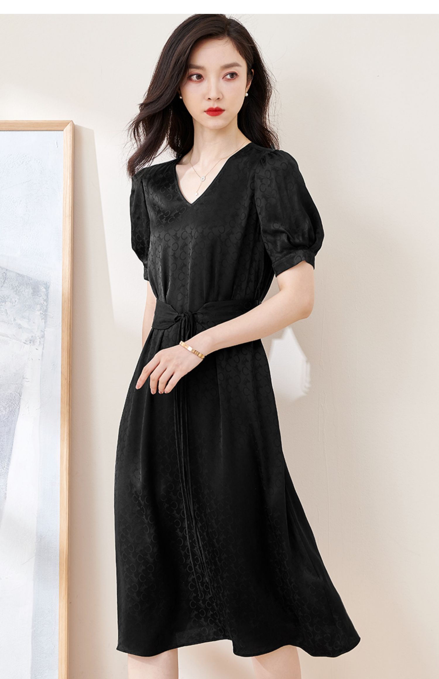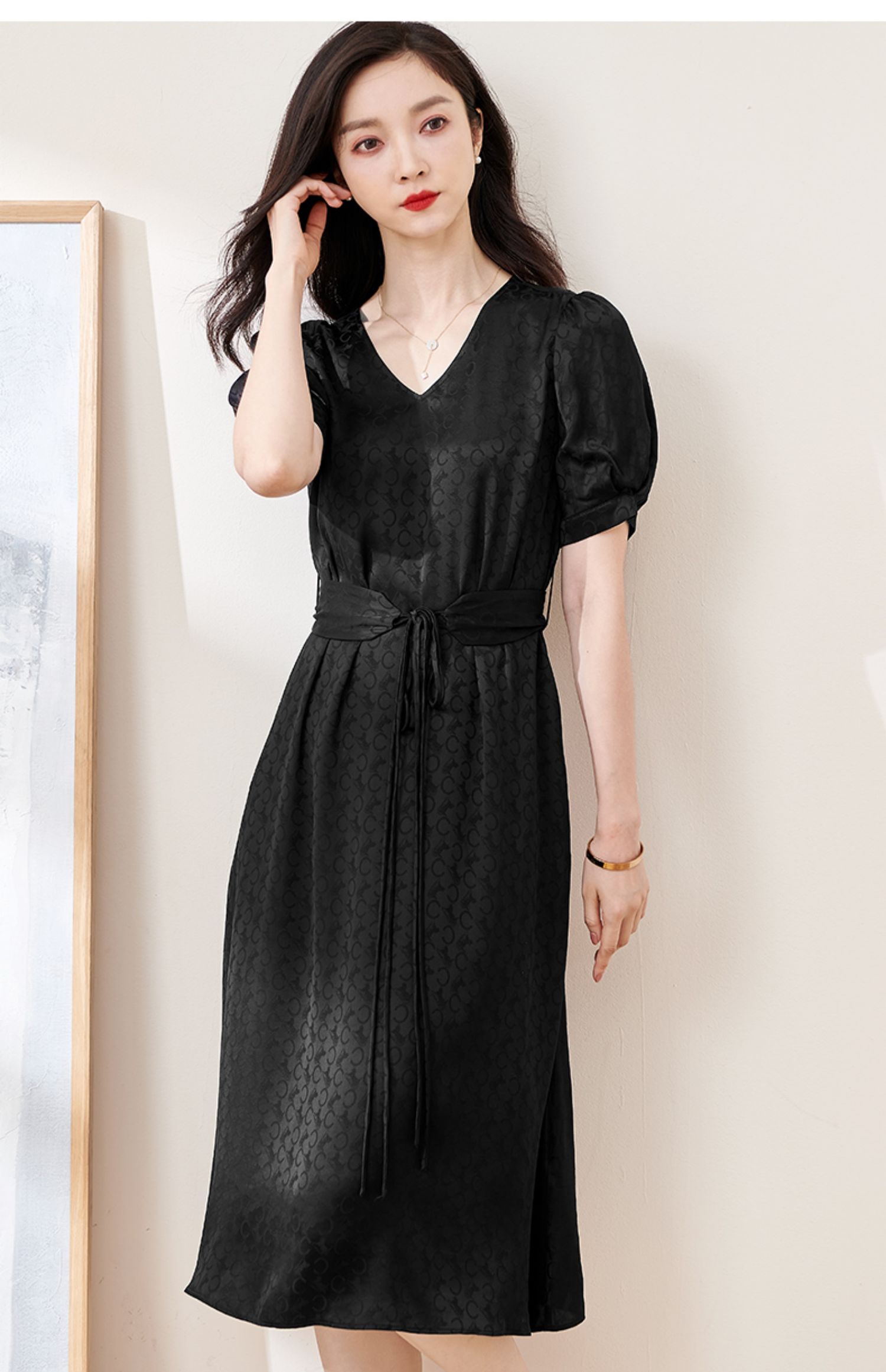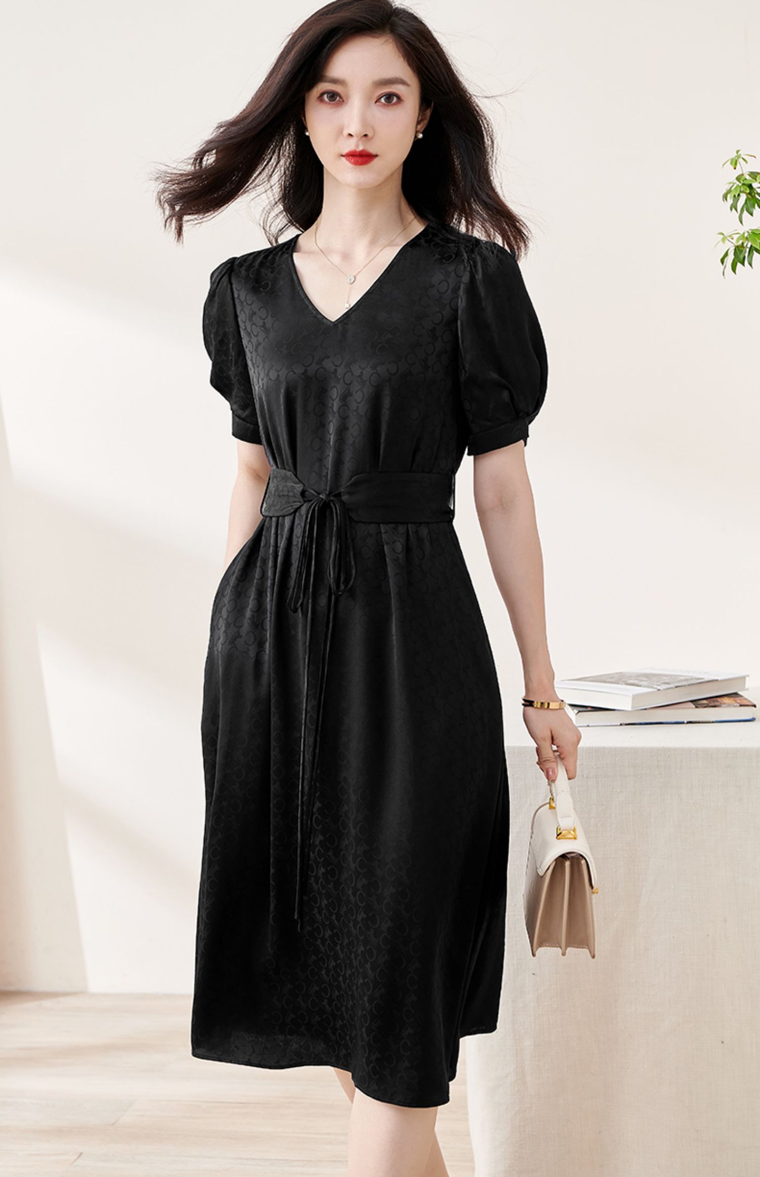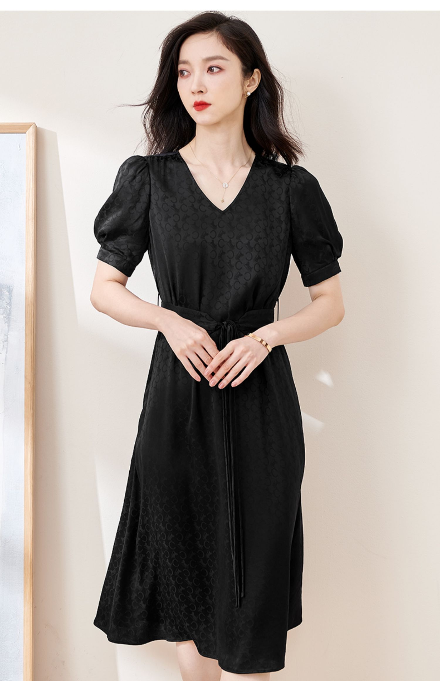 剩S/M 米思阳夏季新款时尚气质优雅提花泡泡袖连衣裙黑色中长裙1908