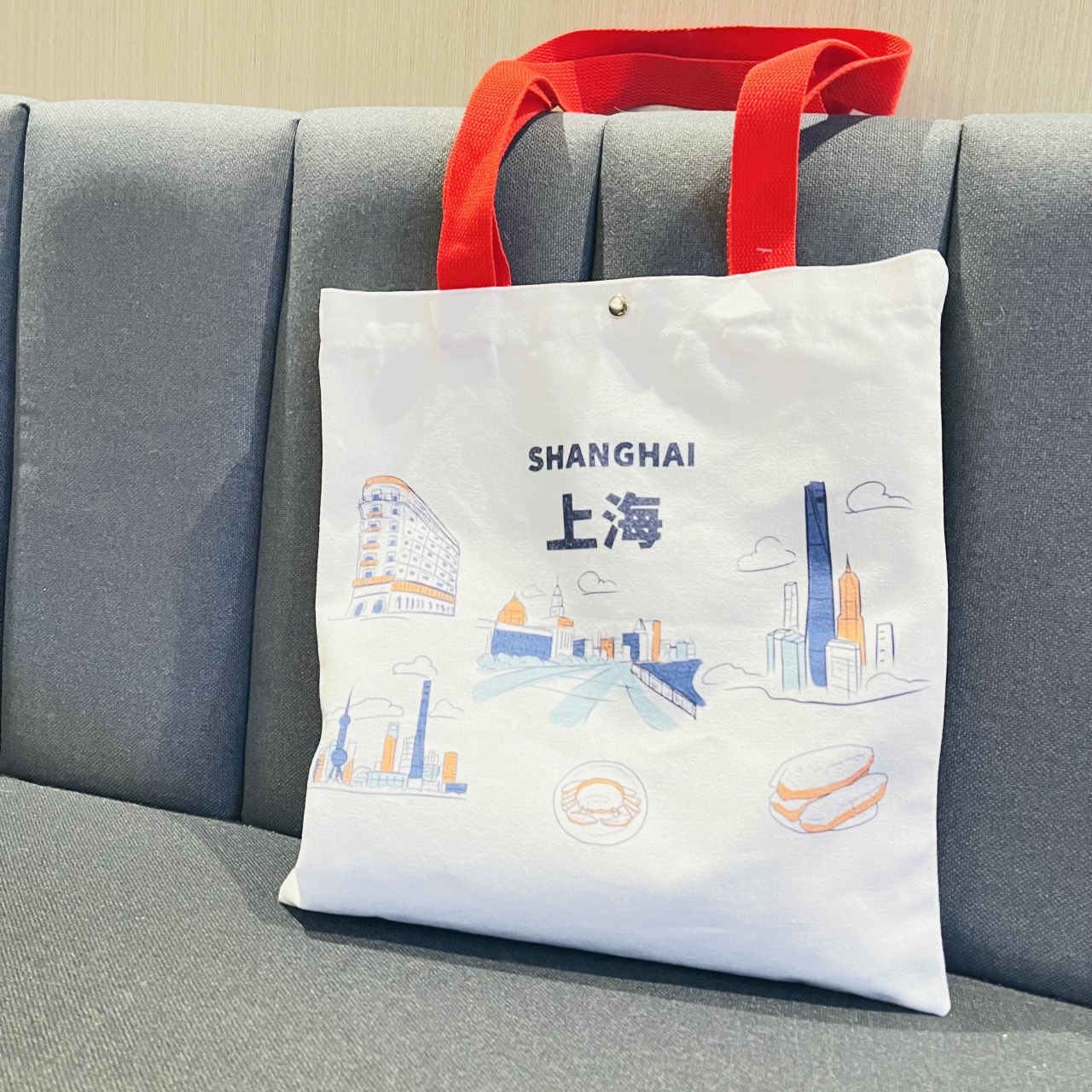 一面印有上海中英文字样及城市地标景点
