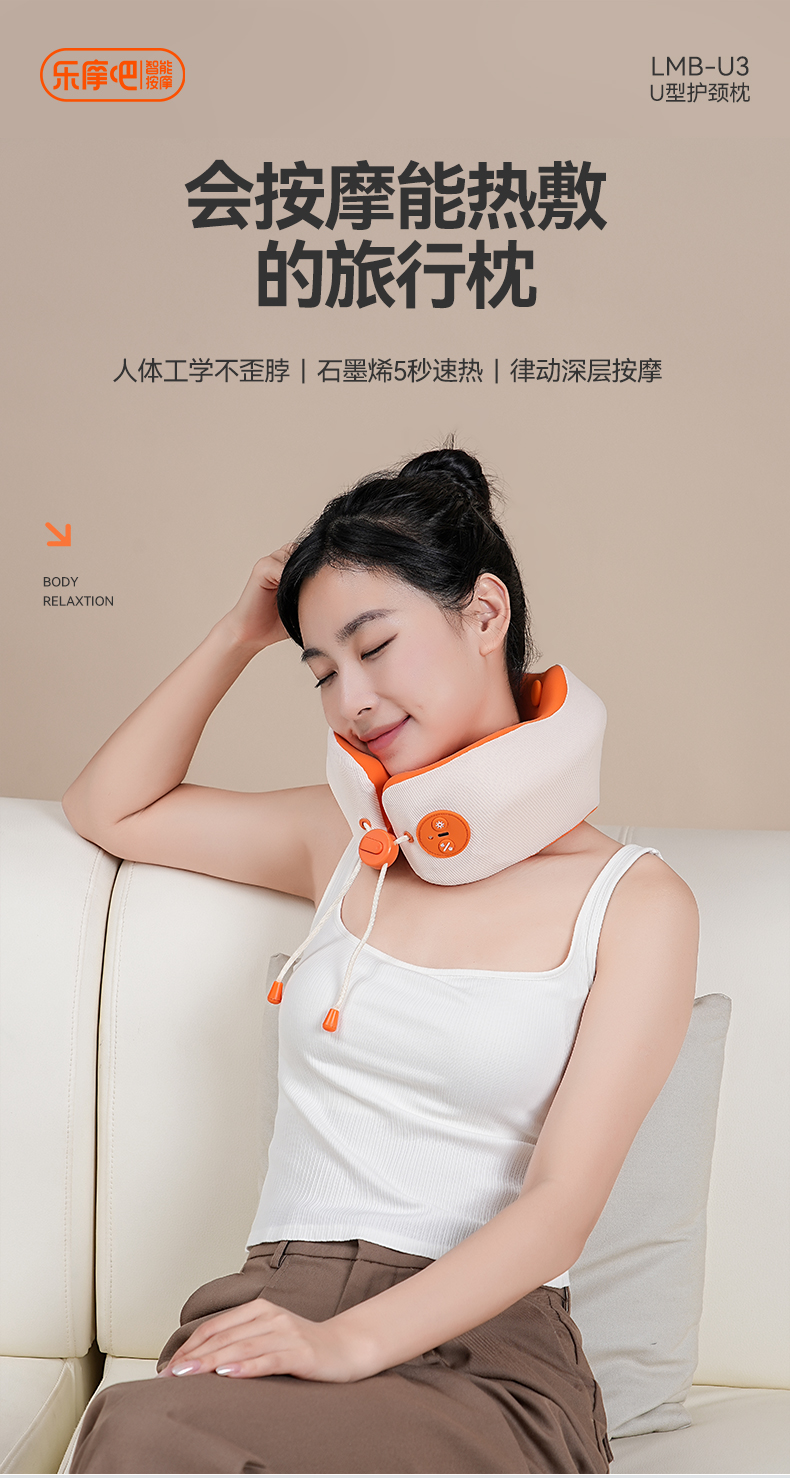 【会按摩能热敷的旅行枕】乐摩吧U型护颈枕 人体工学360°护颈支撑不歪脖 石墨烯5秒速热 深层按摩放松 缓解颈部肌肉酸痛 长久续航,无线携带