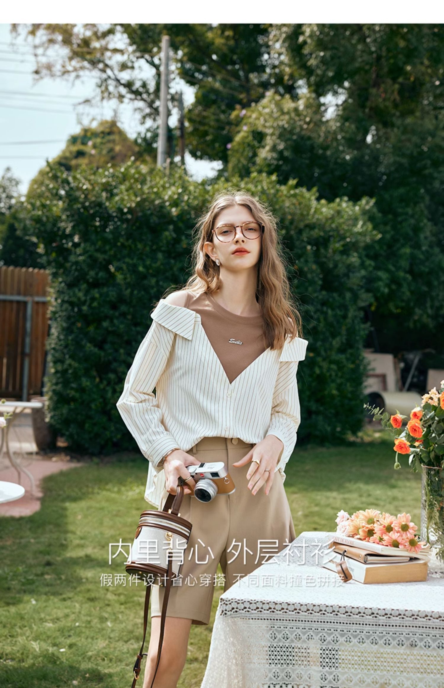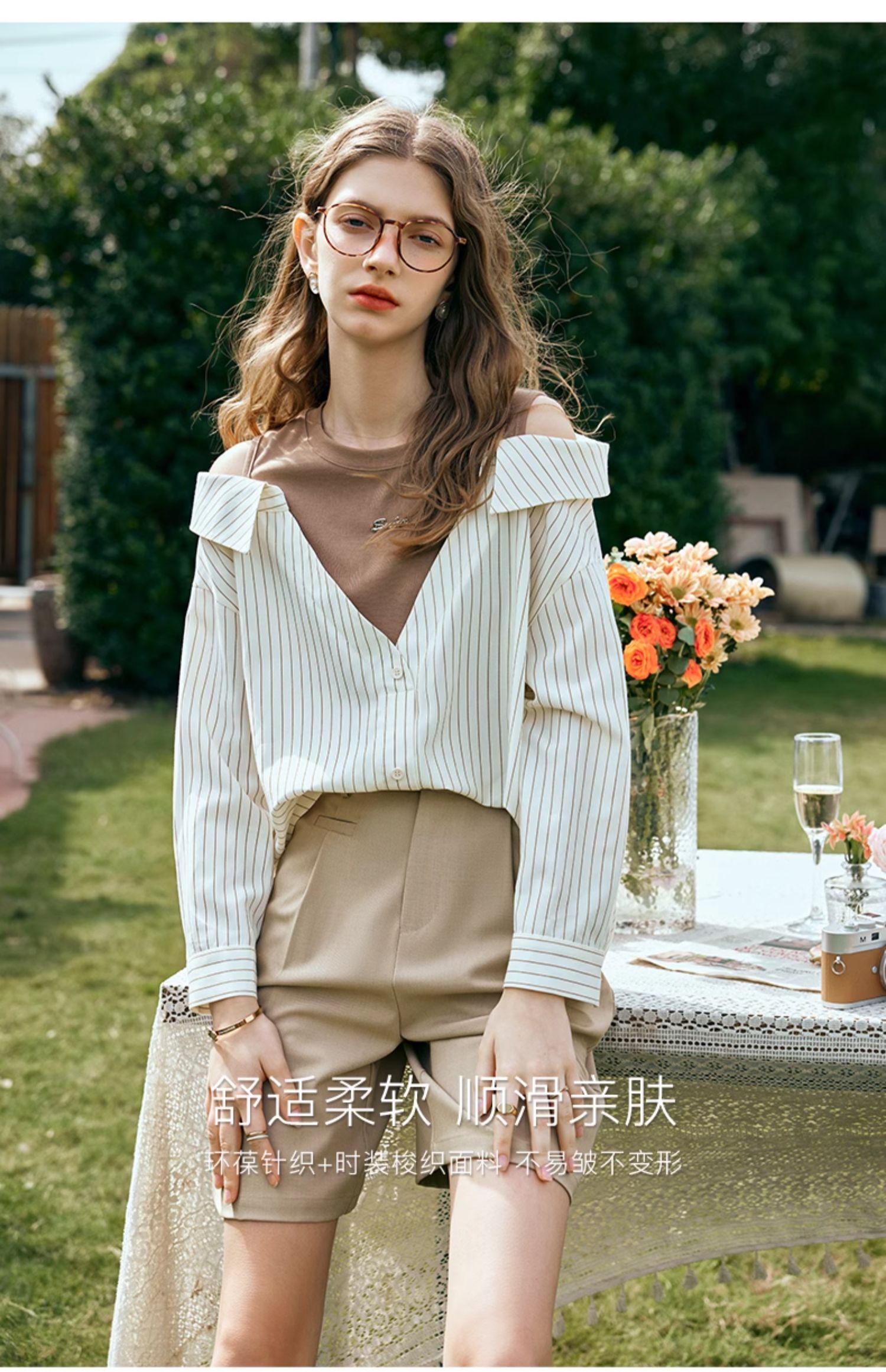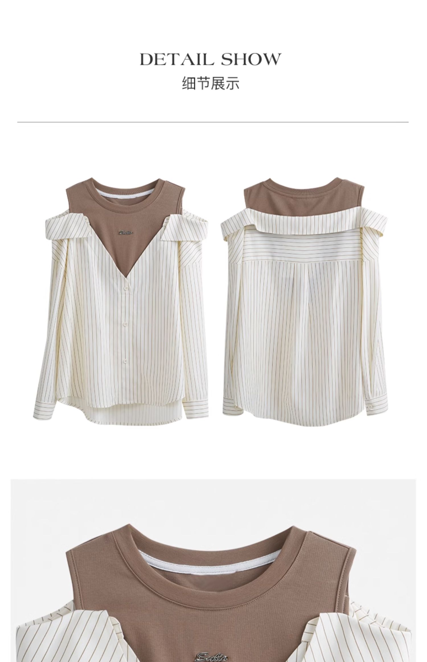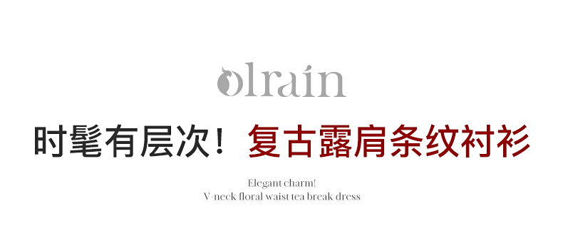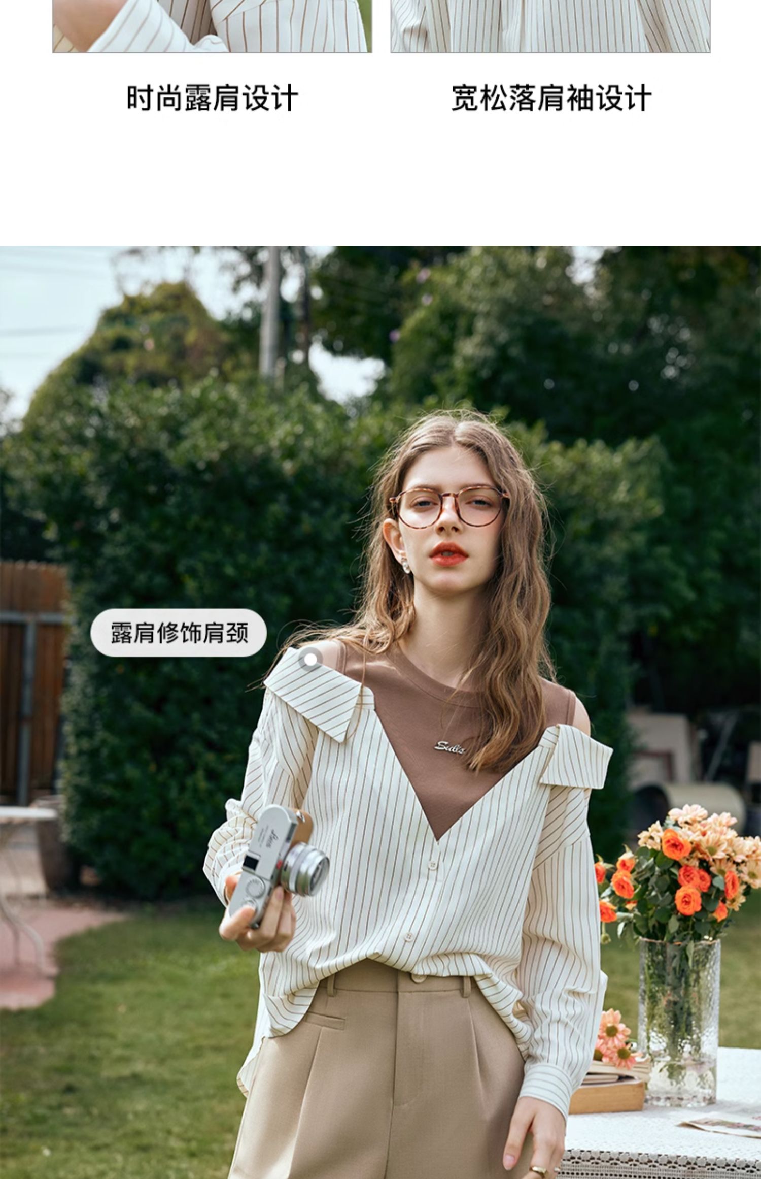 OLrain欧芮儿条纹V领衬衫女早春2024新款复古露肩长袖假两件上衣