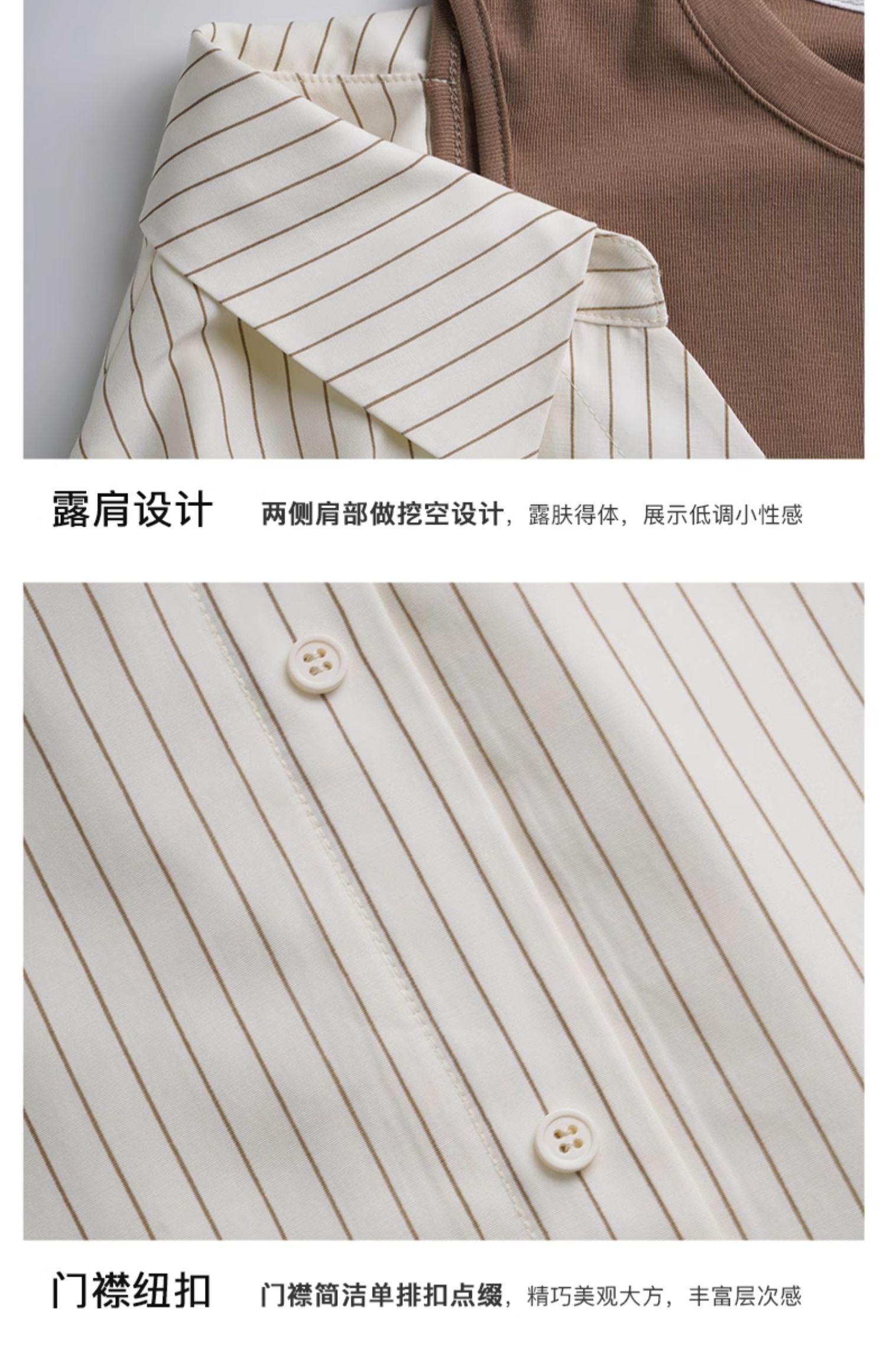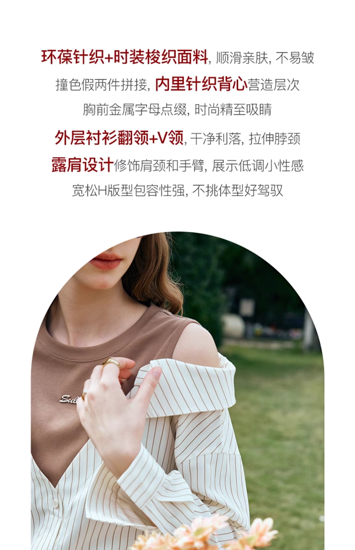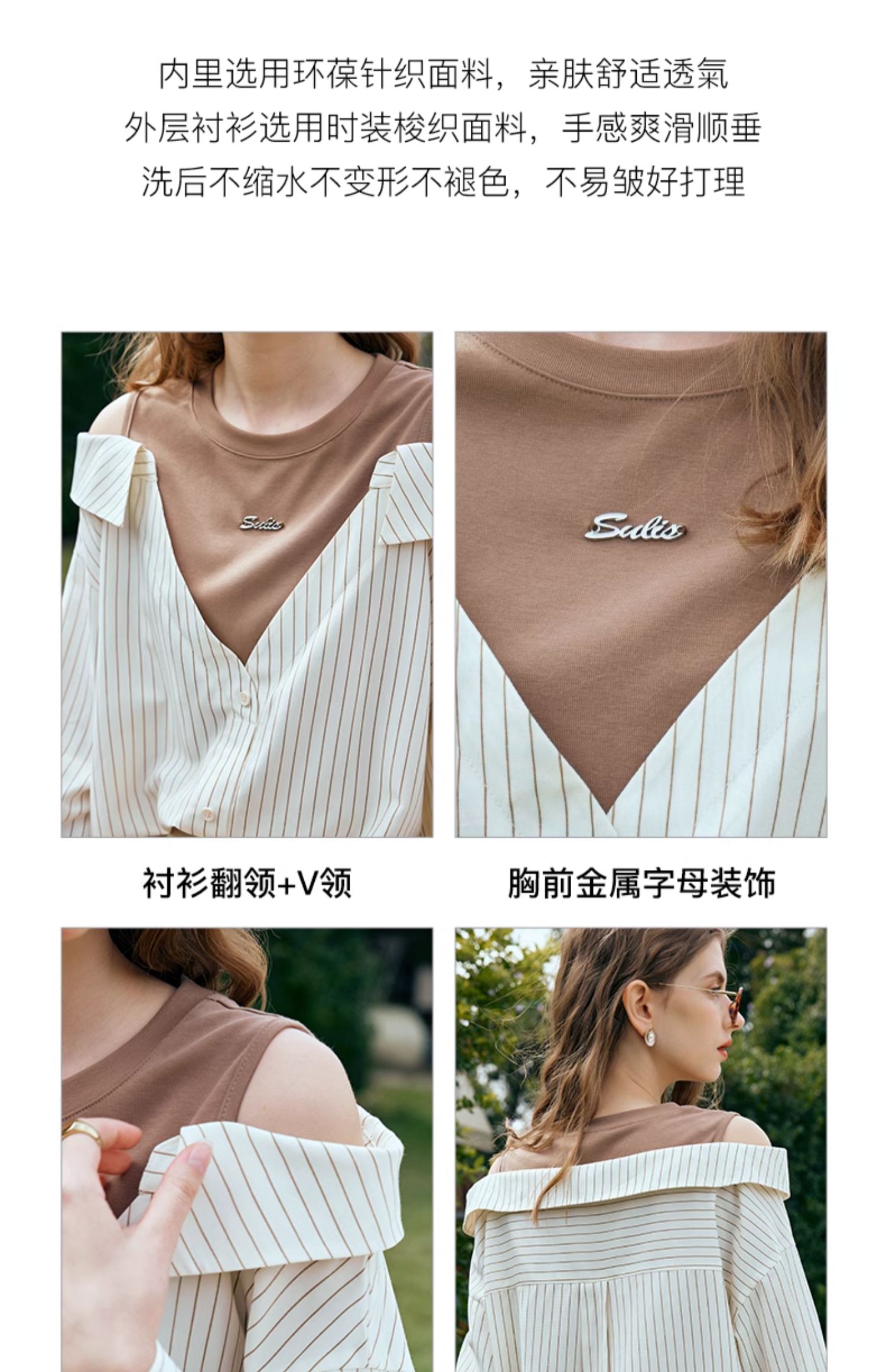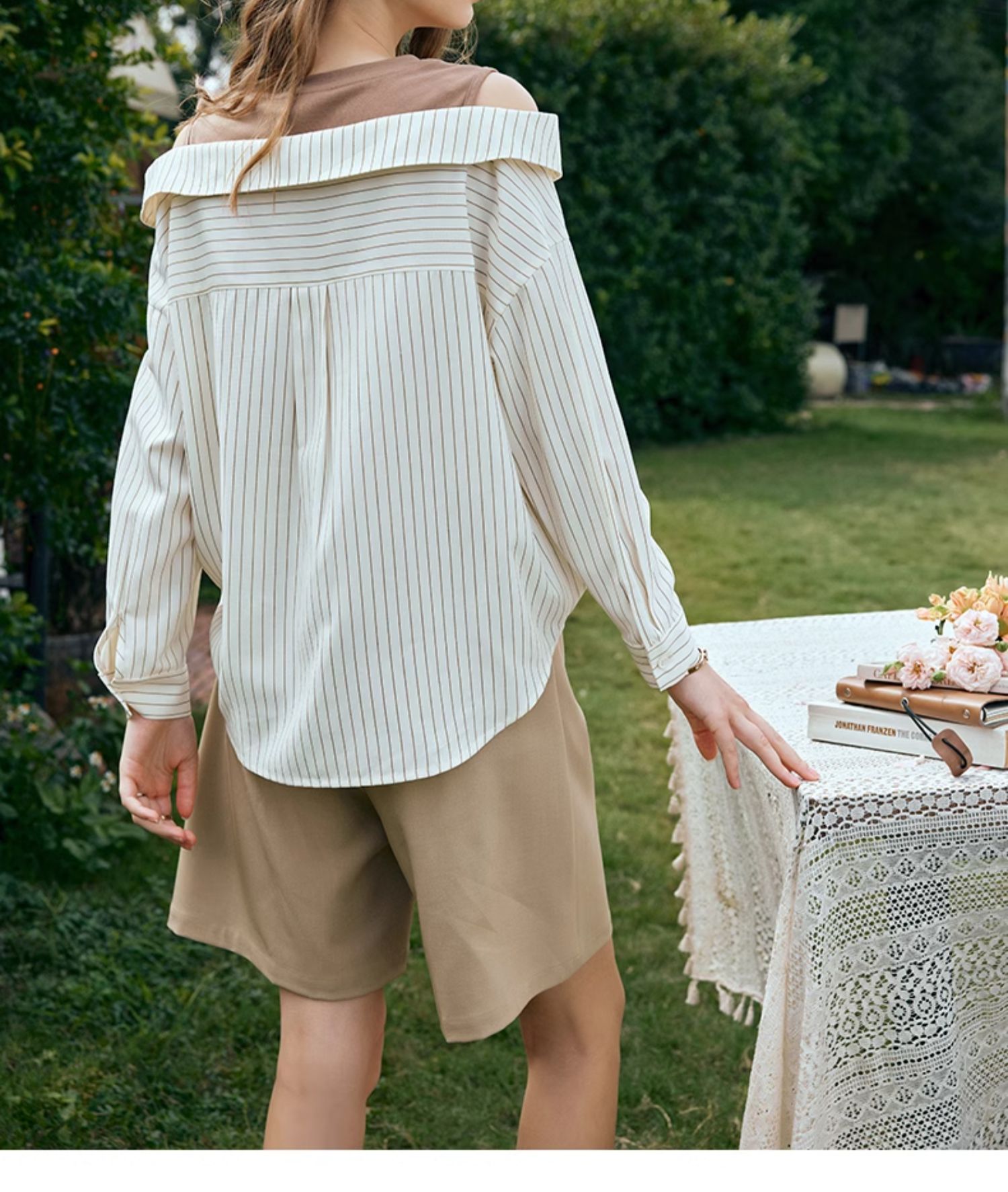 OLrain欧芮儿条纹V领衬衫女早春2024新款复古露肩长袖假两件上衣