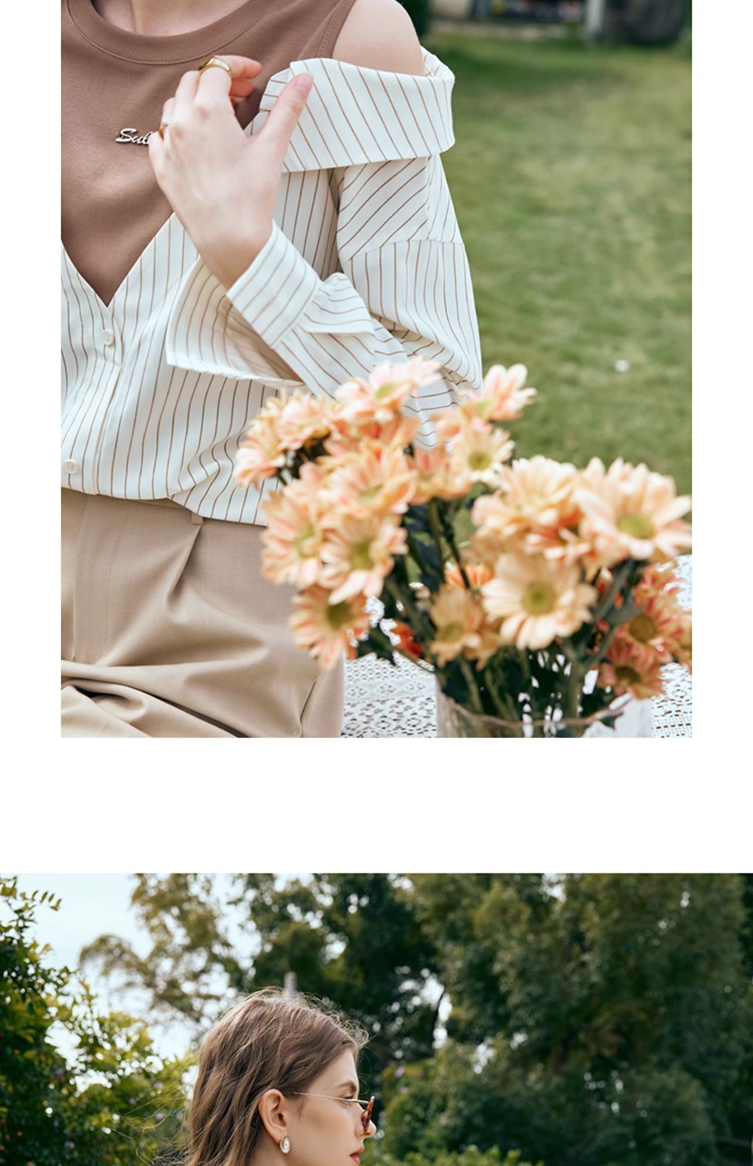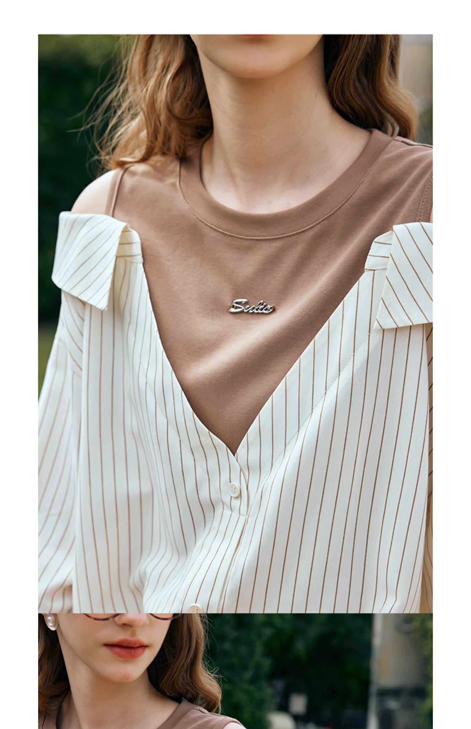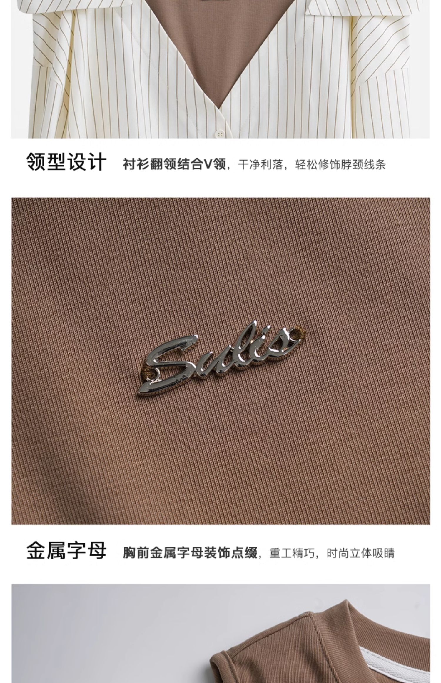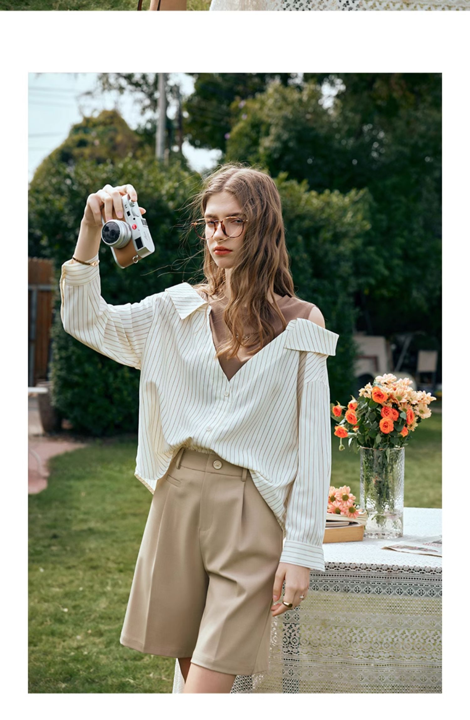 OLrain欧芮儿条纹V领衬衫女早春2024新款复古露肩长袖假两件上衣