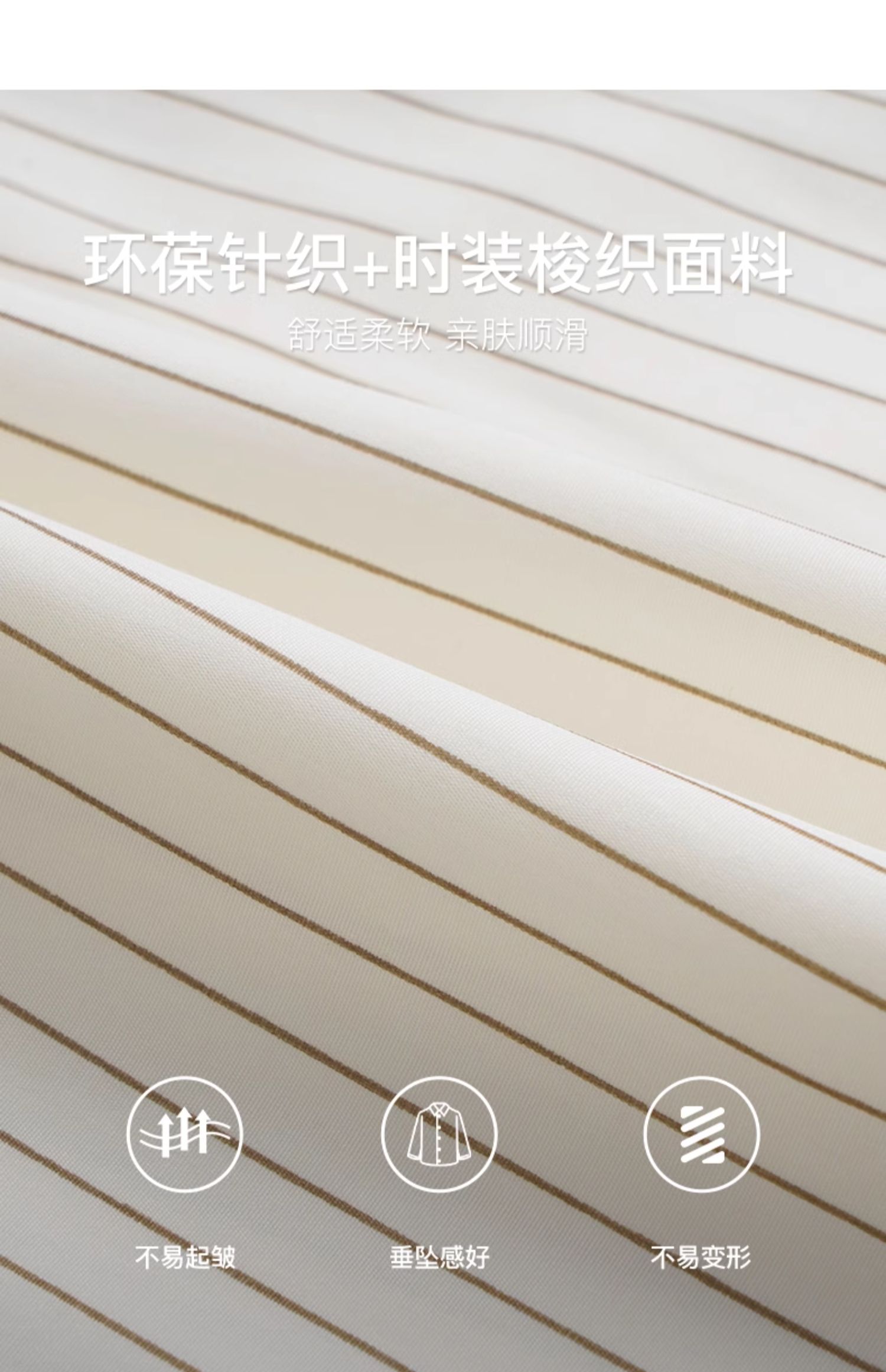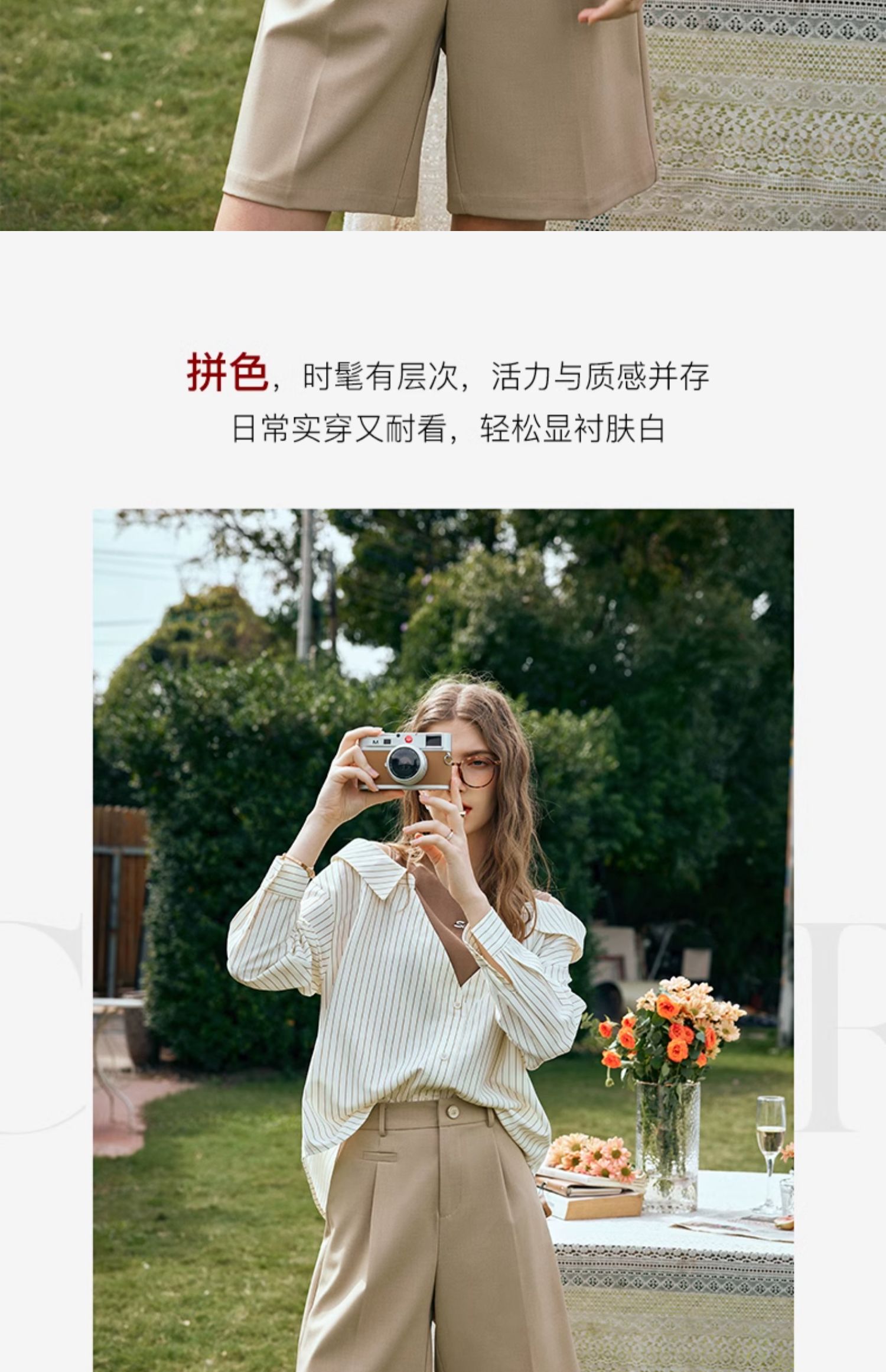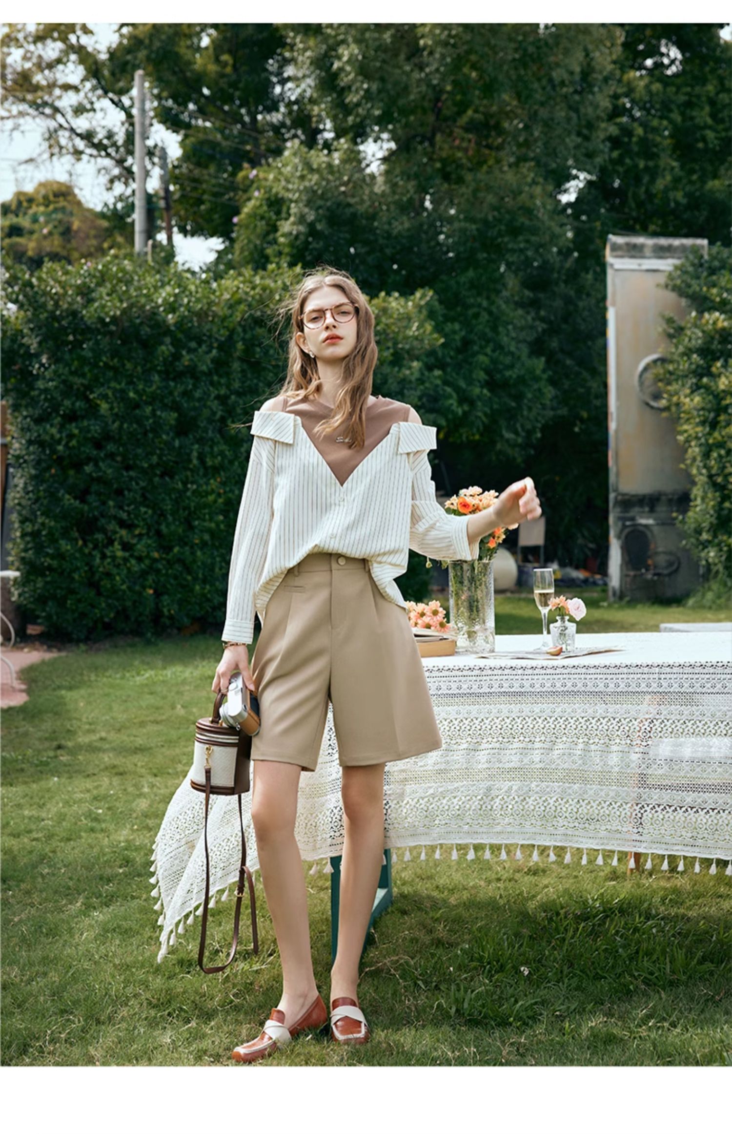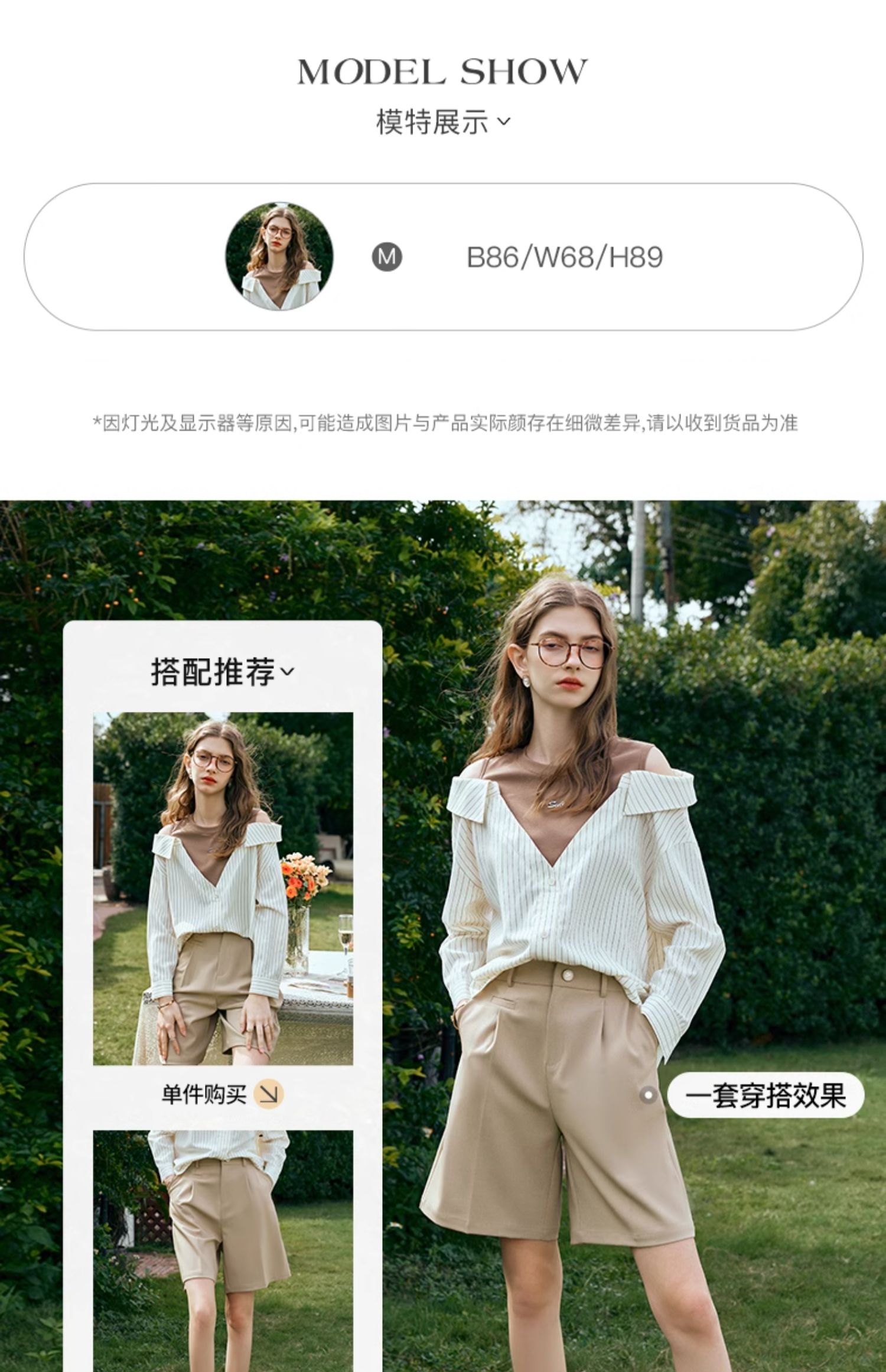 OLrain欧芮儿条纹V领衬衫女早春2024新款复古露肩长袖假两件上衣
