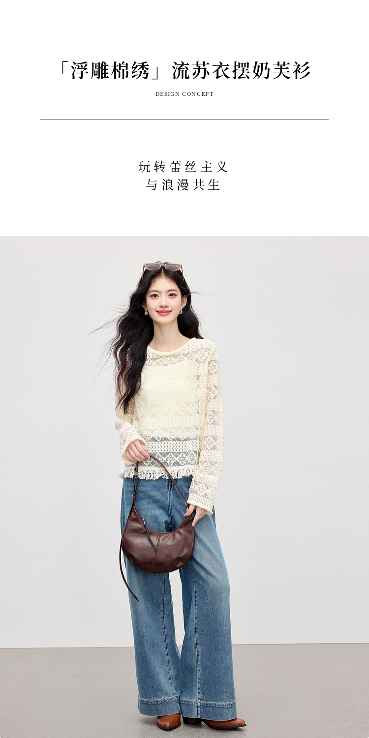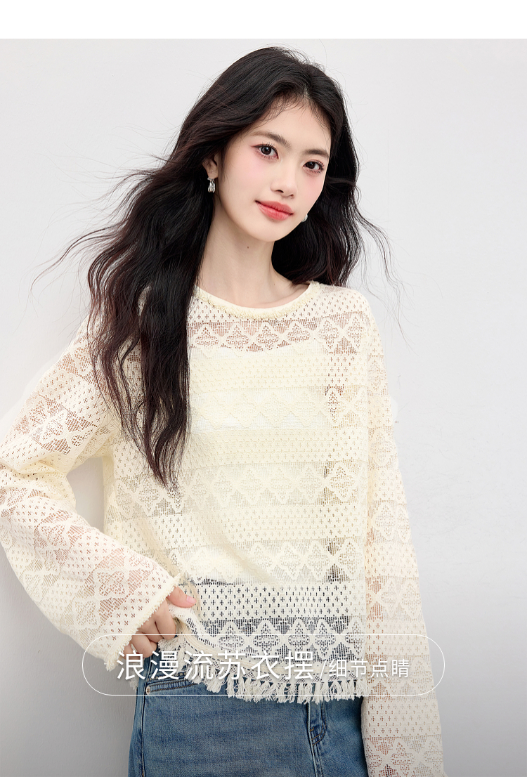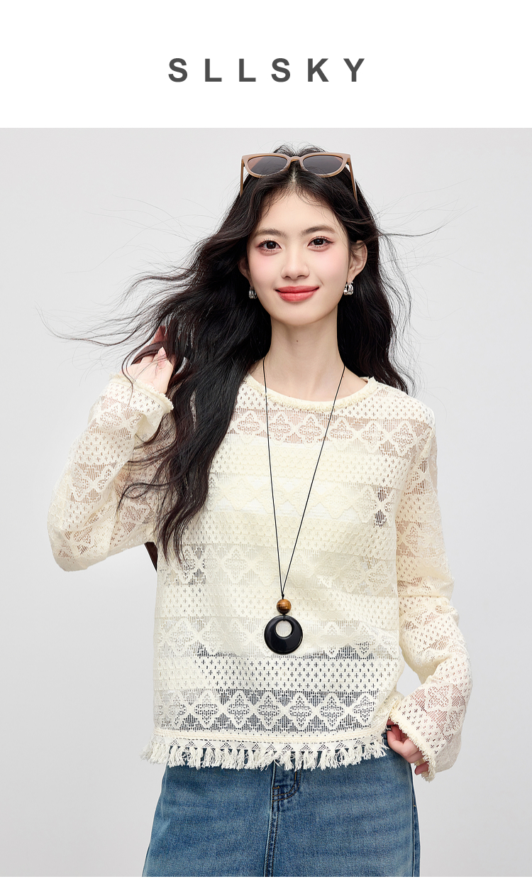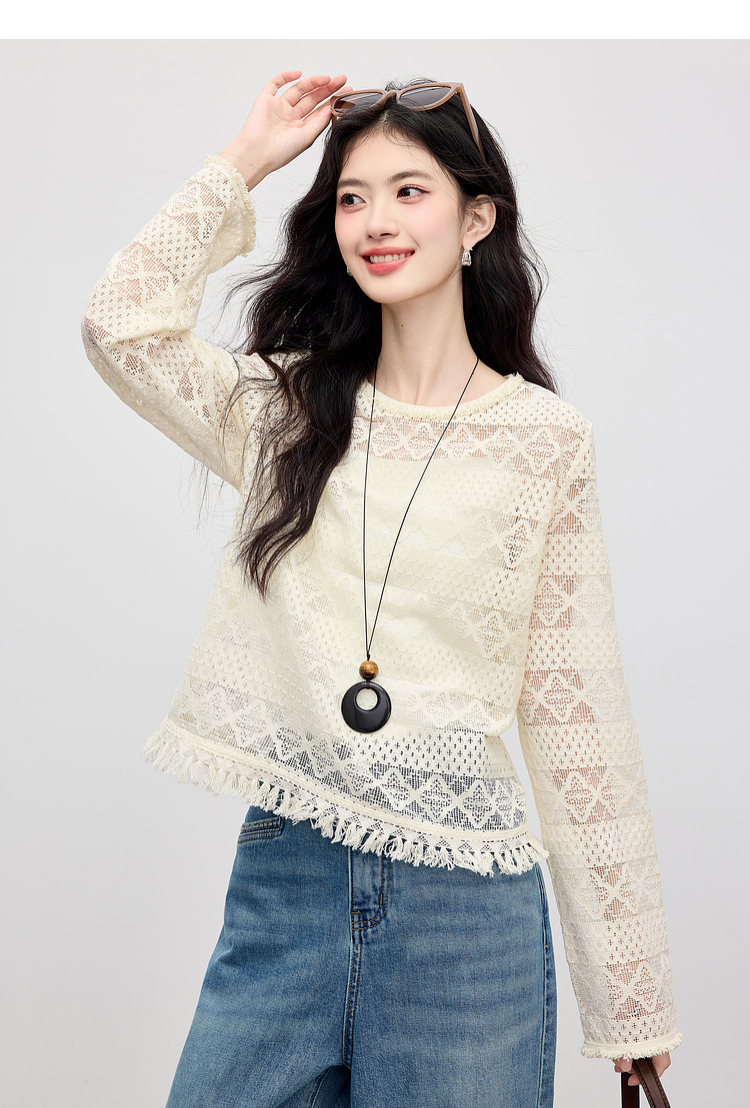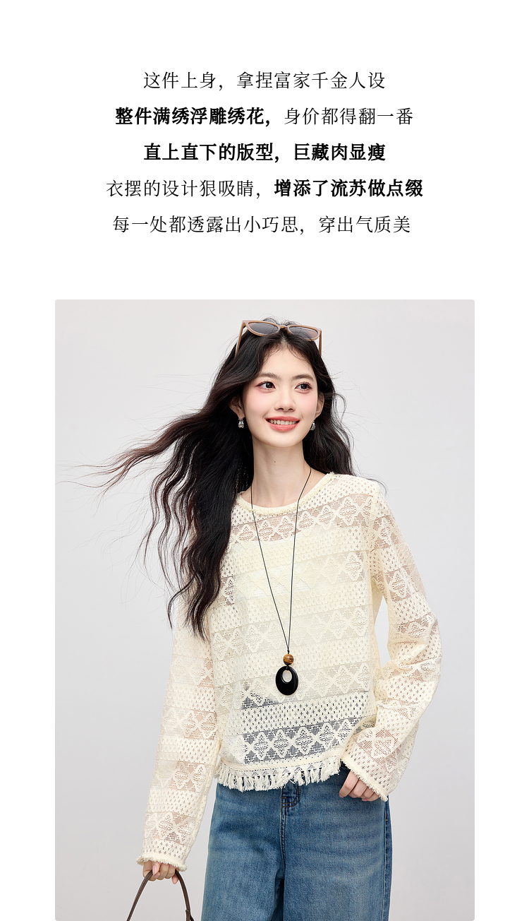 【08/06新品】熙世界波嬉风钩花镂空蕾丝罩衫长袖早秋新款休闲度假流苏圆领上衣