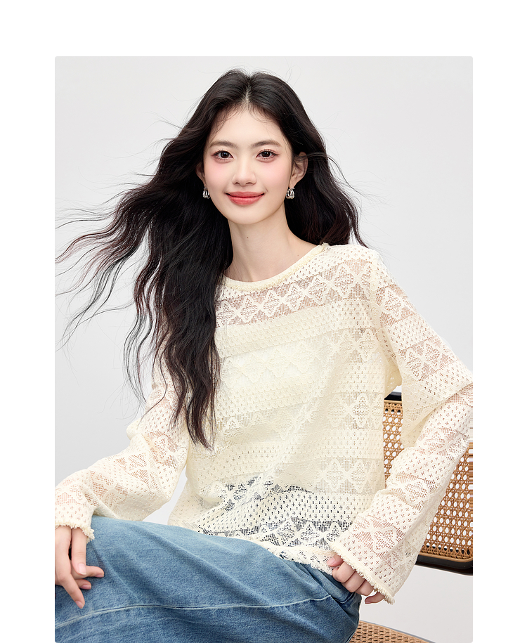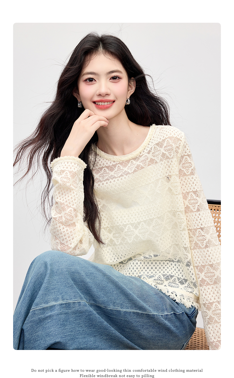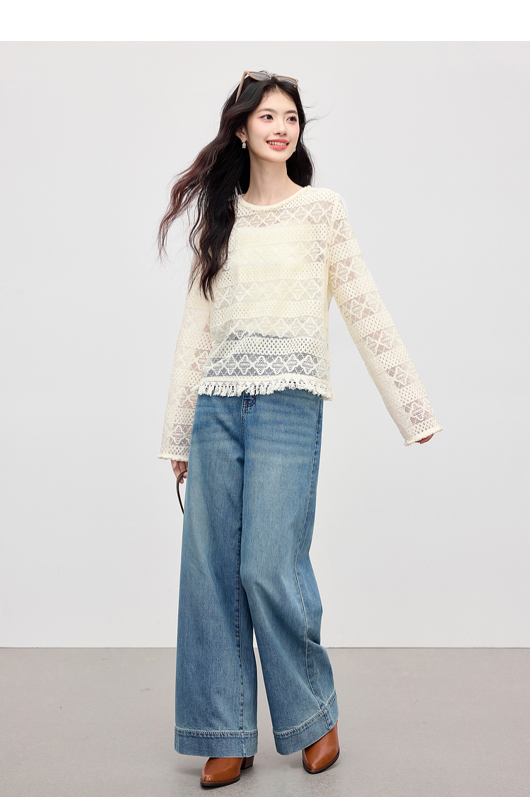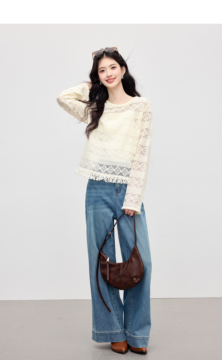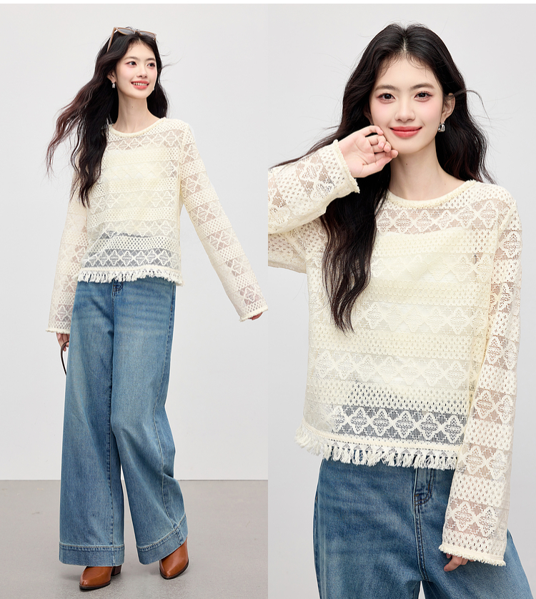 【08/06新品】熙世界波嬉风钩花镂空蕾丝罩衫长袖早秋新款休闲度假流苏圆领上衣